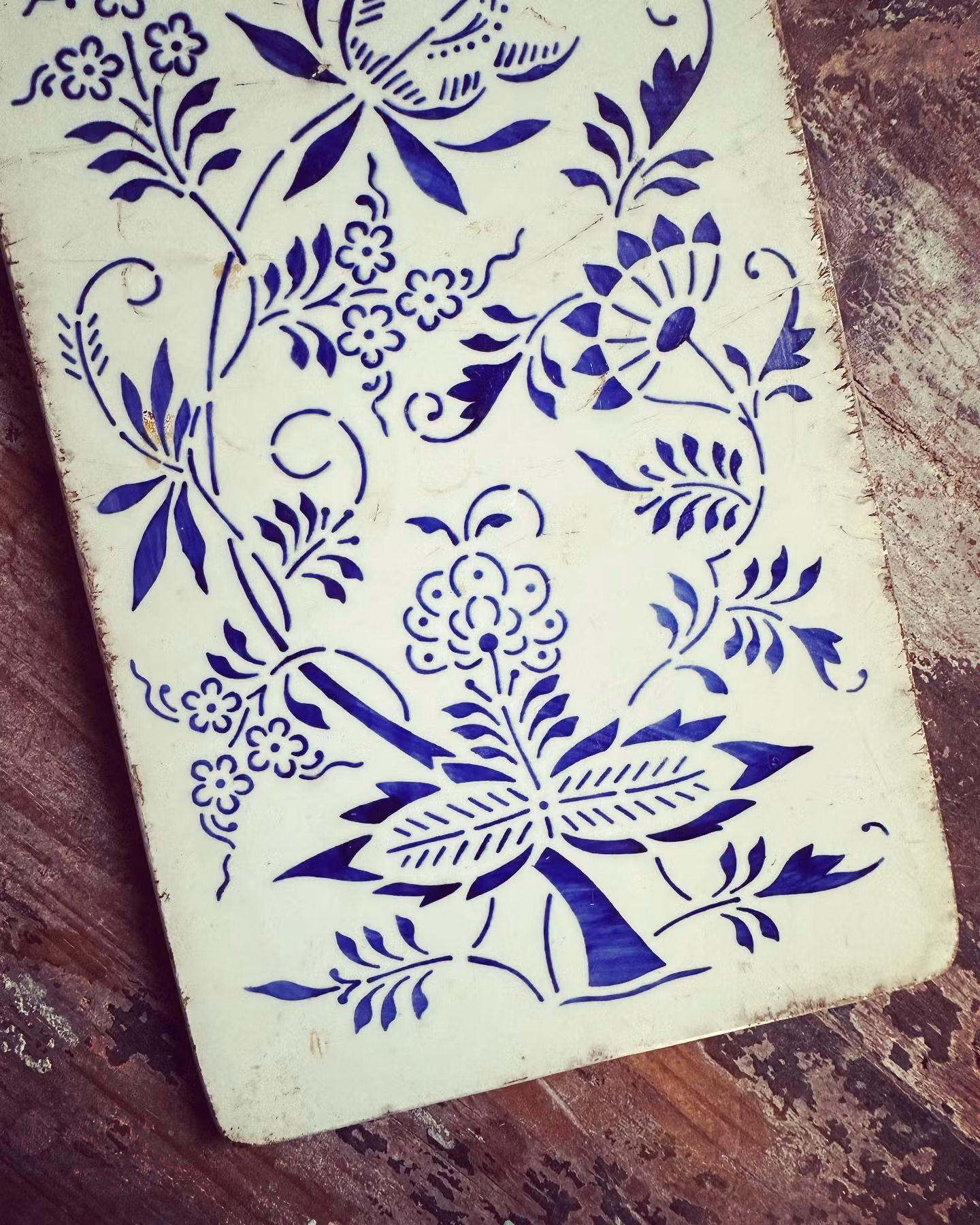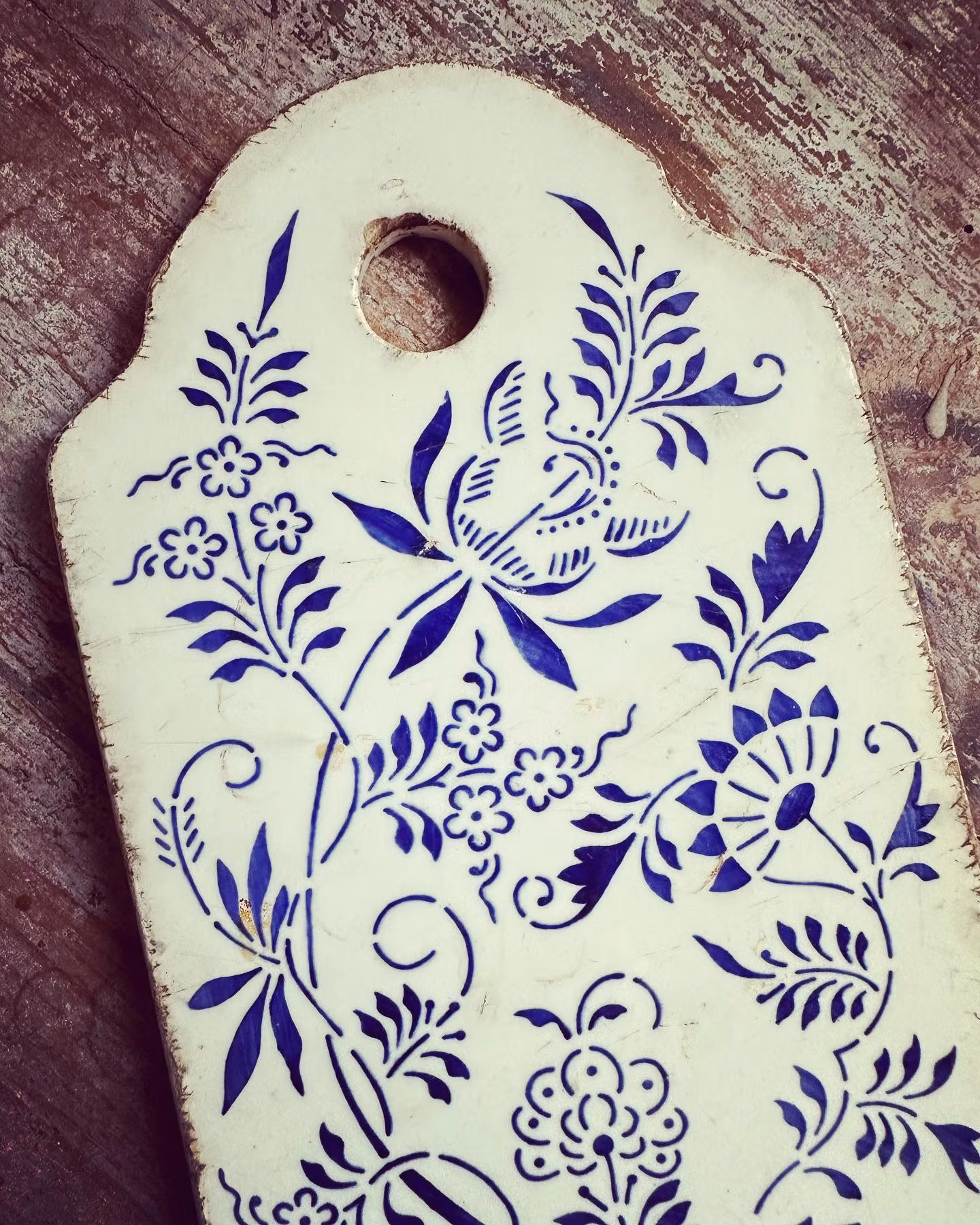Vacker gammal skärbräda med härlig patina i vitt och blått porslin. Fin som uppläggningsfat eller bara som dekoration i köket.