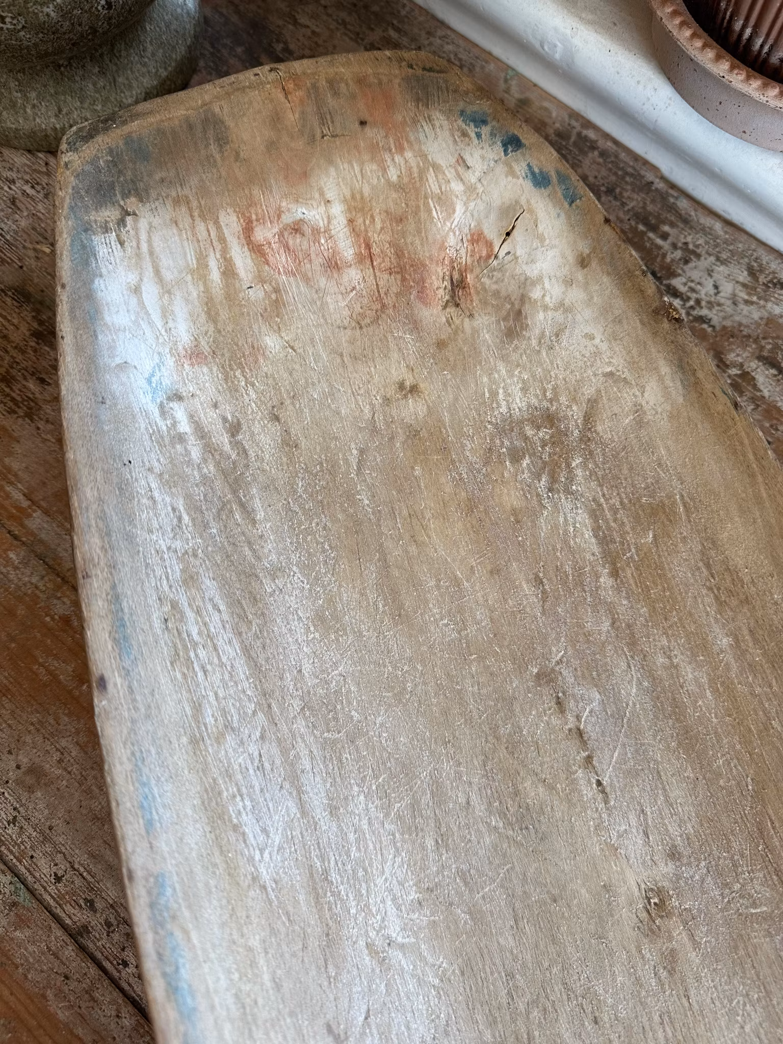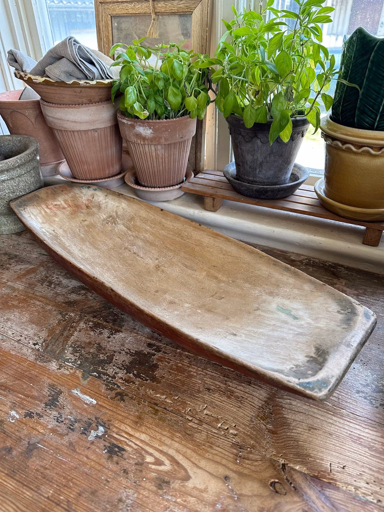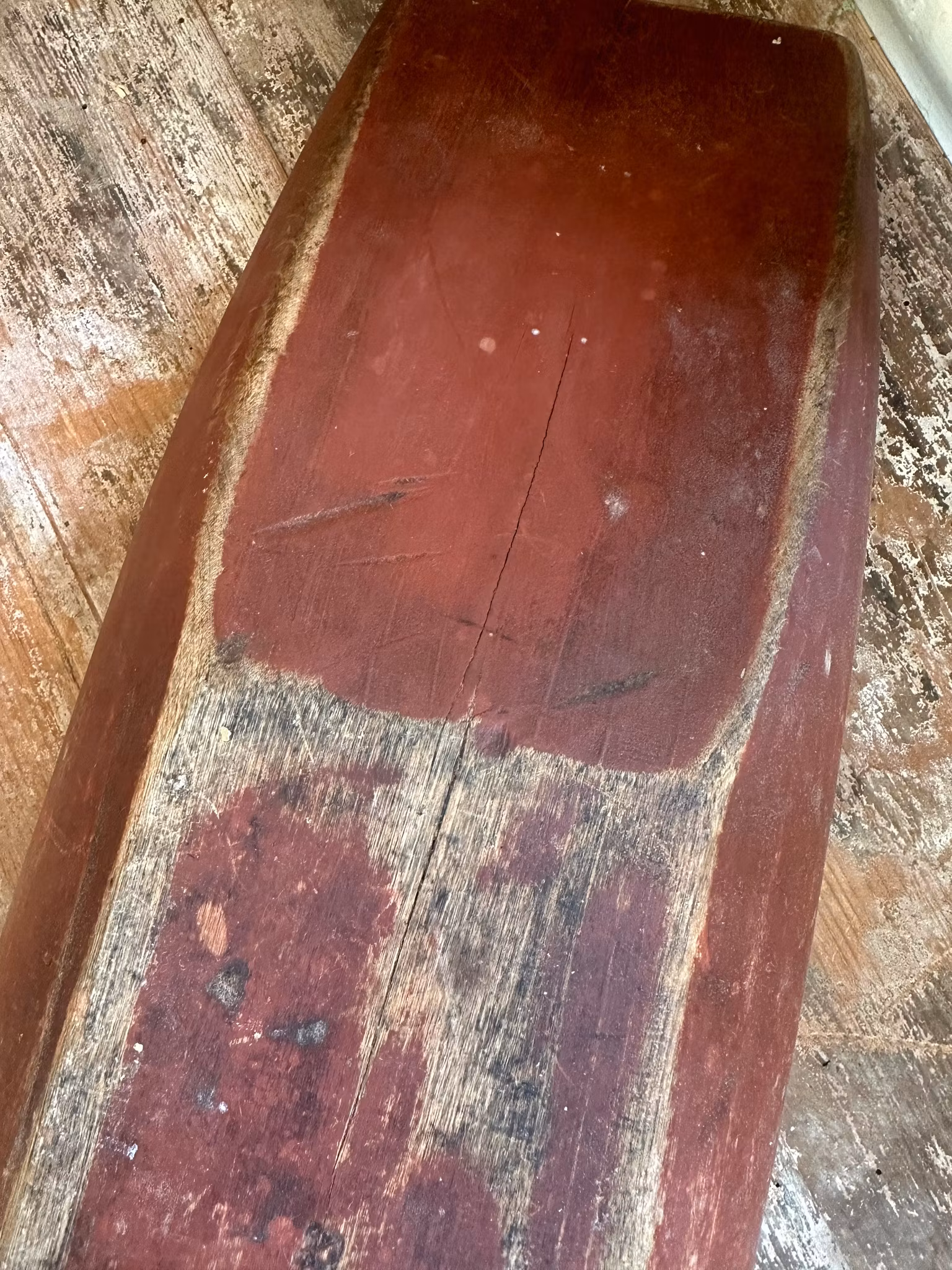 Underbart gammalt trätråg med röd undersida. Märkning undertill.