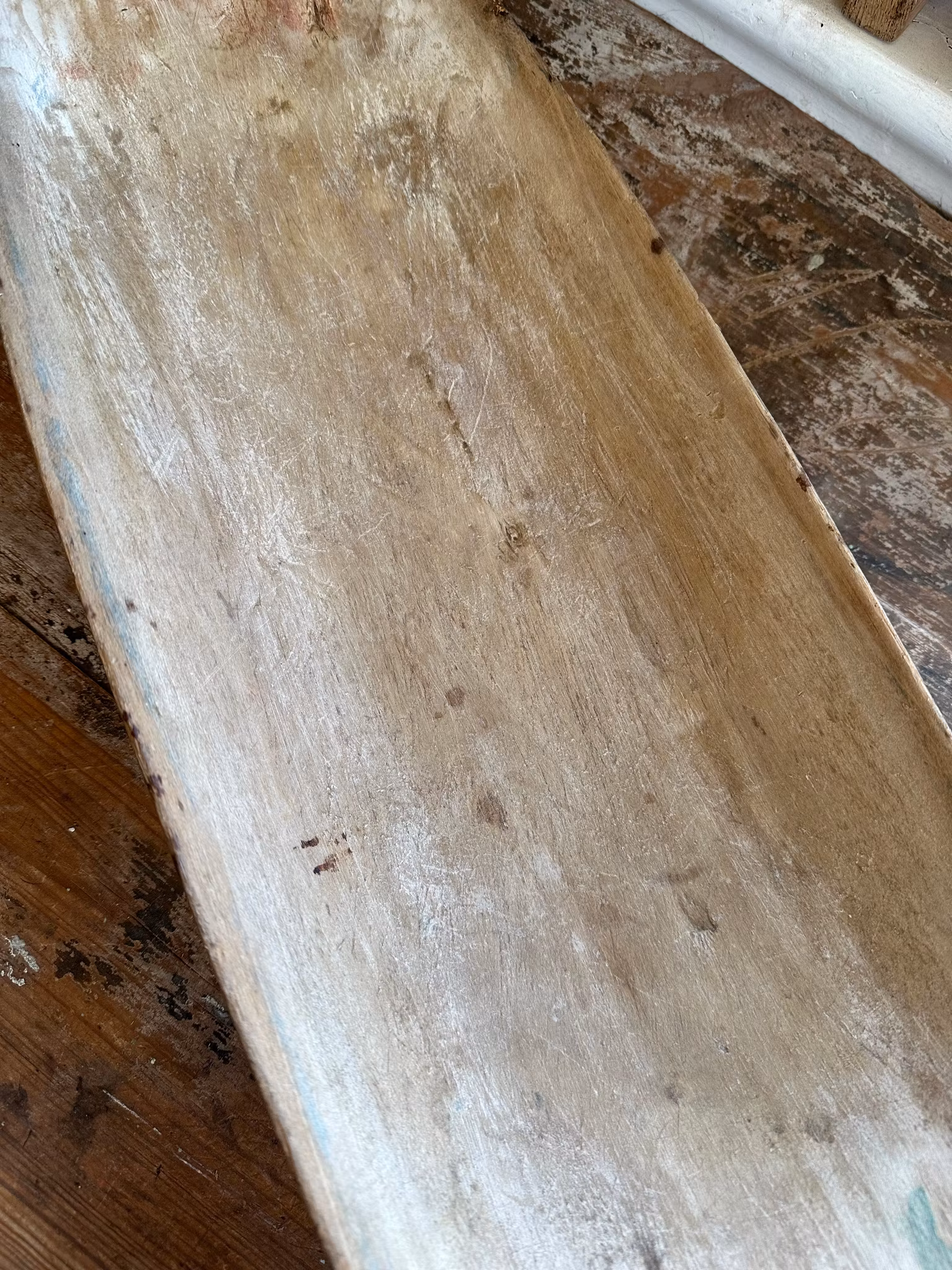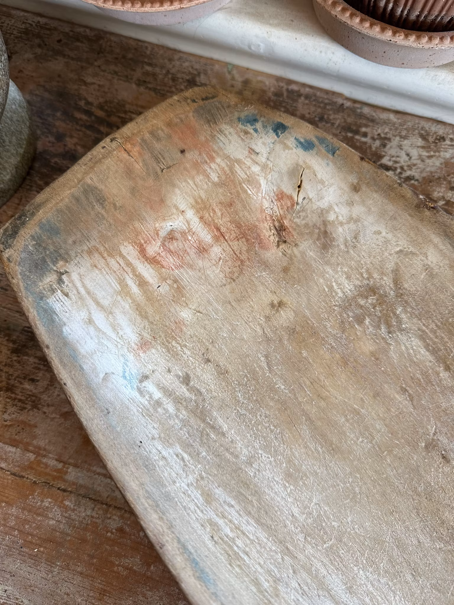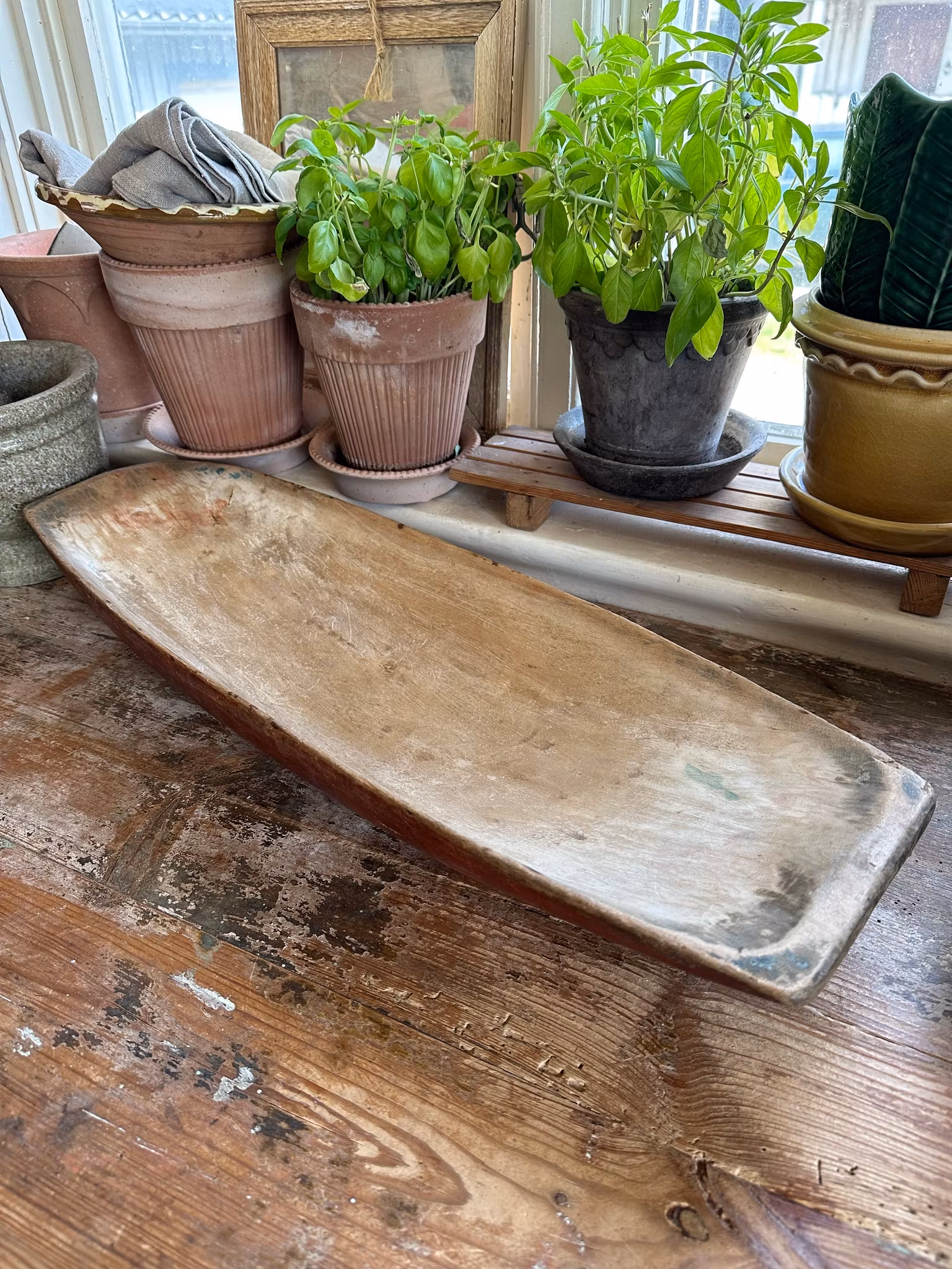 Underbart gammalt trätråg med röd undersida. Märkning undertill.