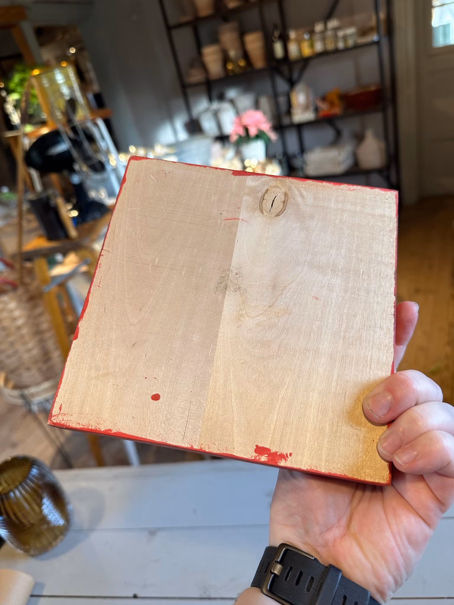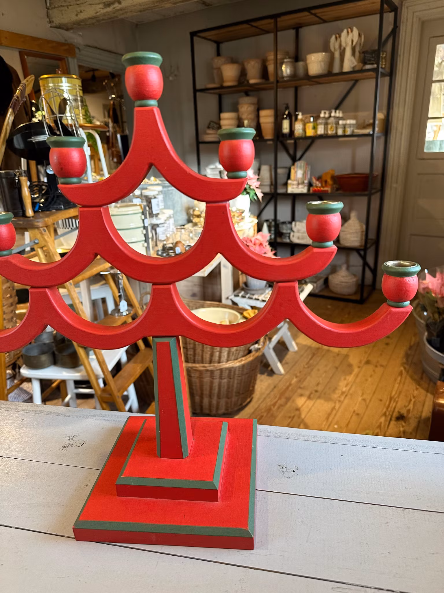 Fin ljusstake i trä i gammaldags modell men av nyare tillverkning. Vacker röd nyans med gröna och guldfärgade detaljer. Ljushållare av metall inuti träet. Ser inte ut att ha varit använd.