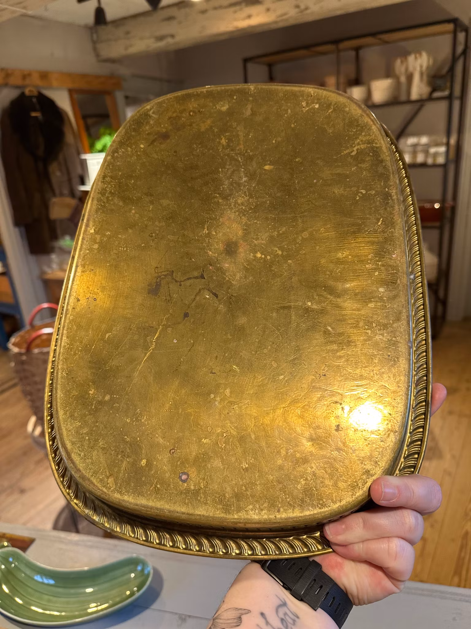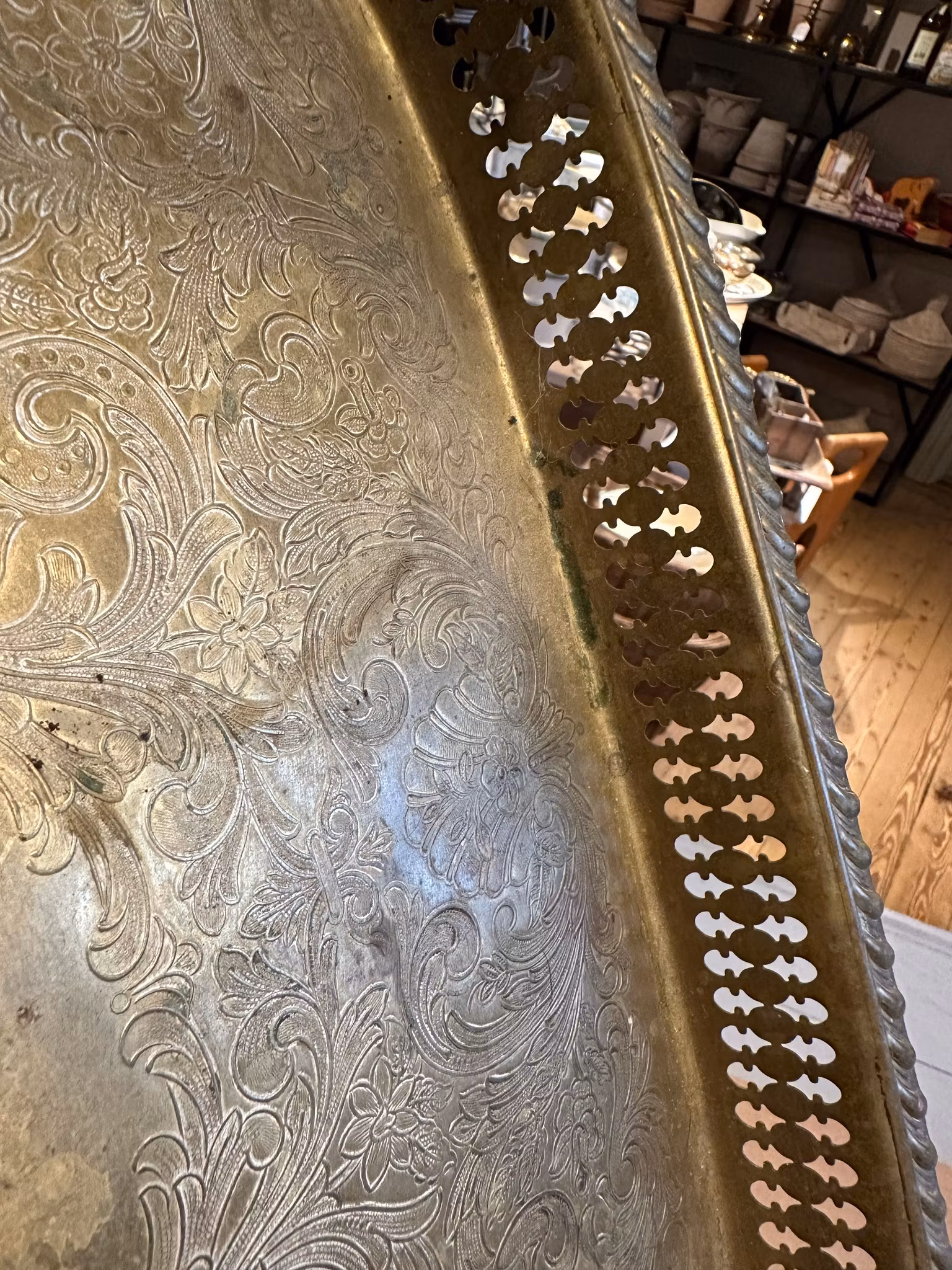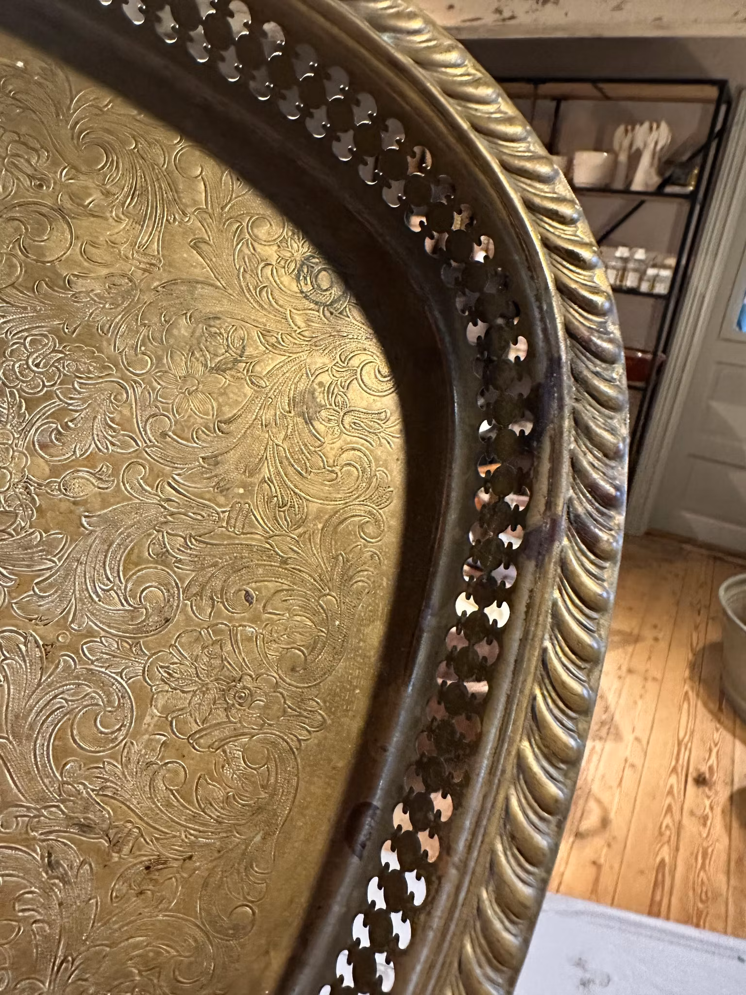 Vacker mässingsbricka i fin annorlunda modell med kant med utskuren dekor och med fint mönster på ovansidan.