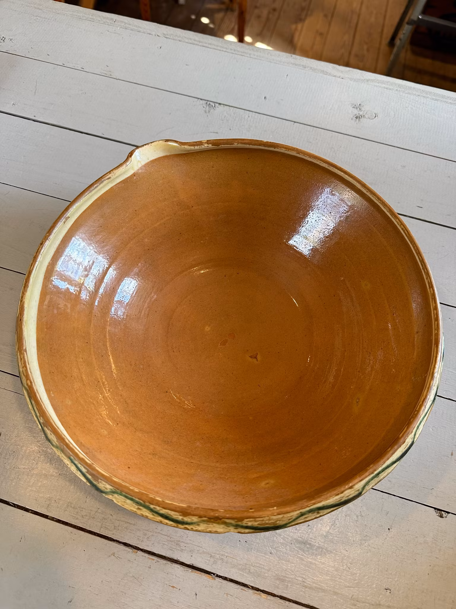 Vacker gammal spillkum i klassisk modell. Grön och ljusgul dekor på kanten.