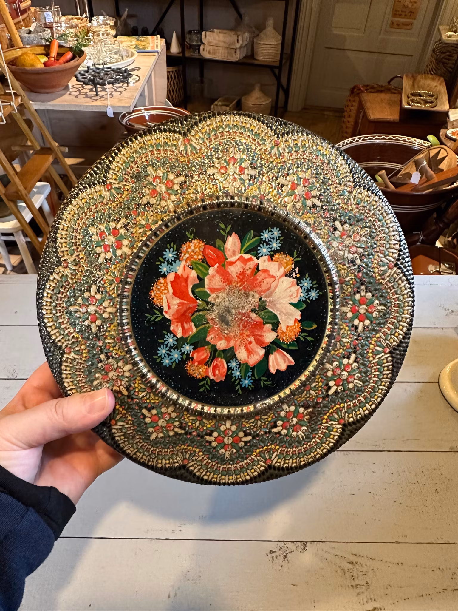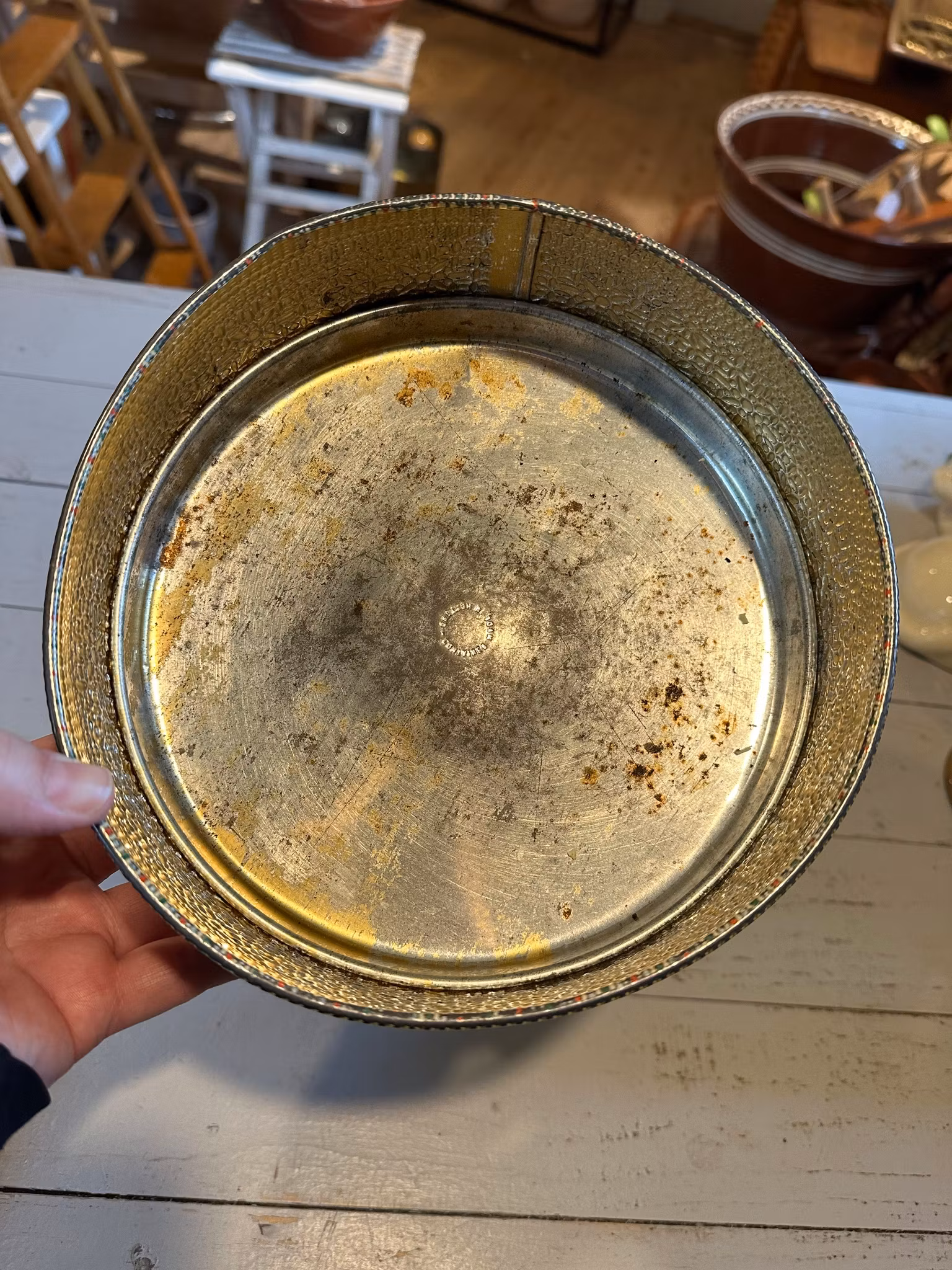 Fin plåtburk med dekorativ utsida i lite upphöjt mönster. Jag tror att den är gjord i England.