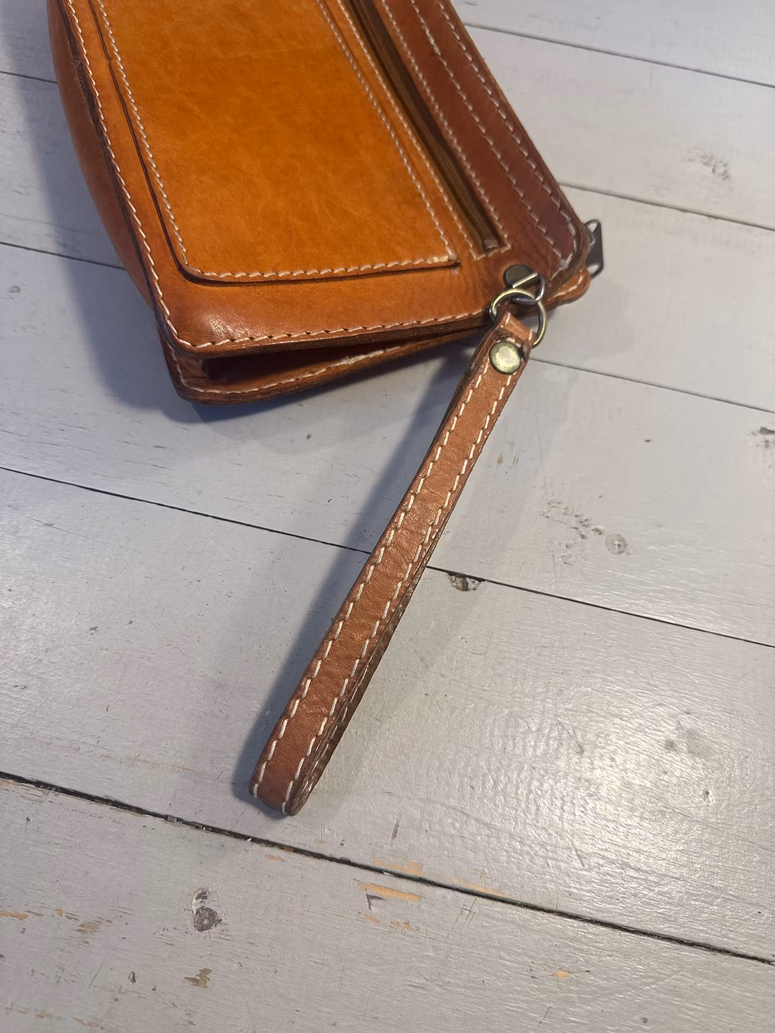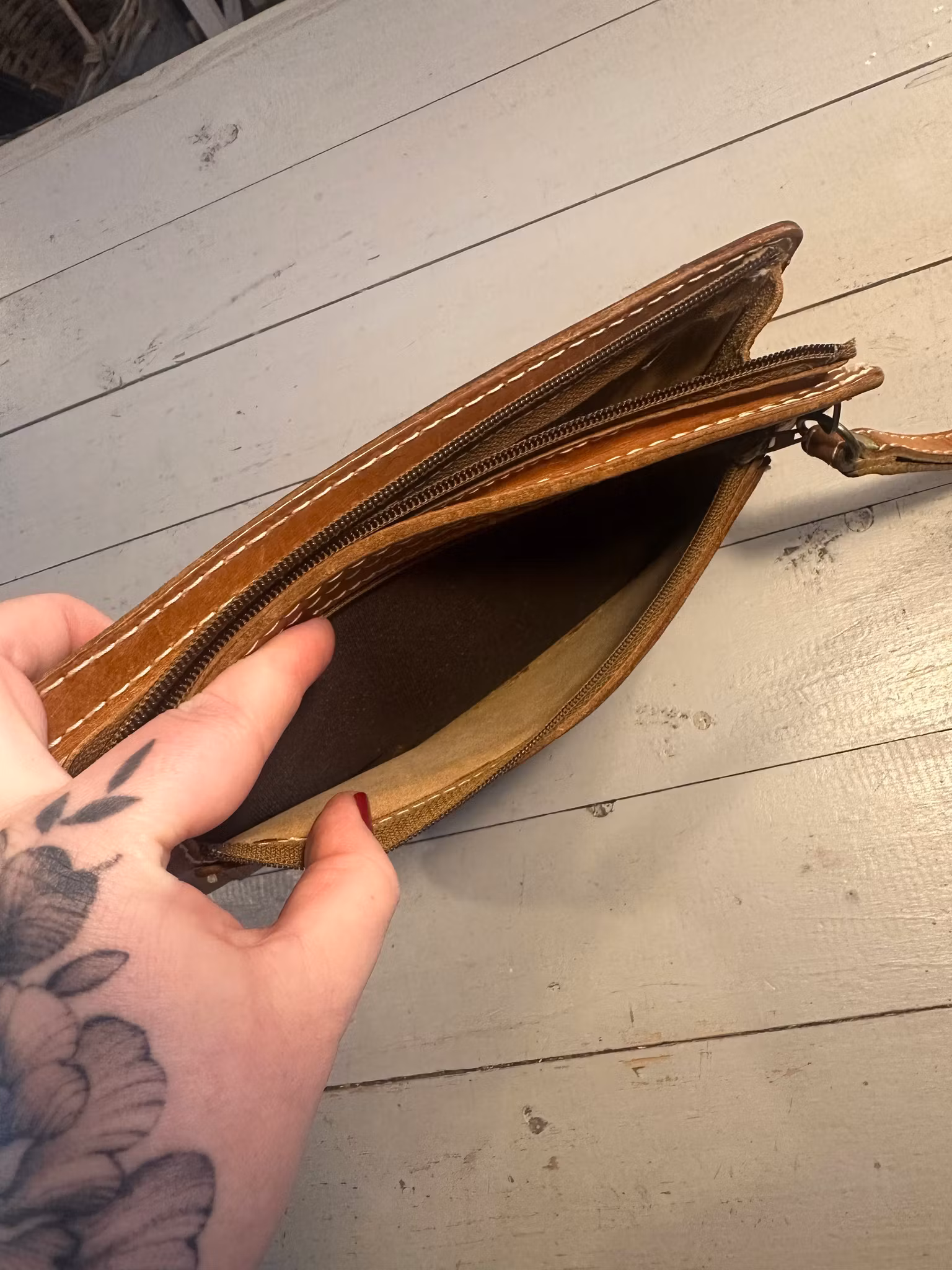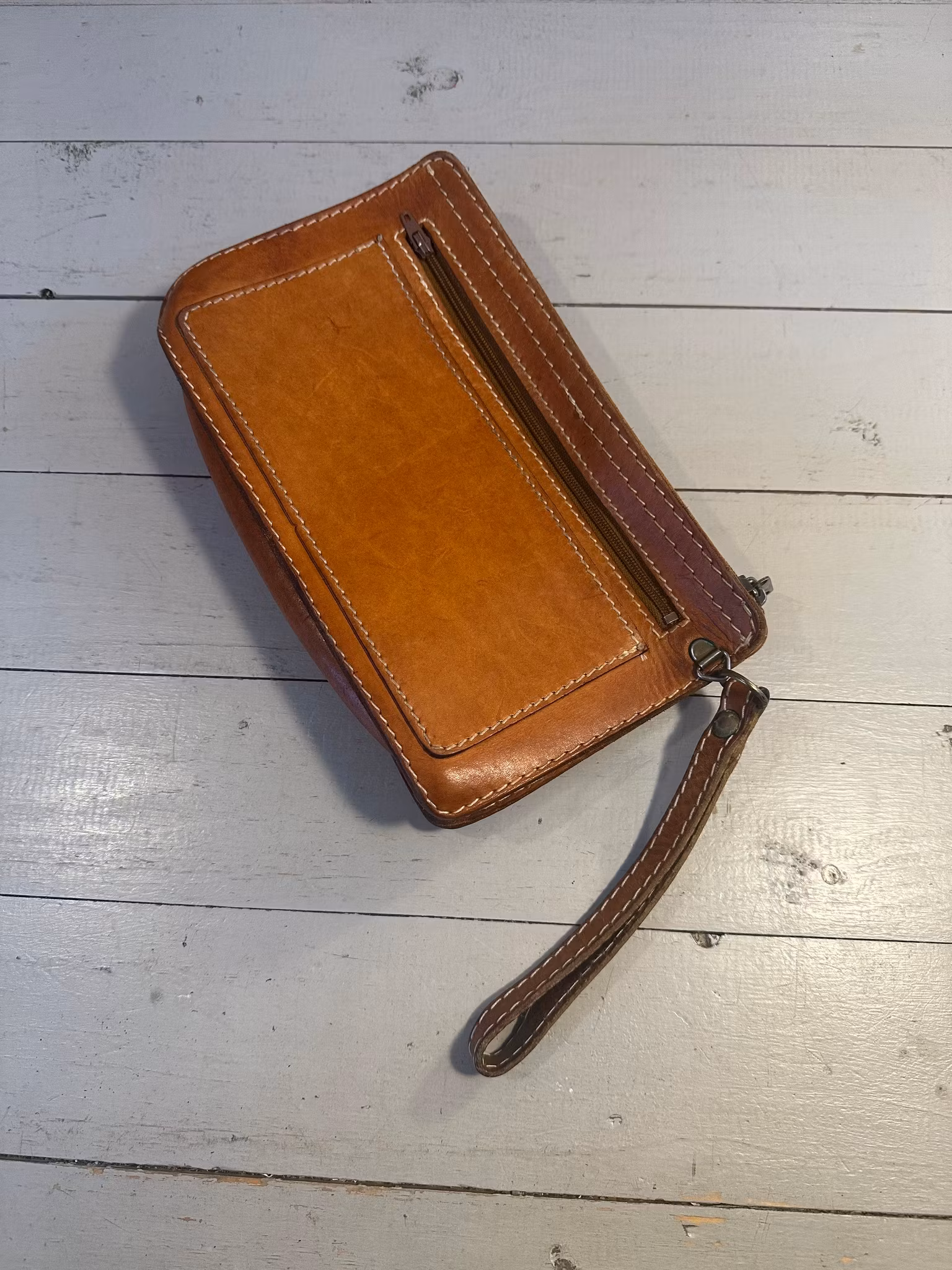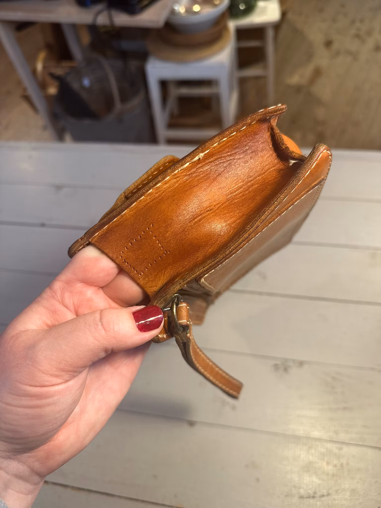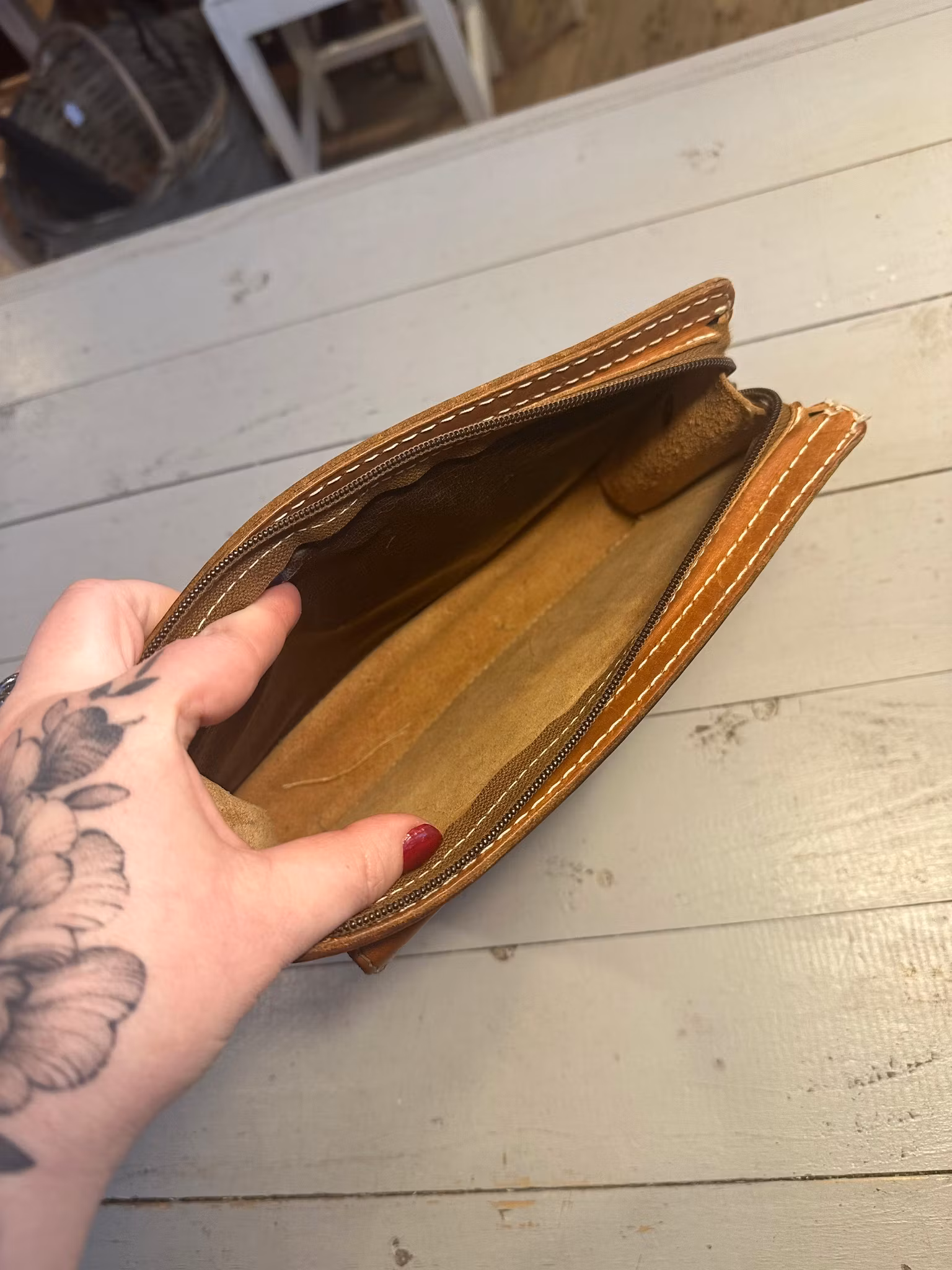 I gott använt och åldrat skick. Spår av användning över hela. Se bilder för skick. Någon fläck och färgskiftning finns i lädret. Någon har gjort hål i sidorna av okänd anledning, ser inte ut att vara från tillverkning utan någon ägare som gjort själv.