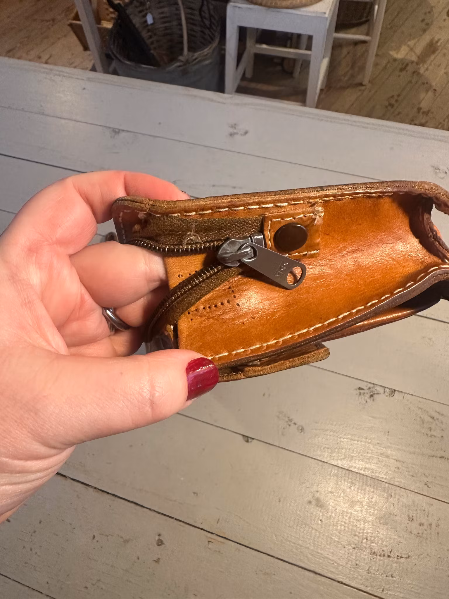 Fin gammal läderväska i mindre modell. Stängs med knäppe framtill på lilla facket och blixtlås upptill samt på bakre facket.