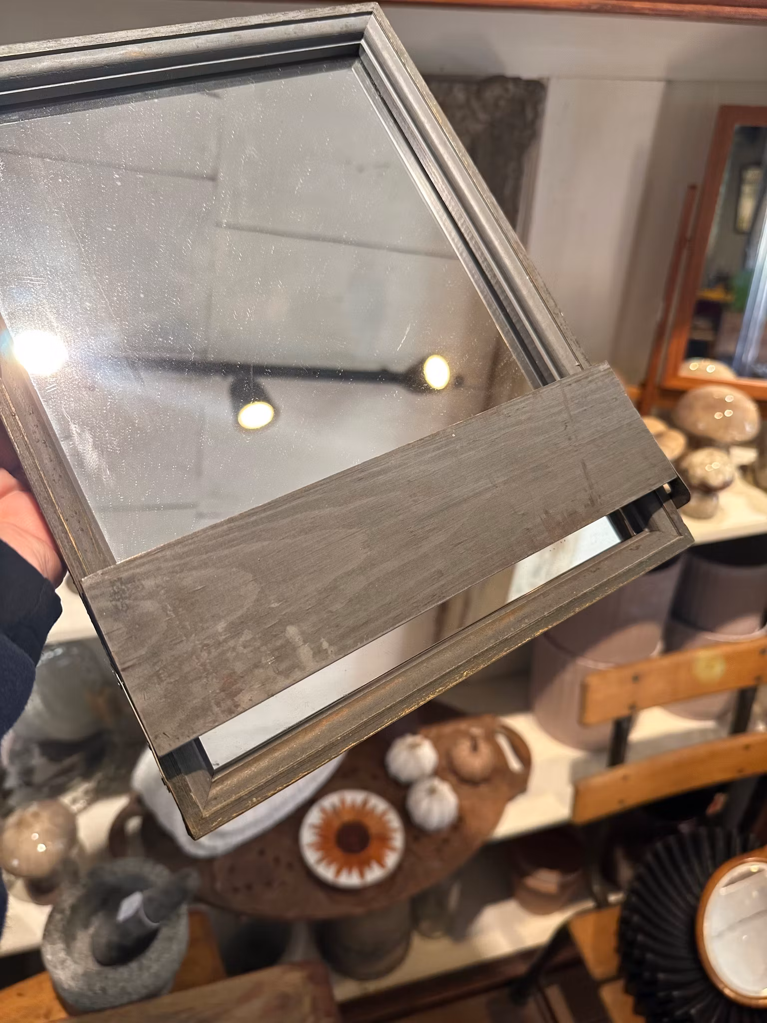 Liten söt rakspegel. I gott använt och åldrat skick. Spår av användning och ålder finns. Se bilder för skick. Glaset utbytt av någon tidigare ägare. Mått ca 2