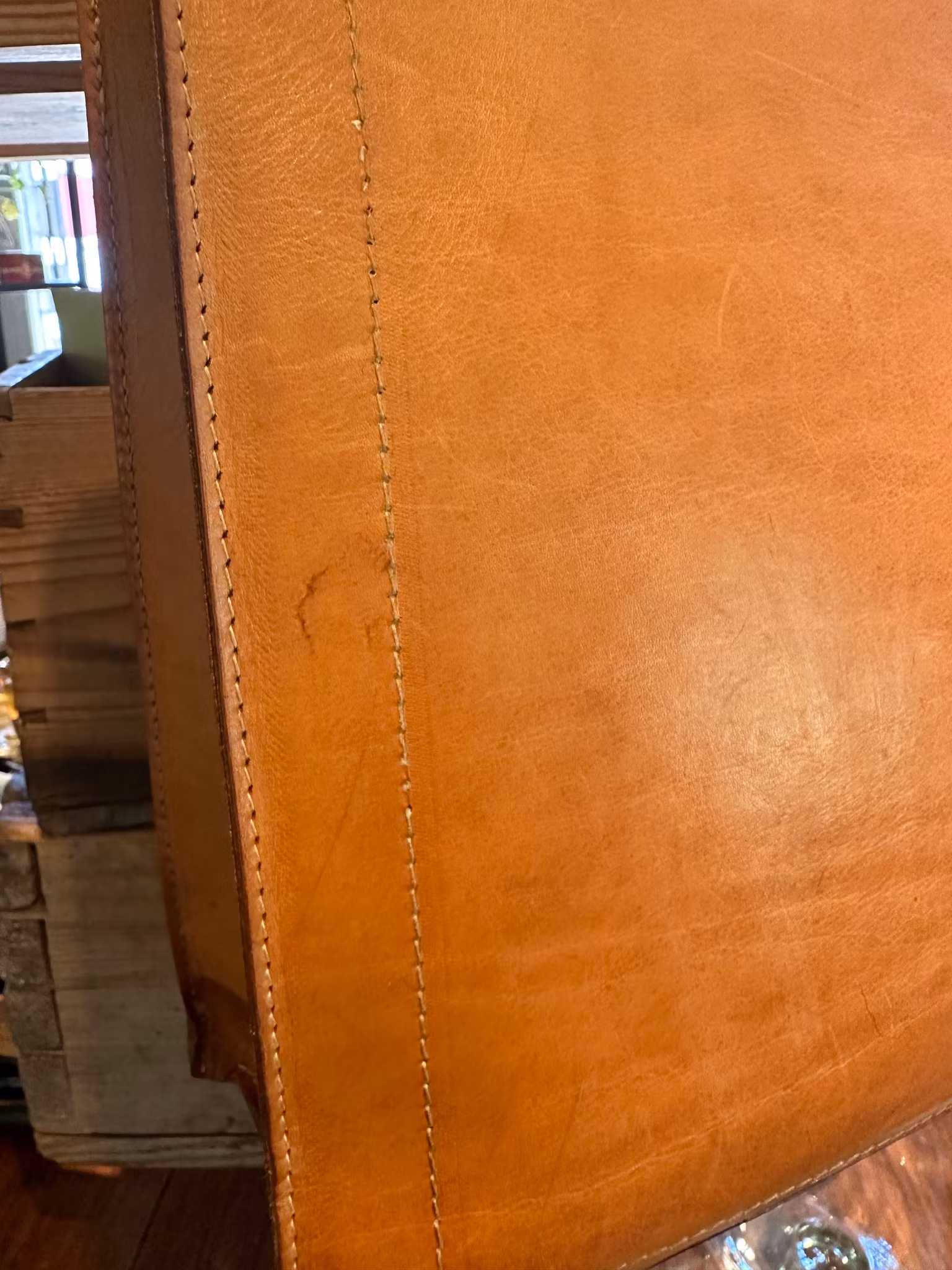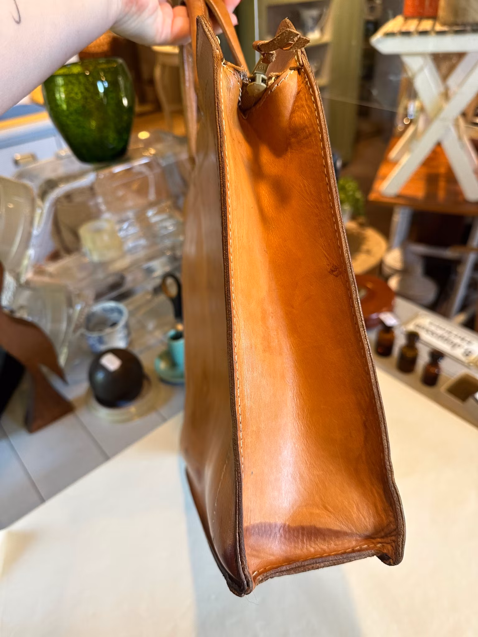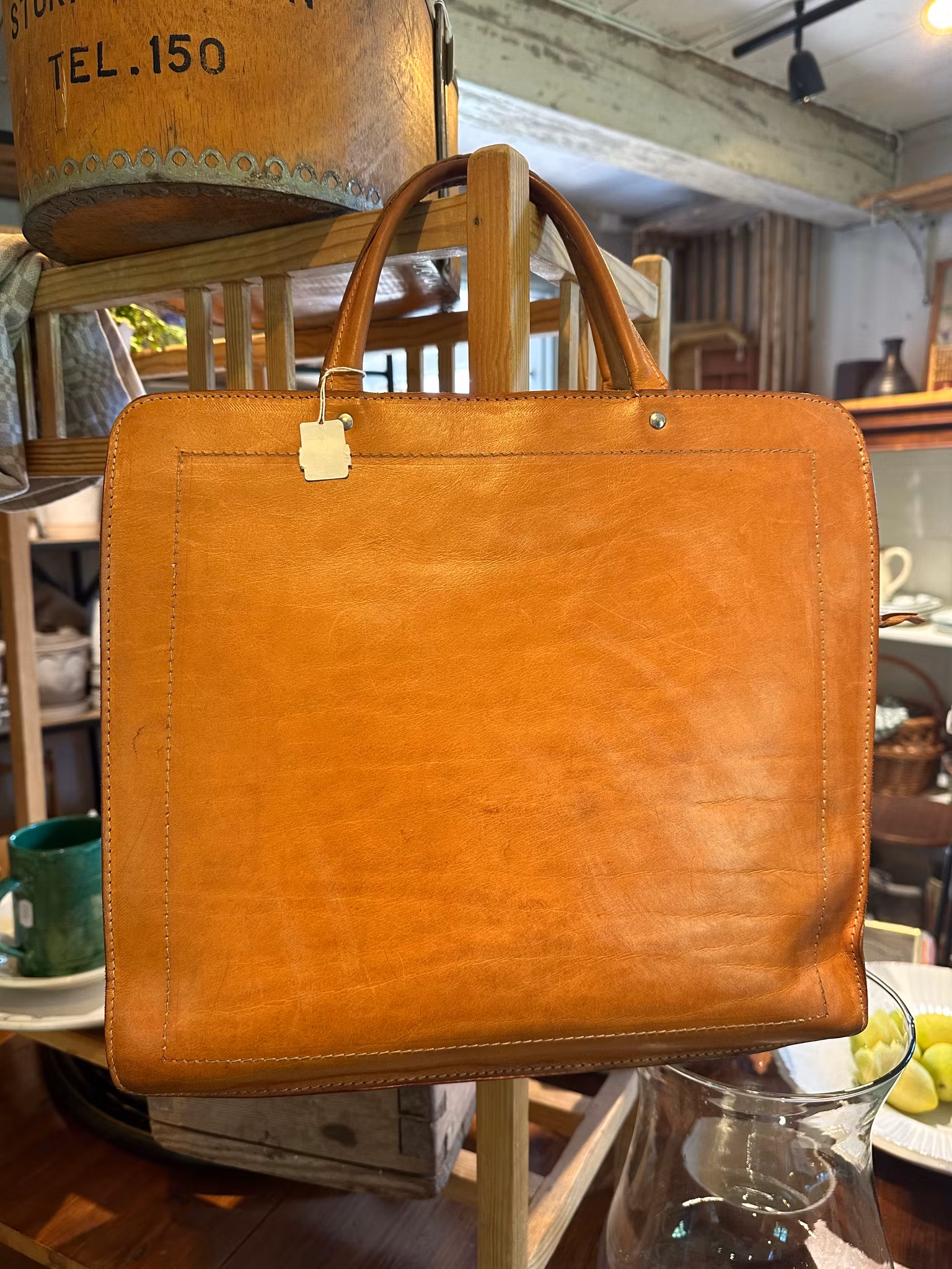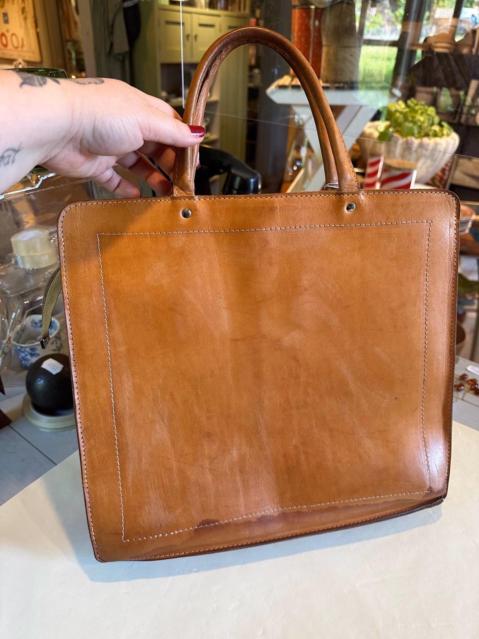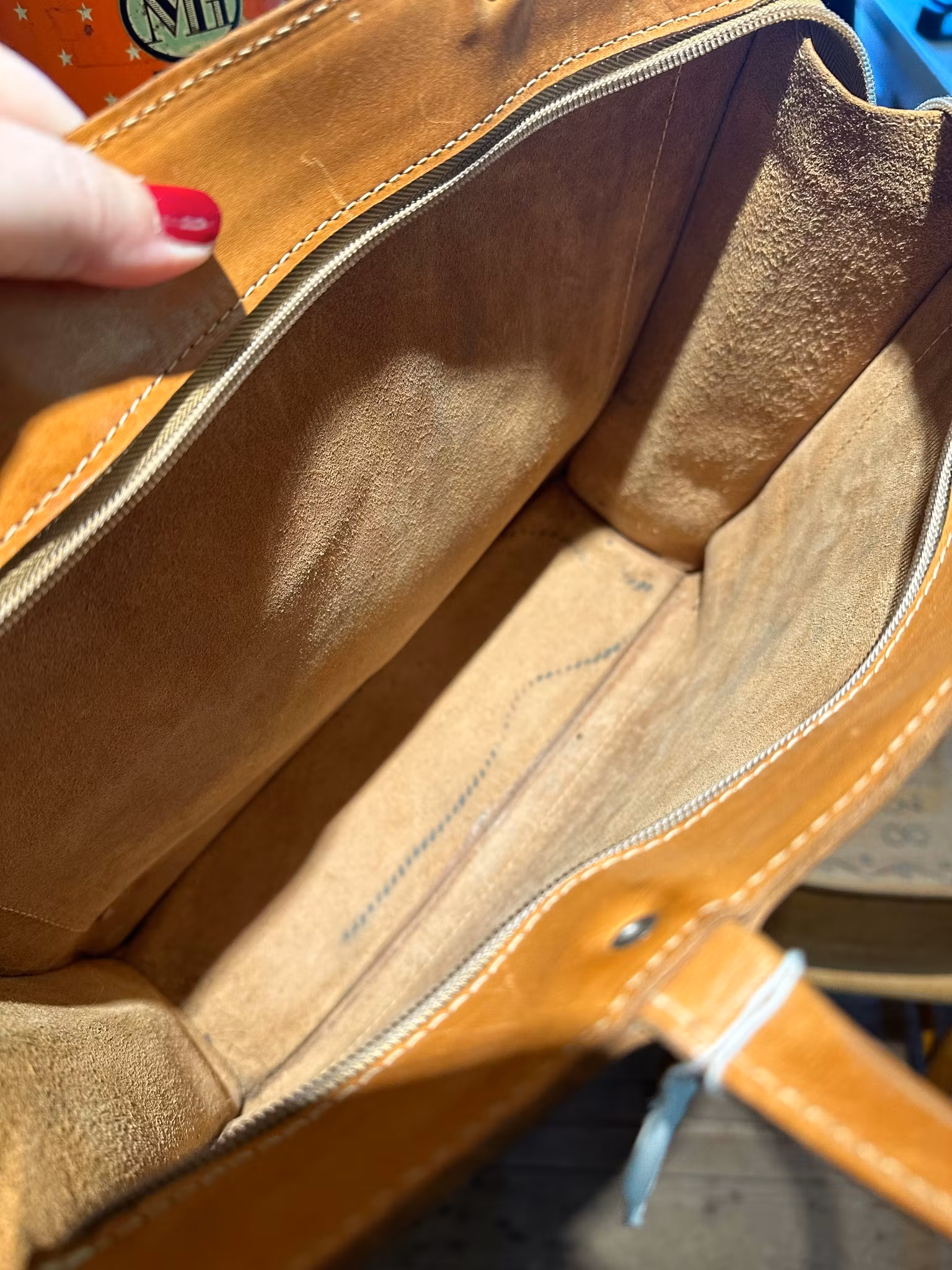 I gott använt och åldrat skick. Fläck nertill som tillkommit under åren av användning. Lite ljusare linjer i lädret på fram och baksida som också uppkommit av ålder och användande. Några andra fläckar finns här och där. Lite av sömmarna på handtagen har blivit omsydda i annan färg. Några streck och så inuti. Se bilderna för skick.
