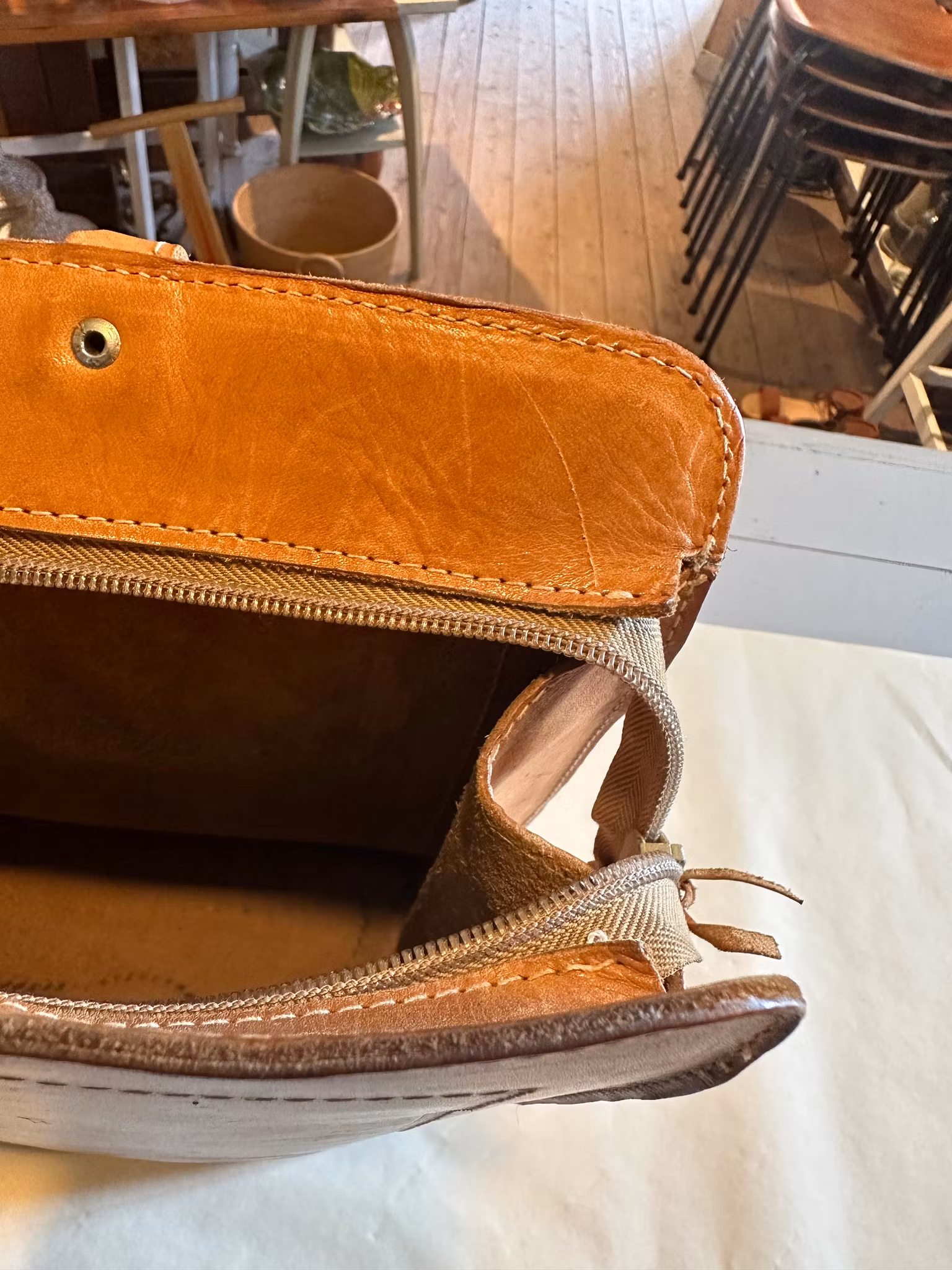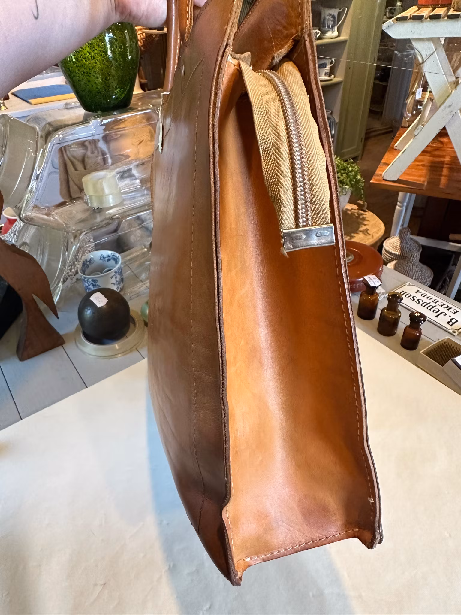 Fin gammal läderväska med blixtlås som stängning.