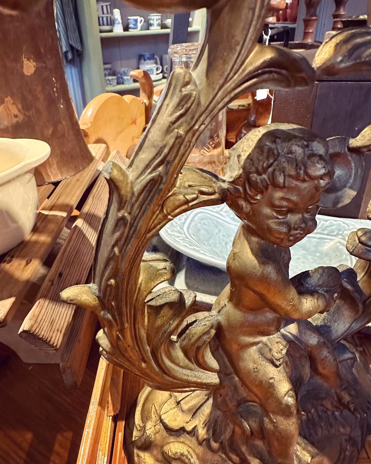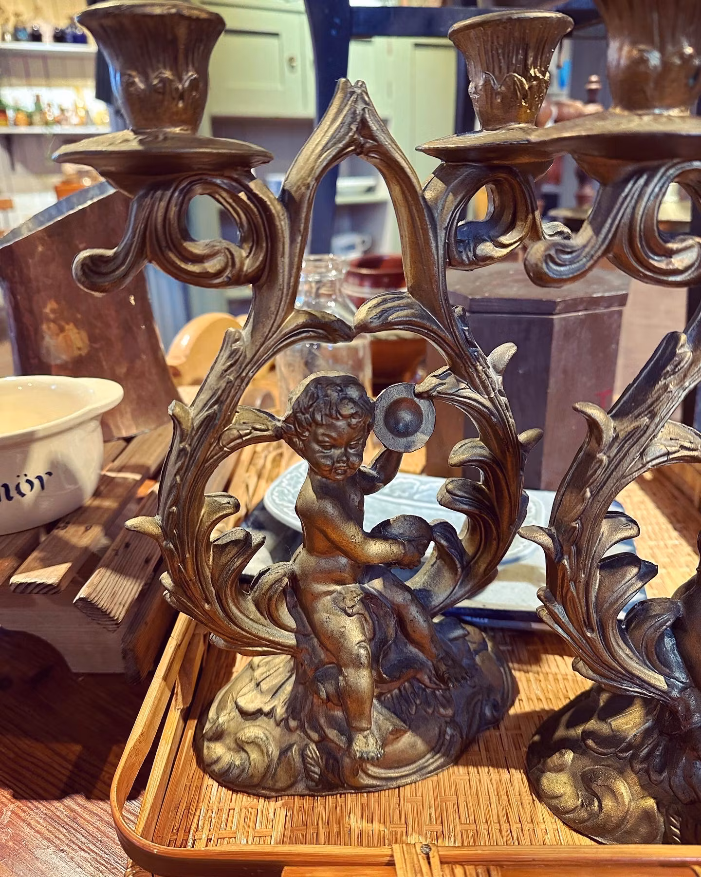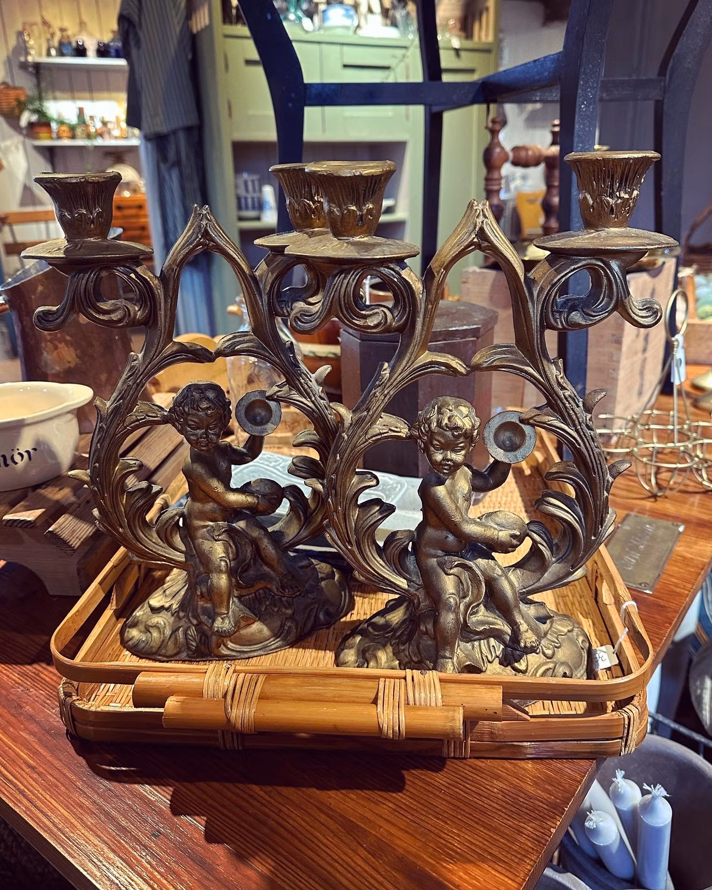 Underbara gamla ljusstakar i gjuten plast. Samma som man ibland ser på gamla Italienska solspeglar och liknande. Änglar och dekoration och vackra snirkliga former.
