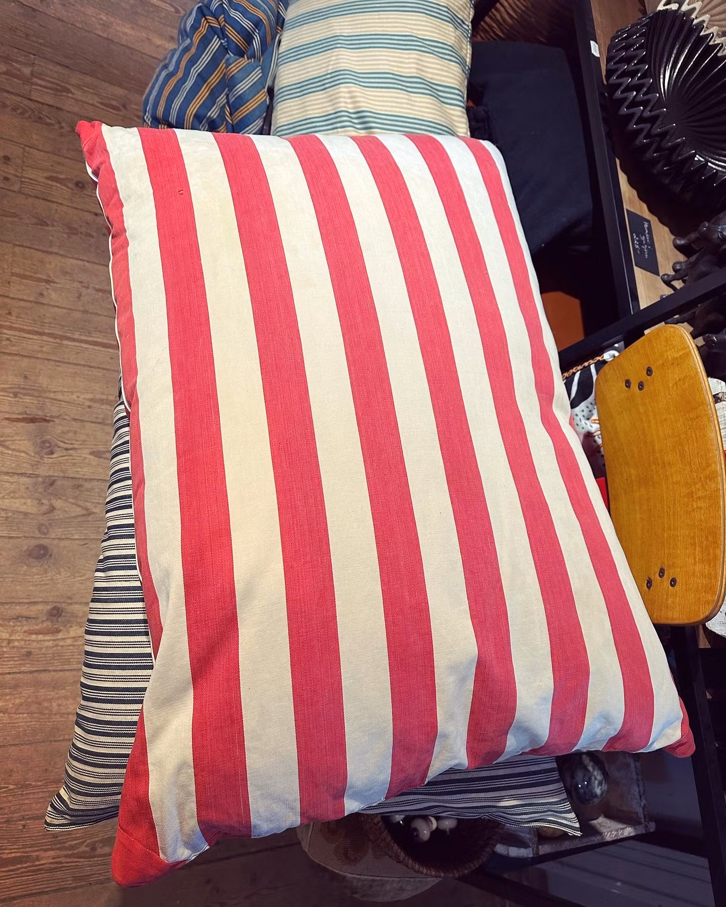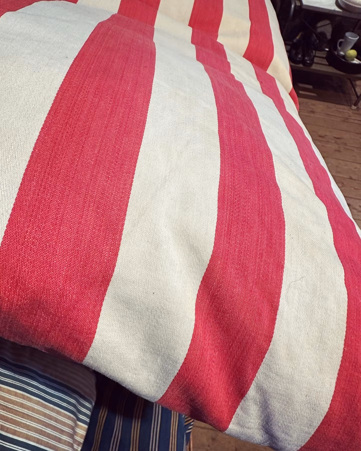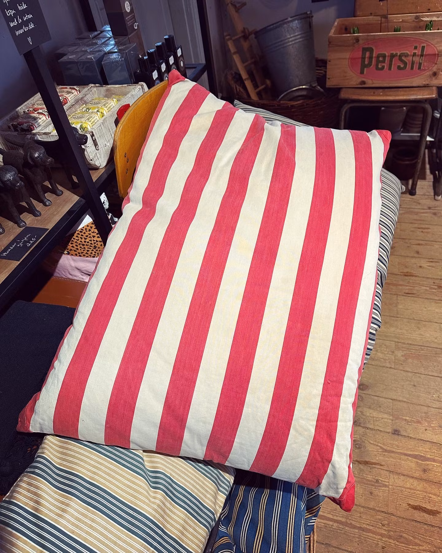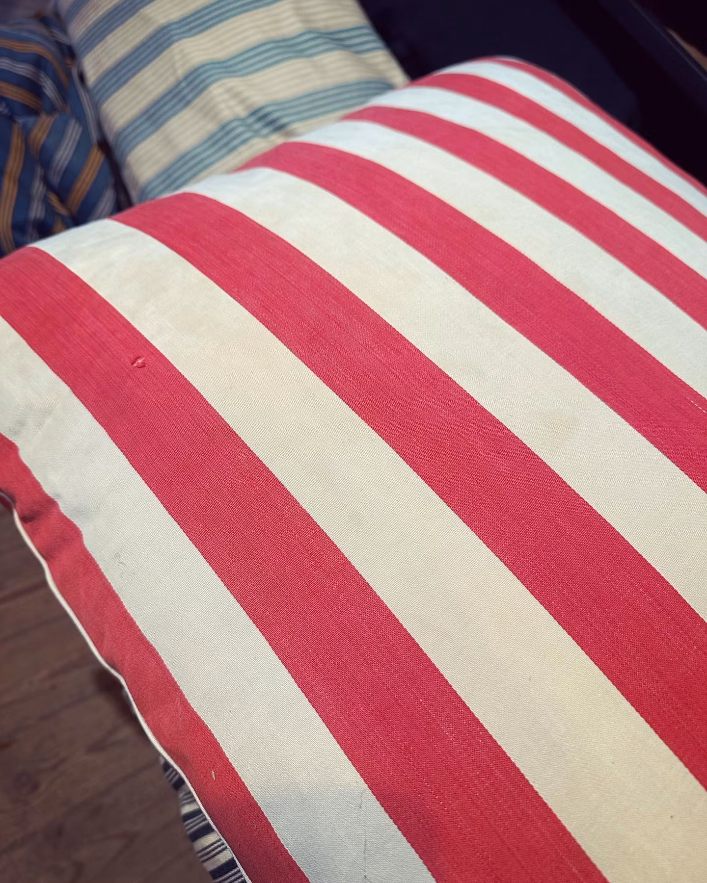 Vacker gammal bolsterkudde med breda ränder i vitt och rött. Fin klassisk detalj i hemmet! Rolig detalj är de fint sudda förstärkningarna i hörnen.