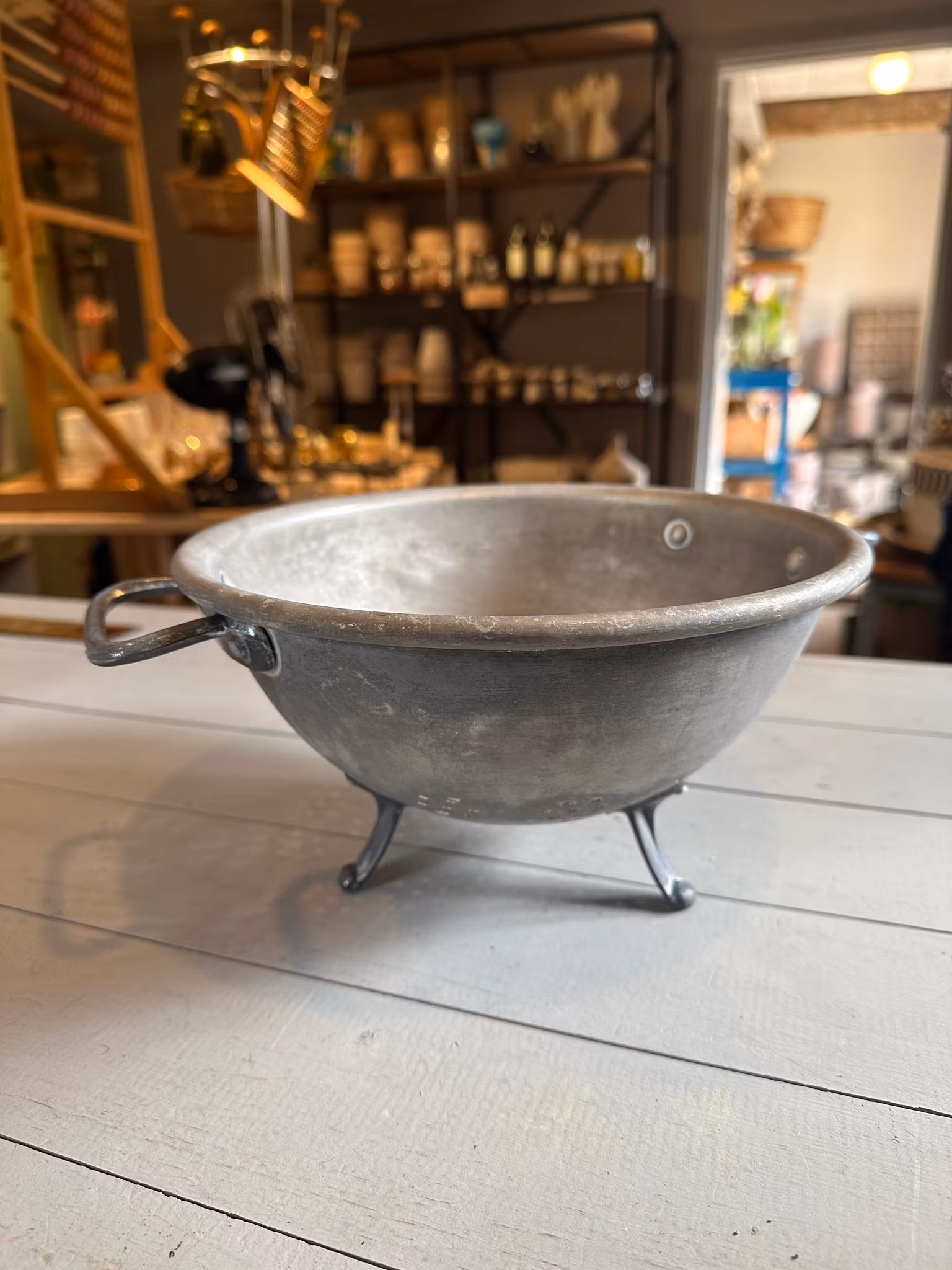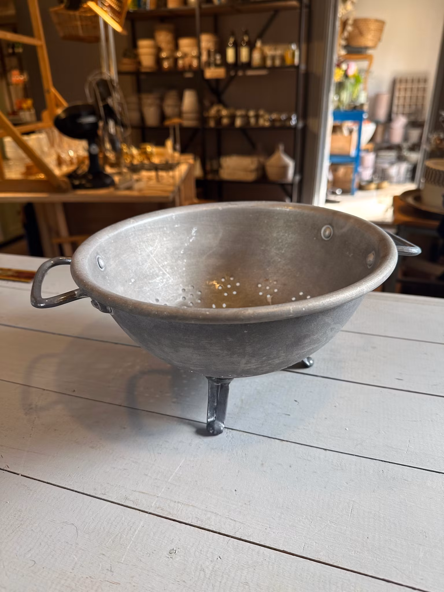 Durkslag i lite kul modell på ”fötter” så det är upphöjt från bordet eller liknande. Handtag i sidorna. Gjort i någon form av lätt metall.