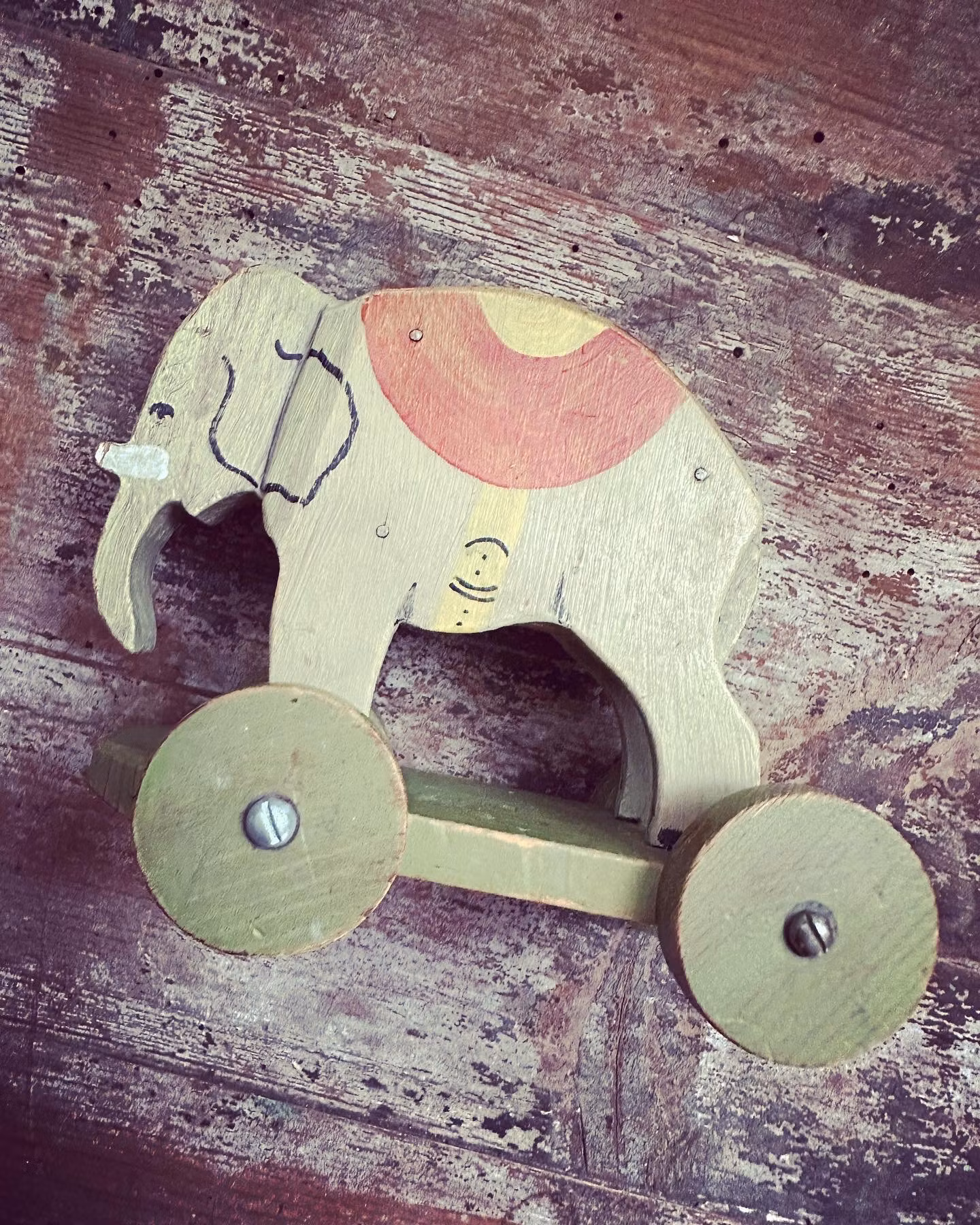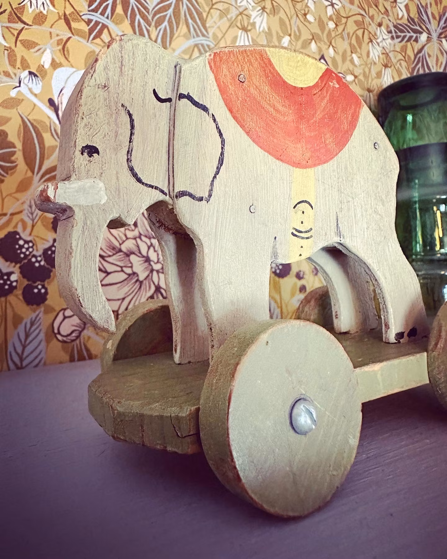 Underbar liten elefant i trä som står på en liten platta med hjul undertill. Grå/beige elefant med grön platta nedtill och med röda och gula detaljer på ryggen. Så fin som dekoration!