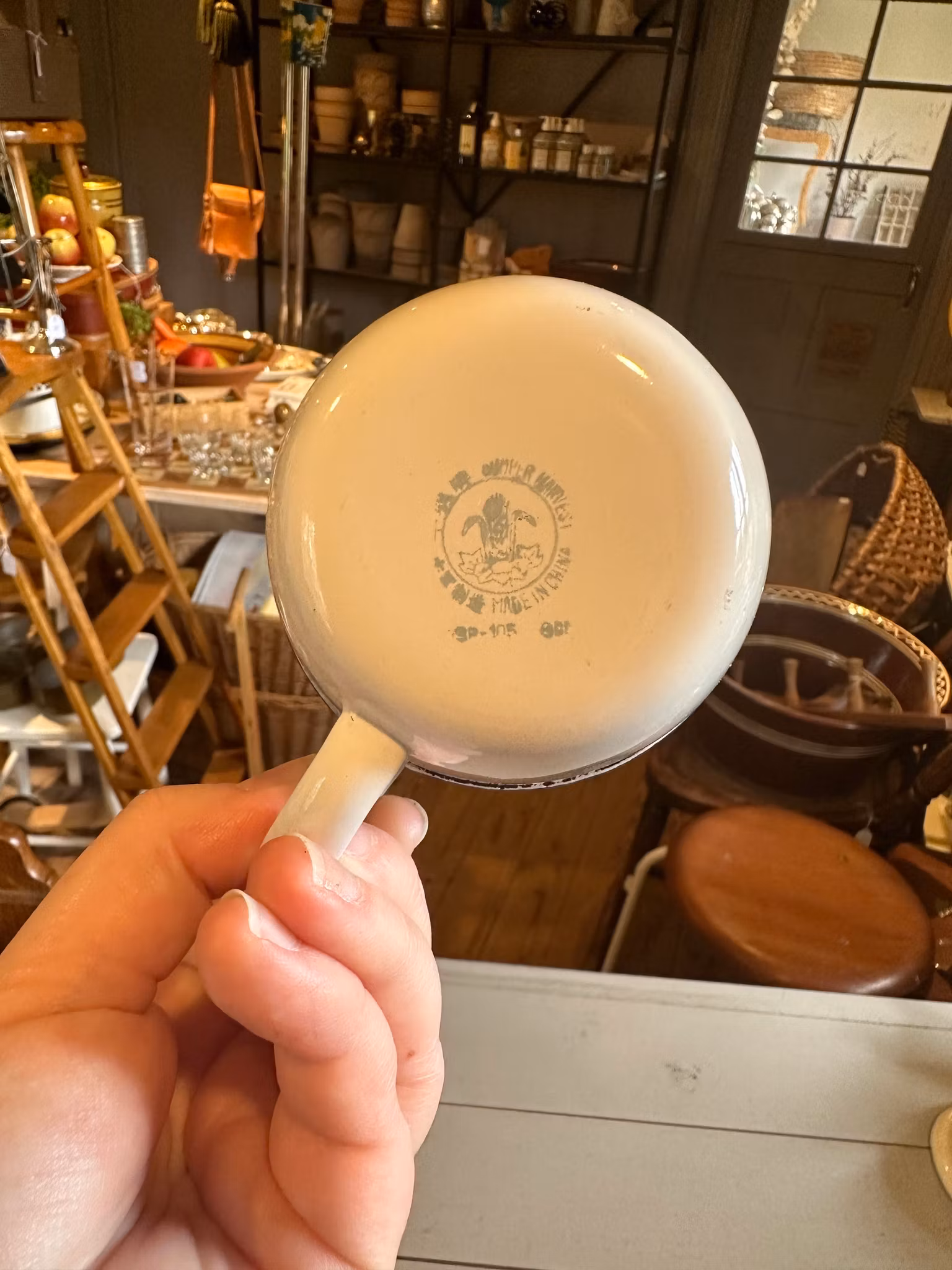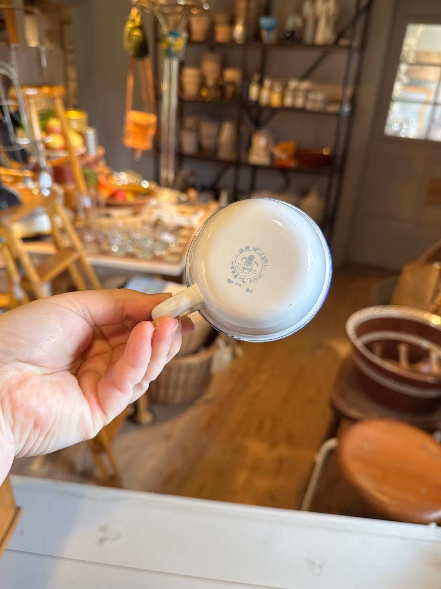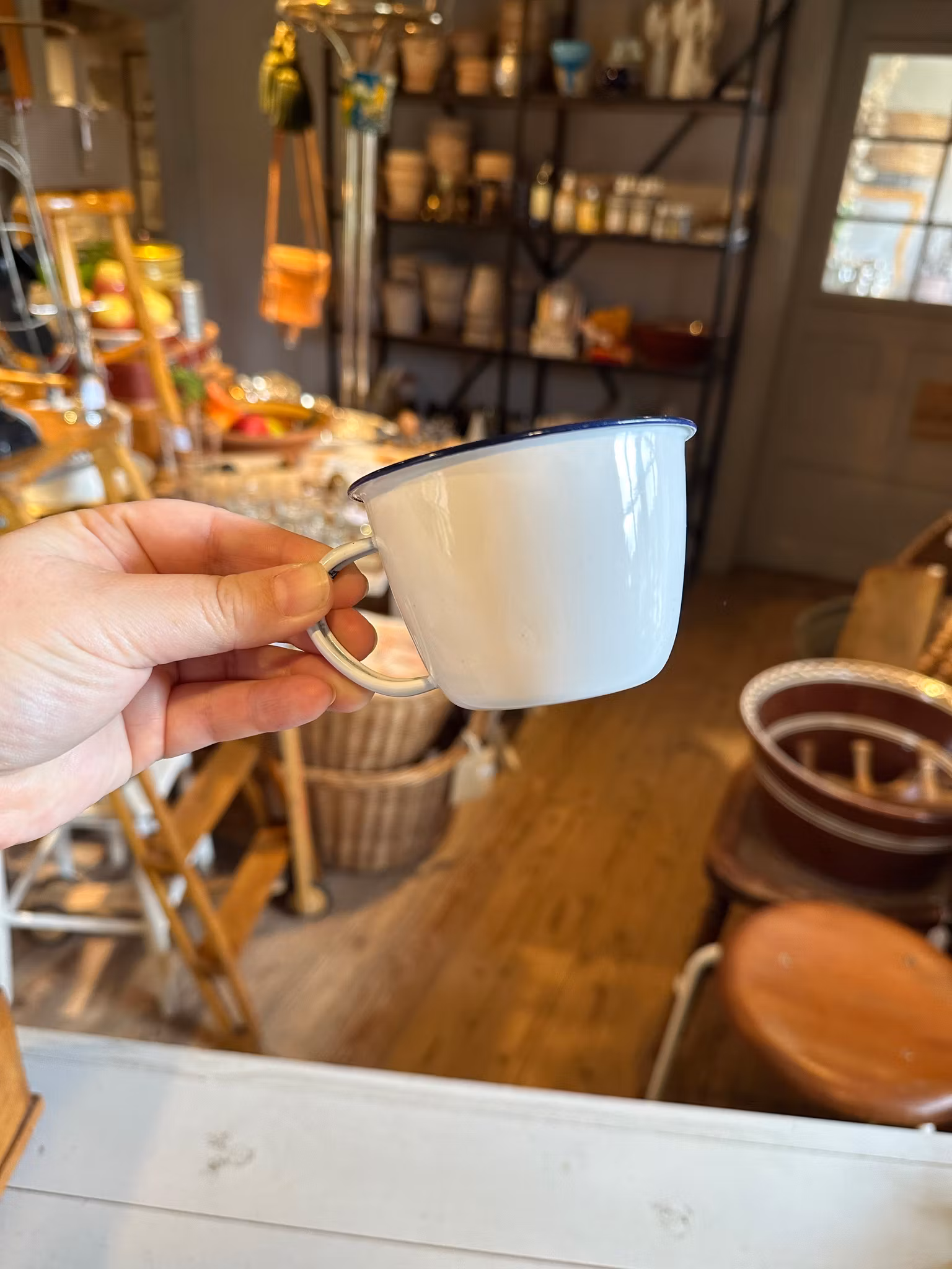 Söt liten emaljerad mugg i vitt med blå kant. Obs ej Kockums.