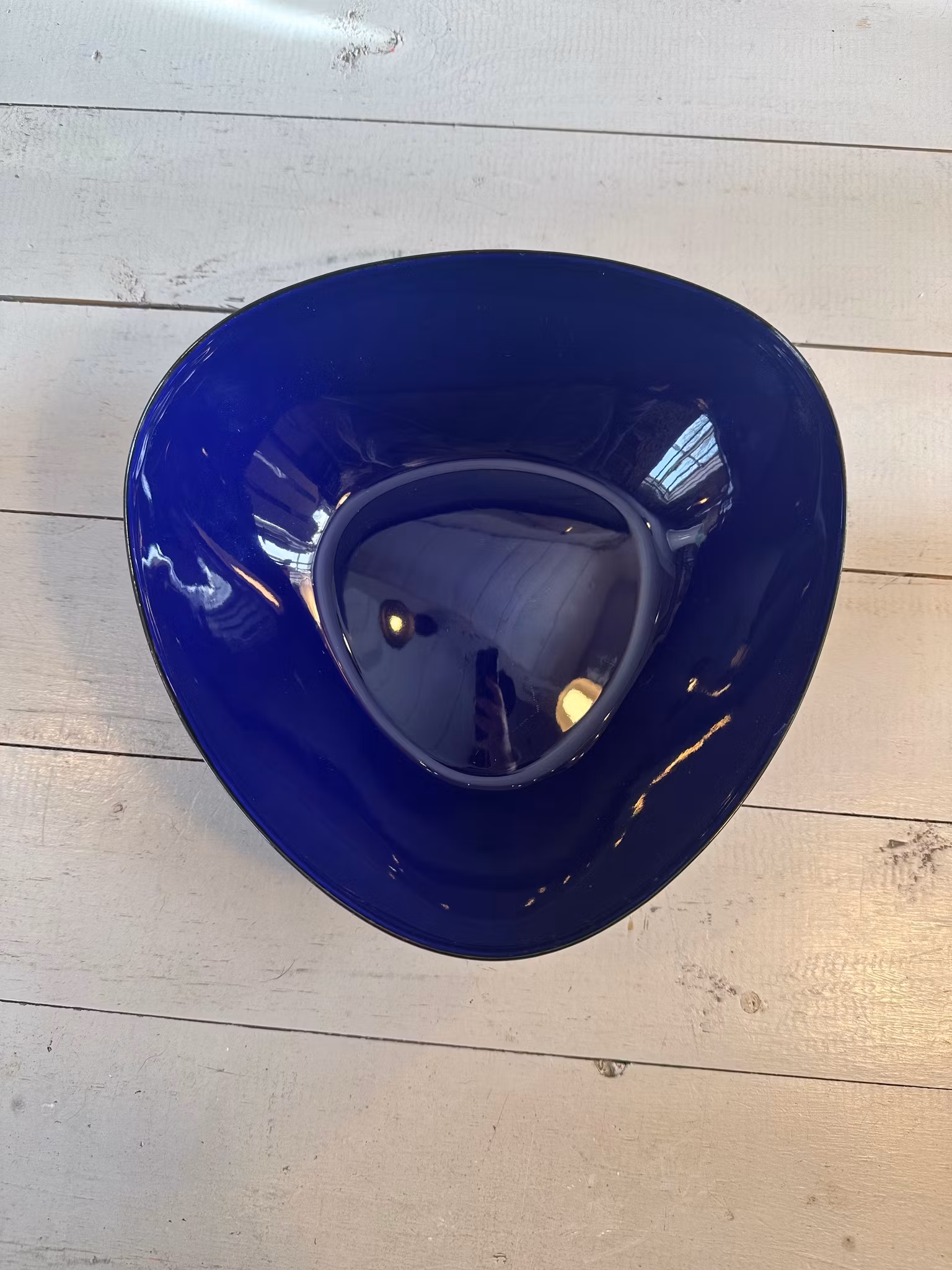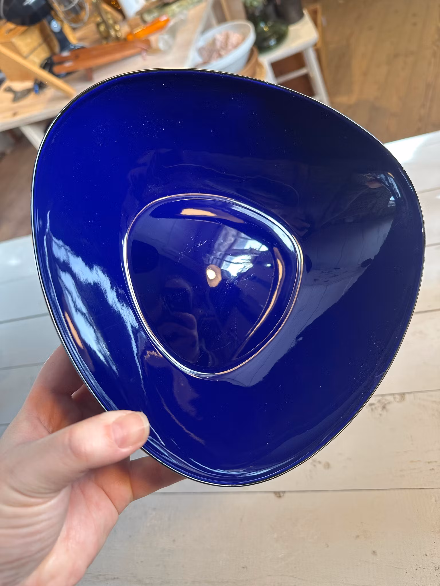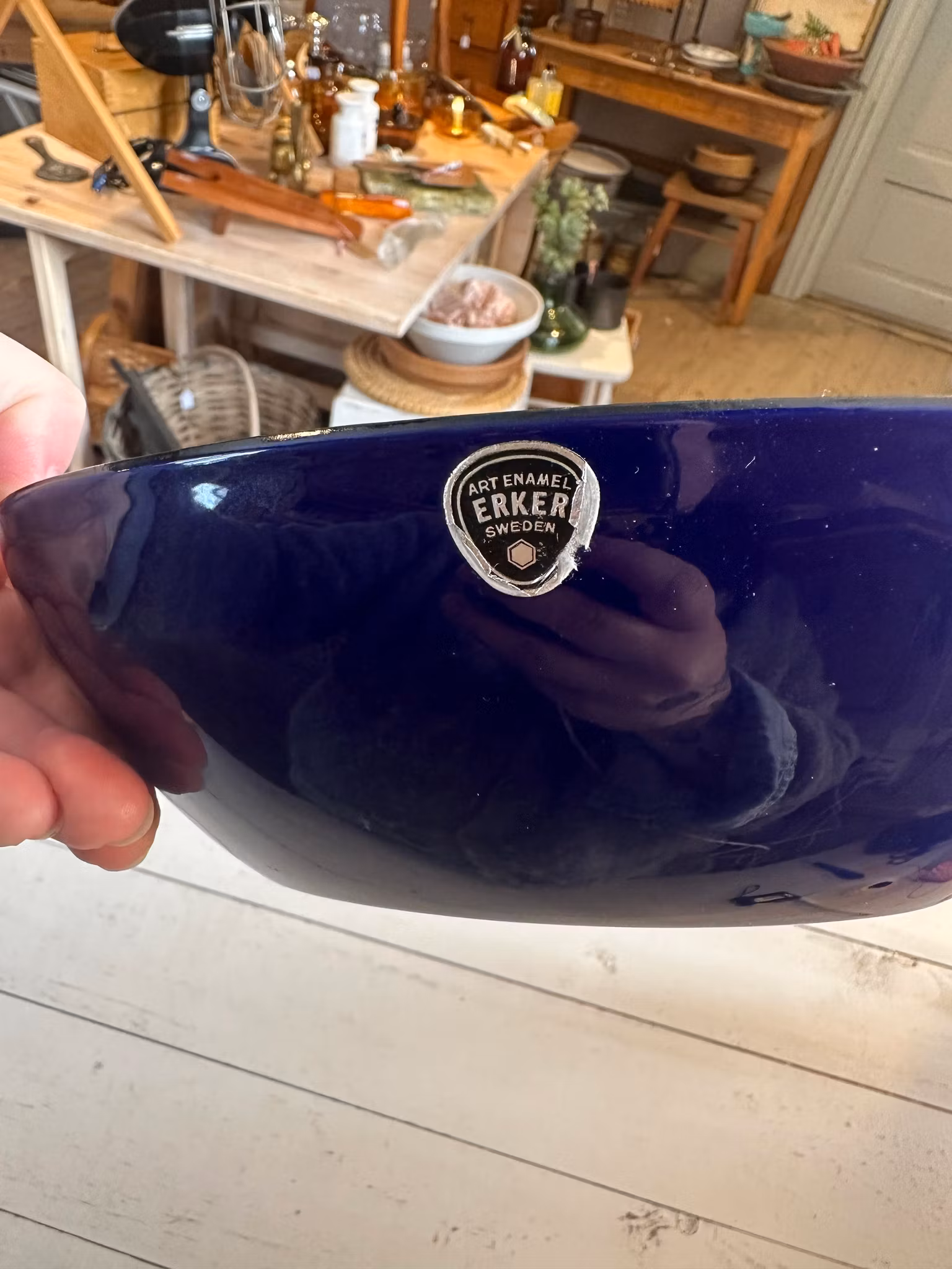 Oerhört vacker emaljerad skål med design av Arne Erkers gjord av svenska Kockums. Mörk fin blå nyans. Ovanlig större modell av skål, oftast ser man bara de två mindre storlekarna.