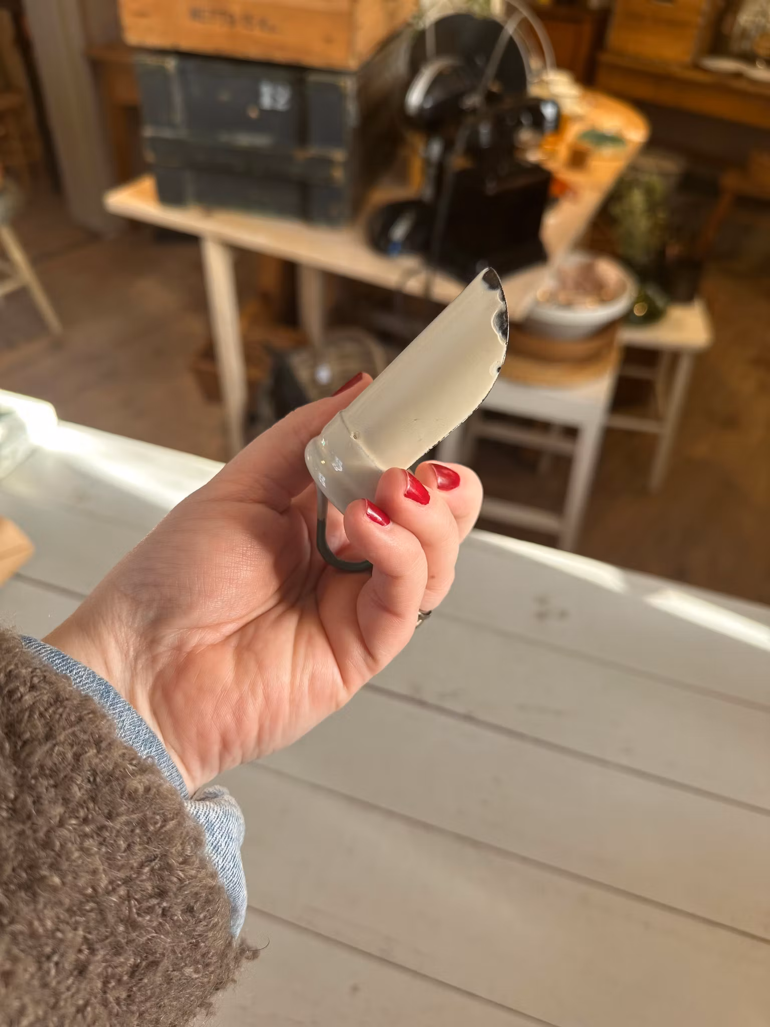 Underbar liten emaljerad skopa i ljusgult/grönt. Omärkt.
