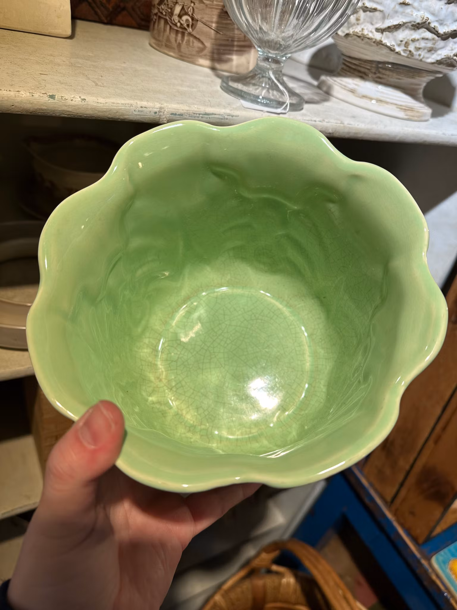 Engelsk kruka i ljusgrönt 240 kr Fin engelsk kruka i ljusggrönt med form av blad utanpå. I gott använt skick. Glasyren är åldrad inuti och utanpå. Mått ca 14,5*18cm. Produkten är tyvärr slut i lager. Dela Information om produkten Fin engelsk kruka i ljusggrönt med form av blad utanpå.I gott använt skick. Glasyren är åldrad inuti och utanpå.Mått ca 14,5*18cm.