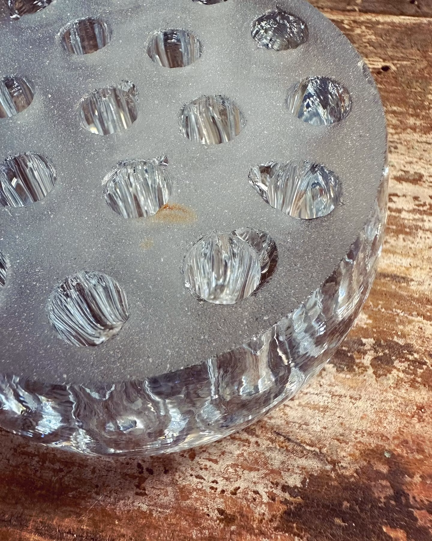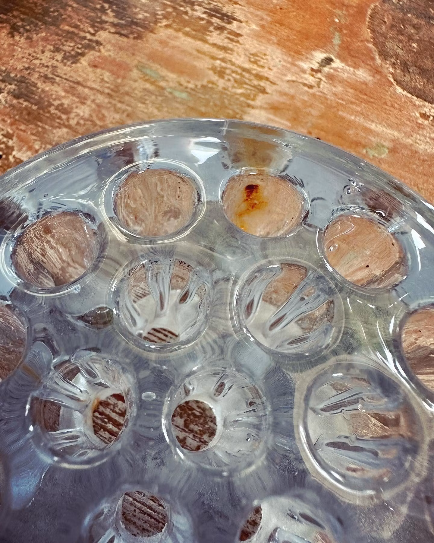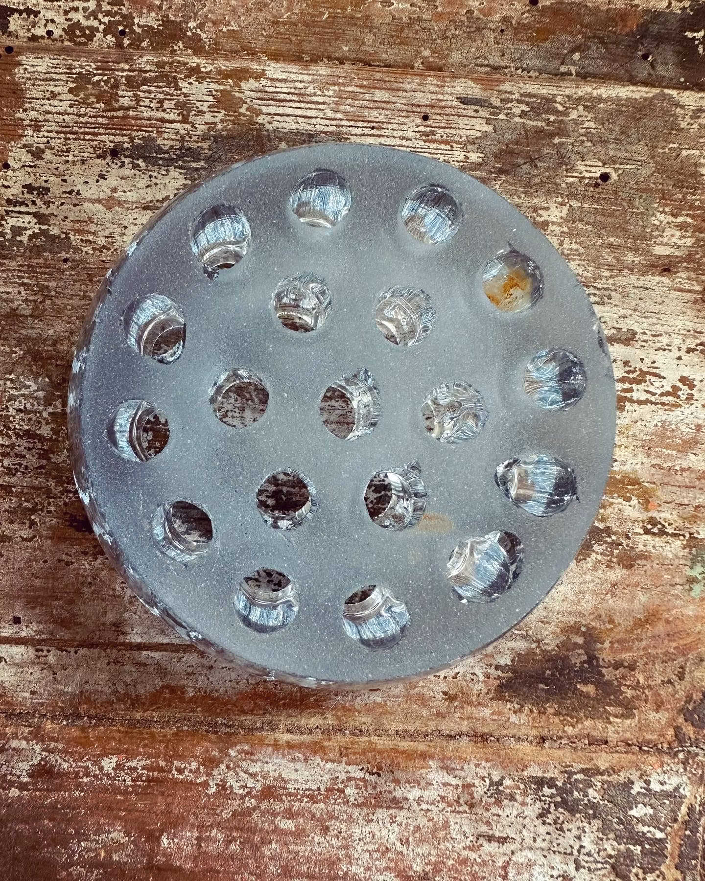 Gammal fin fakir i lite ljusblå/grå glas. I gott åldrat och använt skick. Någon rostfläck och små små avslag undertill på ett par ställe. Se bilder.&nb