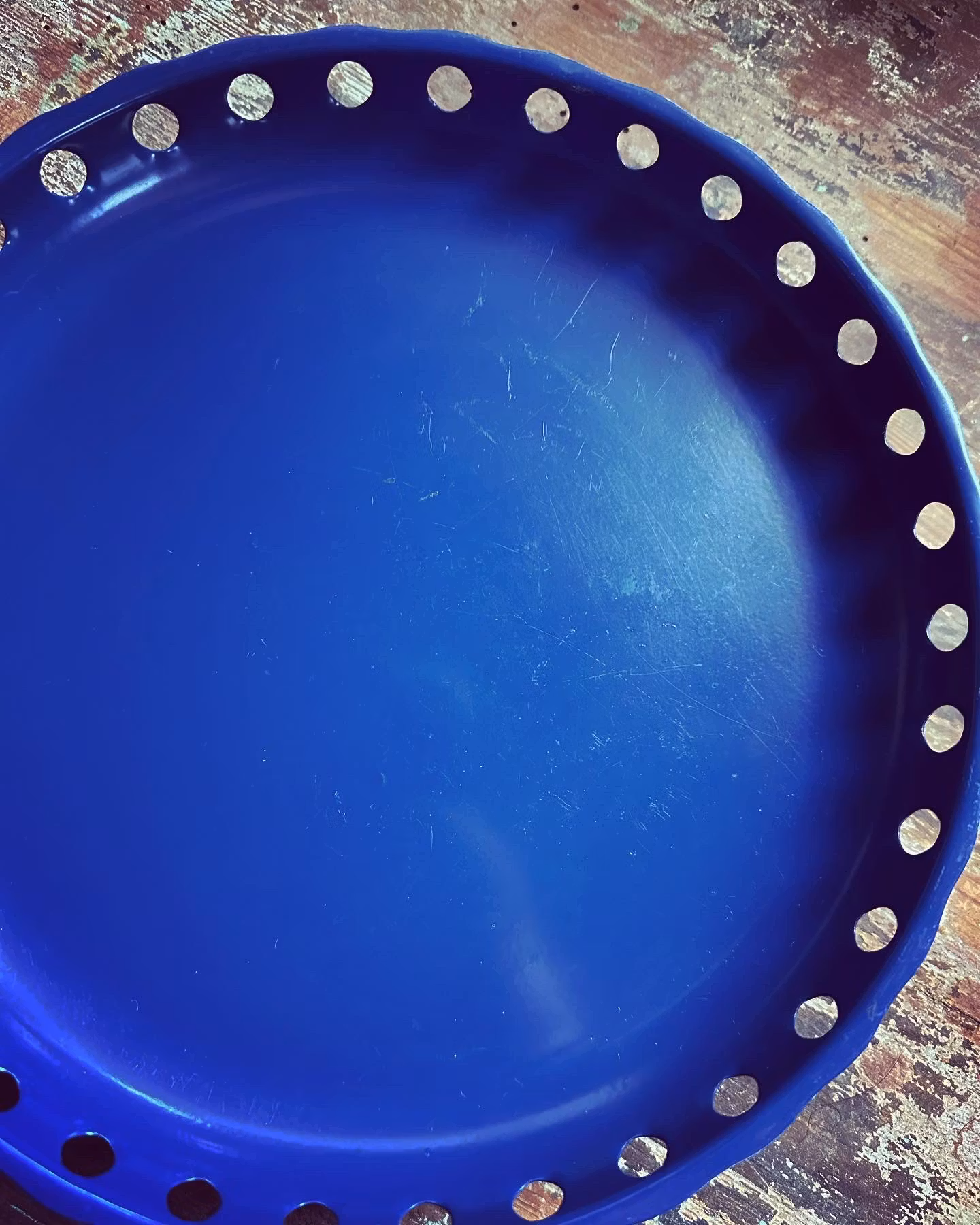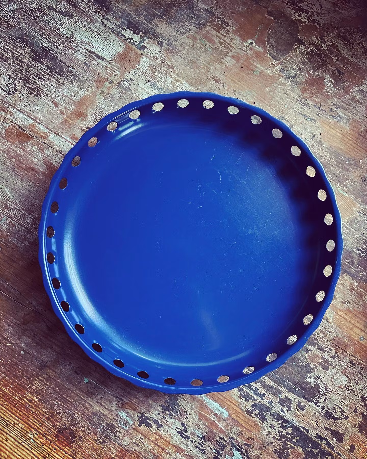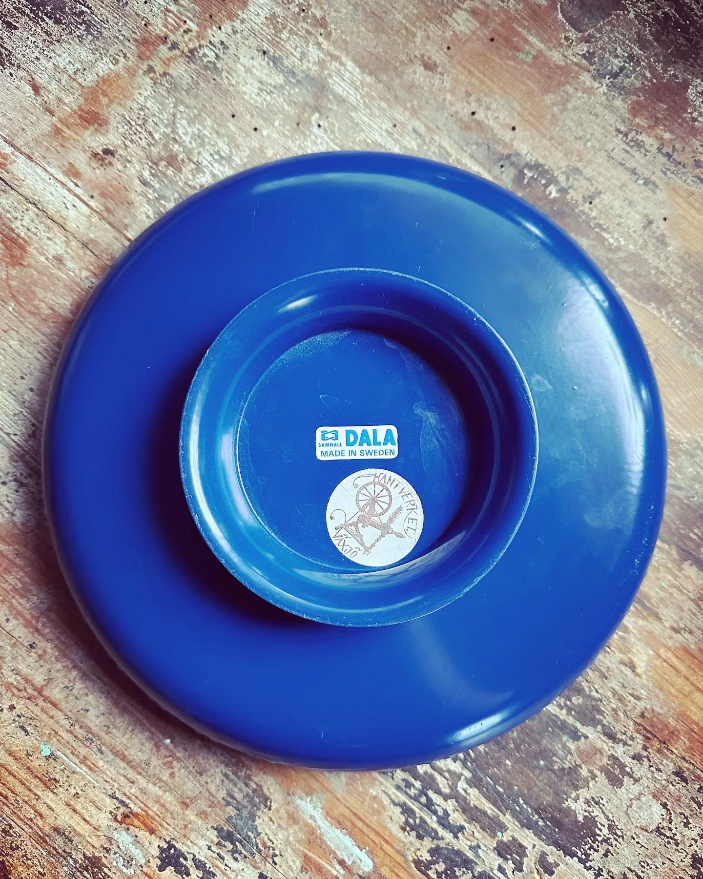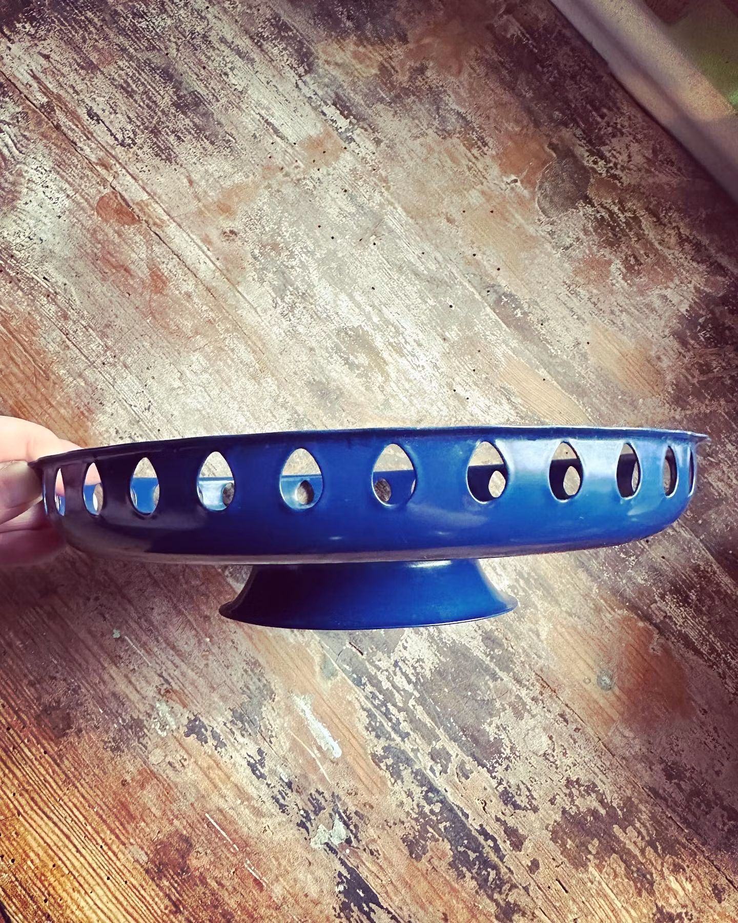 Fint svensktillverkat fat på fot gjort i metall i blå färg. Perfekt som kakfat till fikat eller för frukt eller liknande.