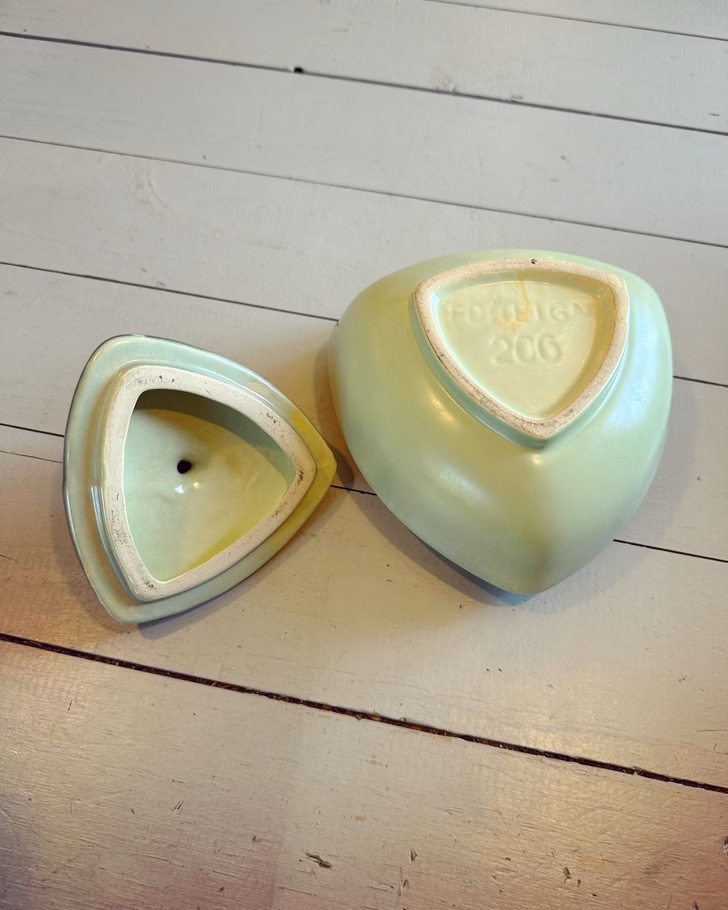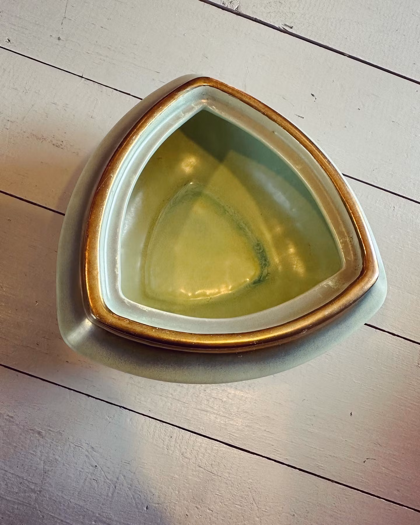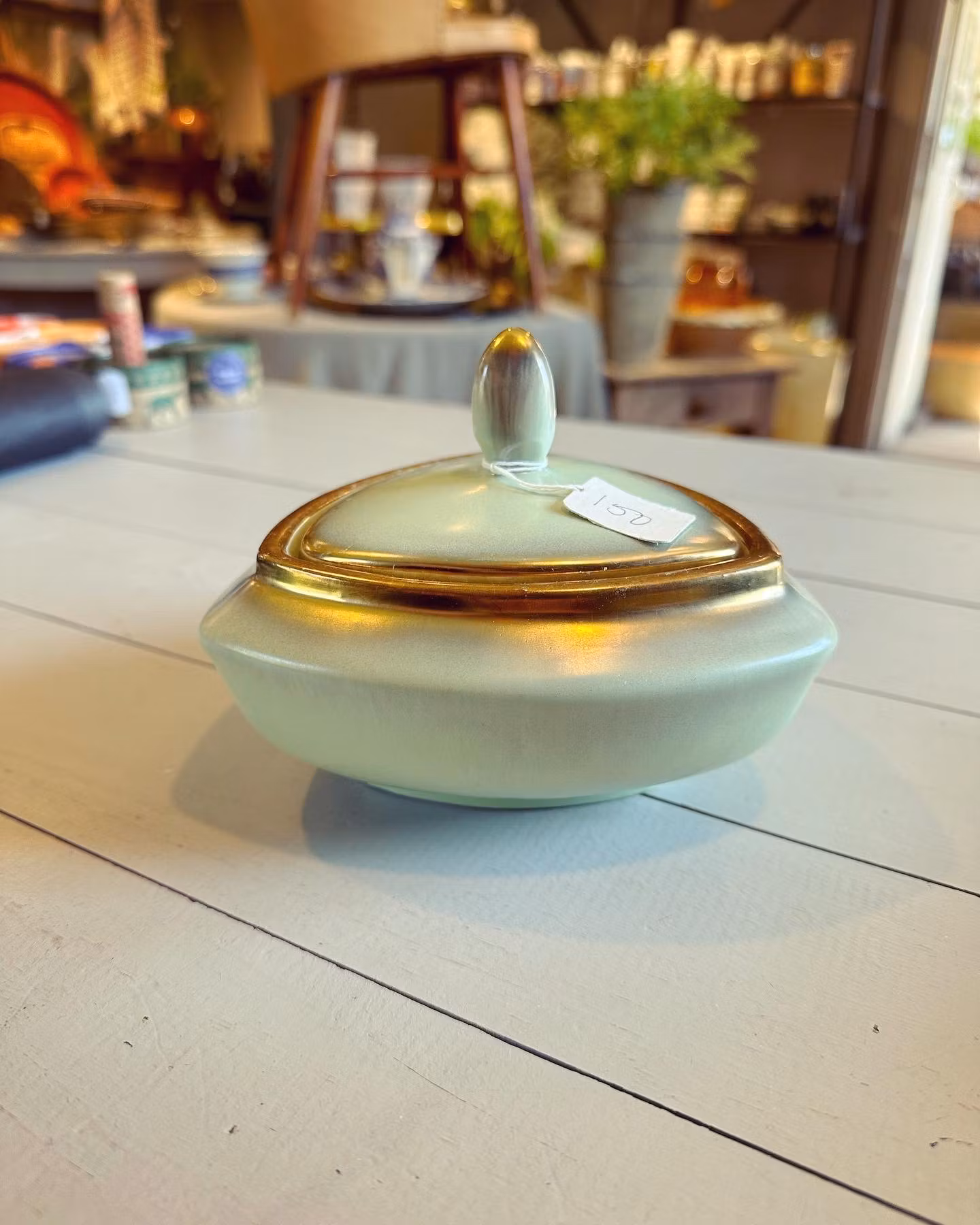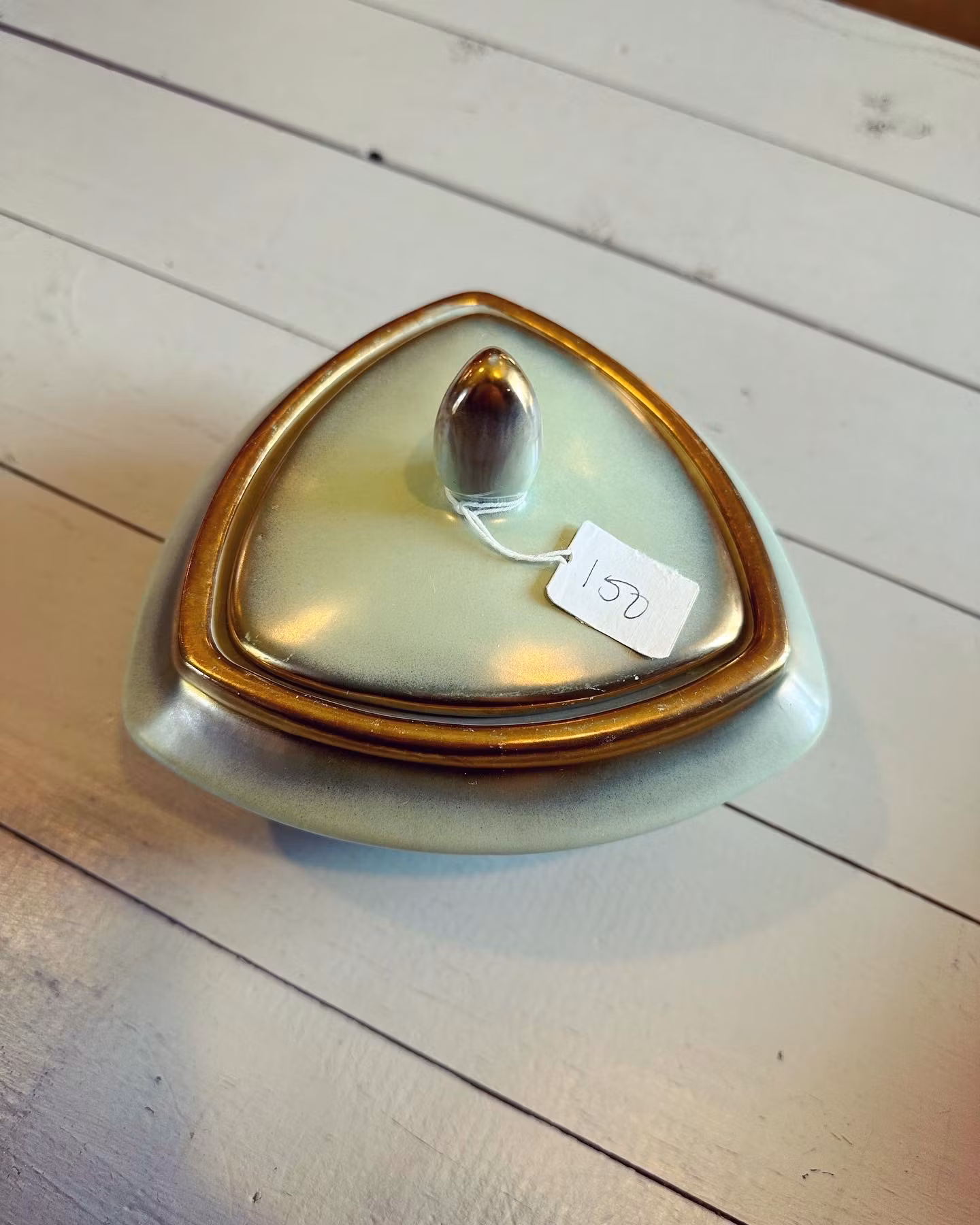 Underbar ljust grön ask med lock i porslin med guldfärgad dekor längs kanten.
