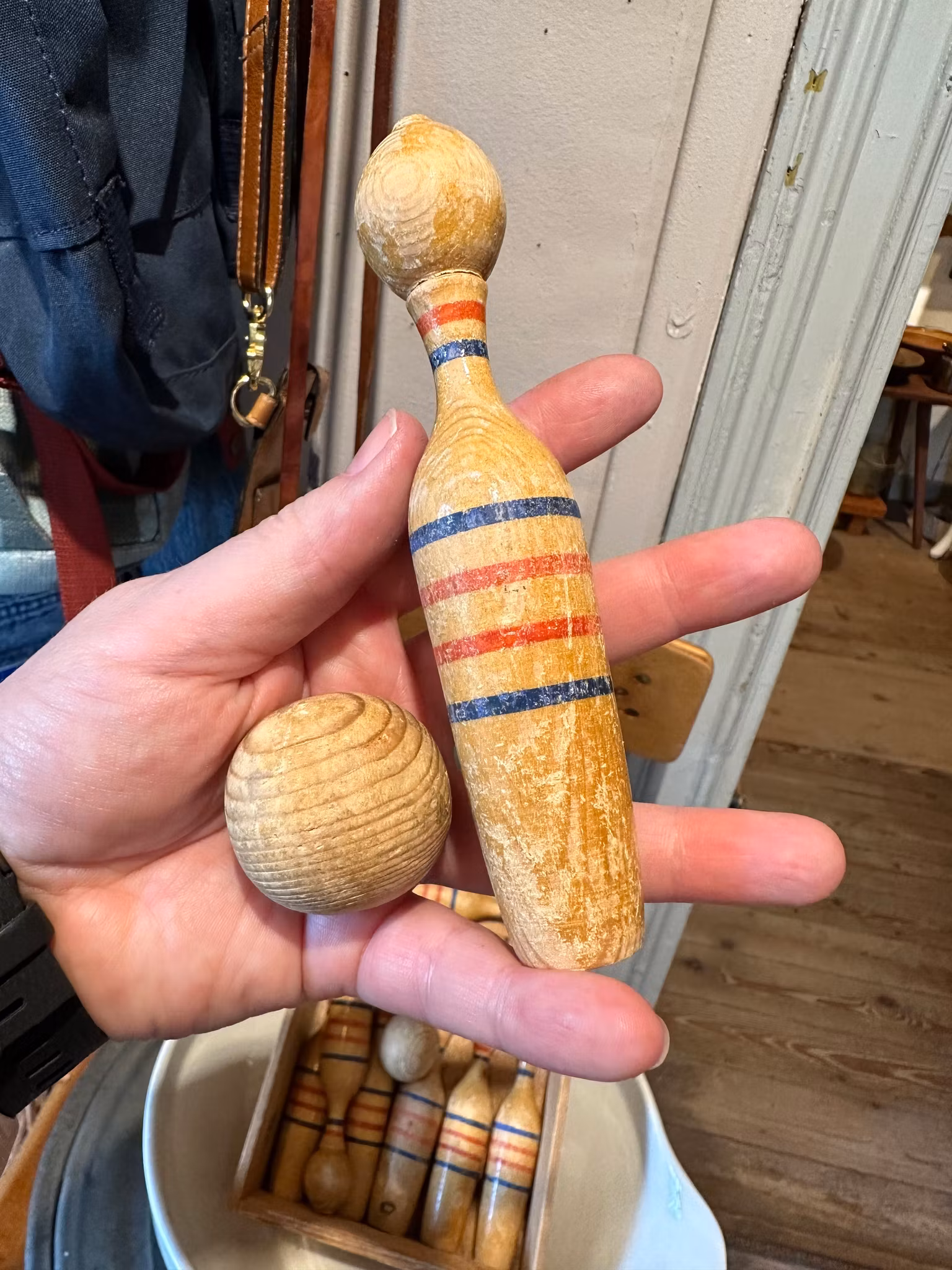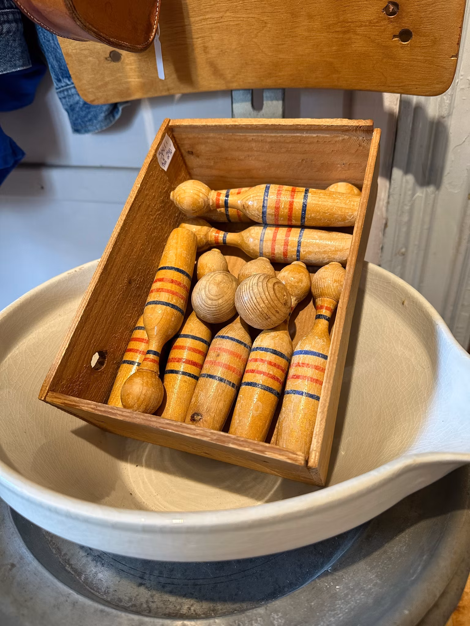 Gammalt charmigt kägelspel i trä med några klot. Kan vara så att det fattas en kägla men går fint att använda enda såklart.