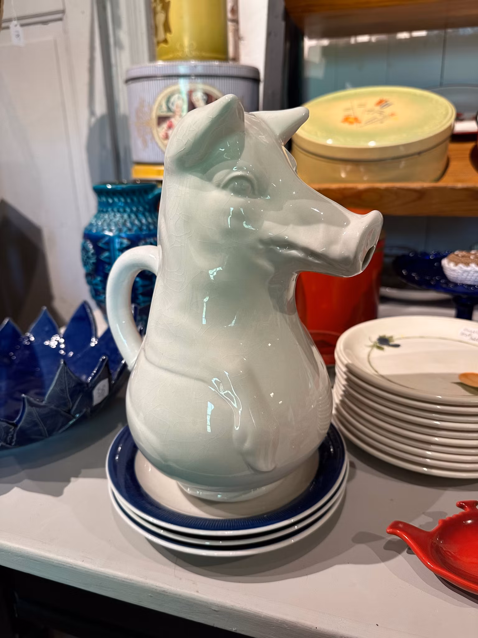 Charmig kanna i form av en gris från engelska Burleigh. I gott använt och åldrat skick. Spår av användning och ålder över hela. Se bilder för skick. Höjd ca 2