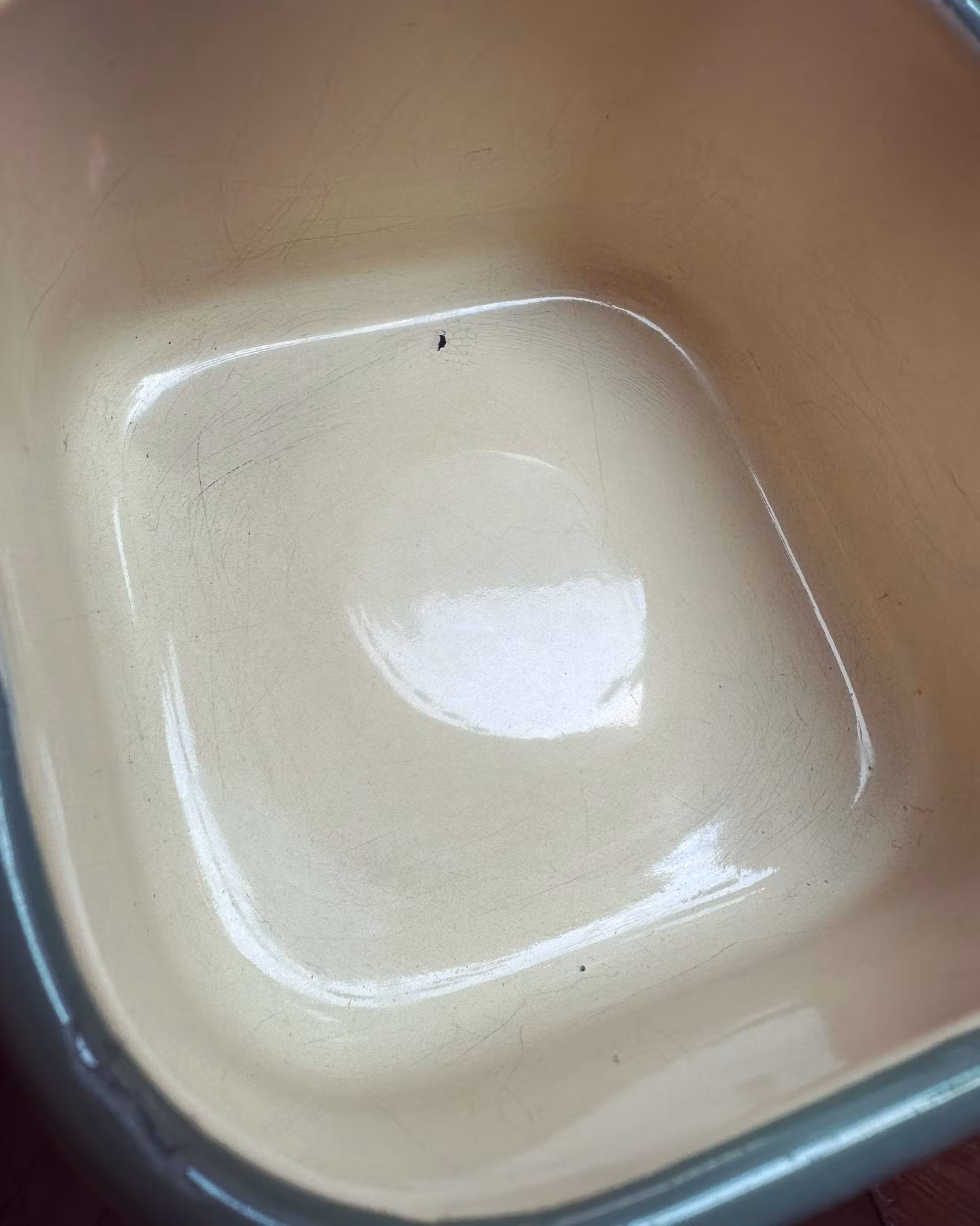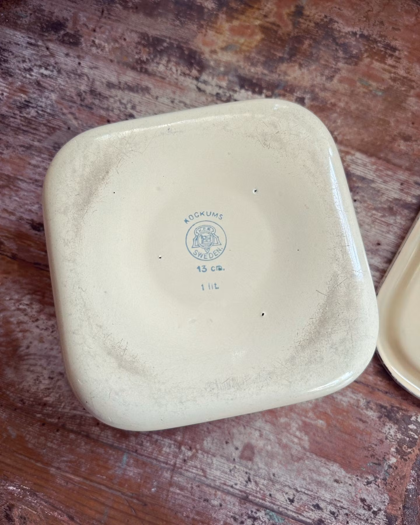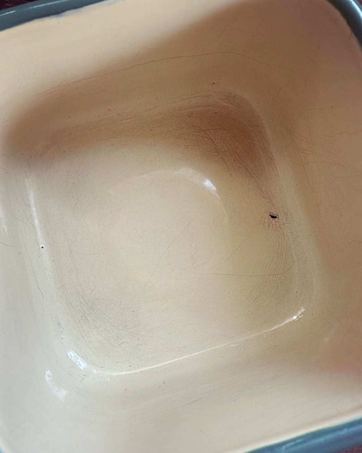 I väl använt och åldrat skick. Några små avslag längs kanten och ett inuti. Lite krackelerad inuti, se bilder.