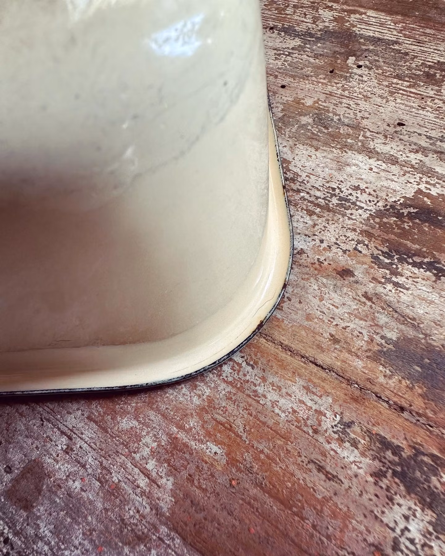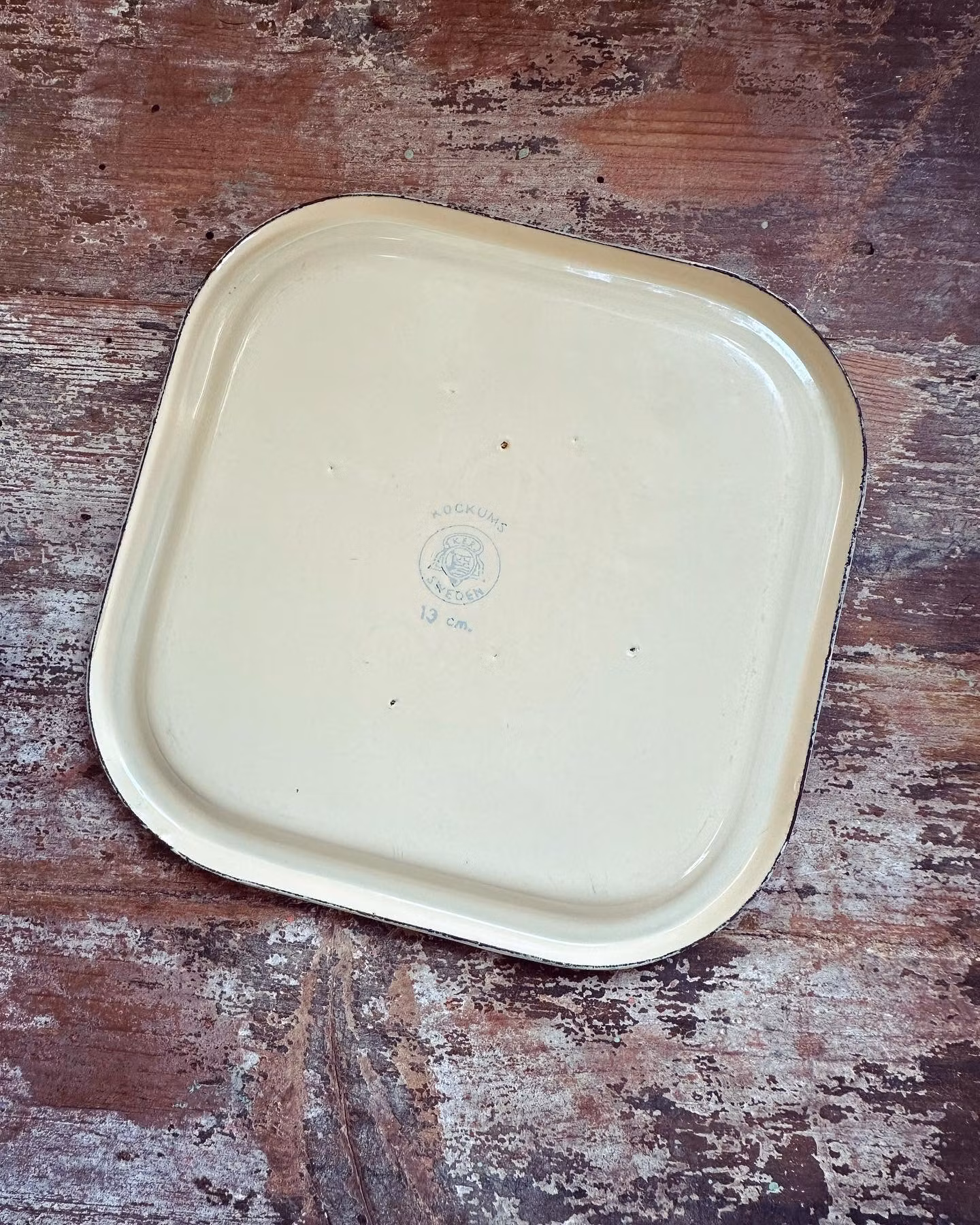 Gammal fin emaljerad burk med lock från svenska Kockums i klassiska ljusgula färgen med grön kant.