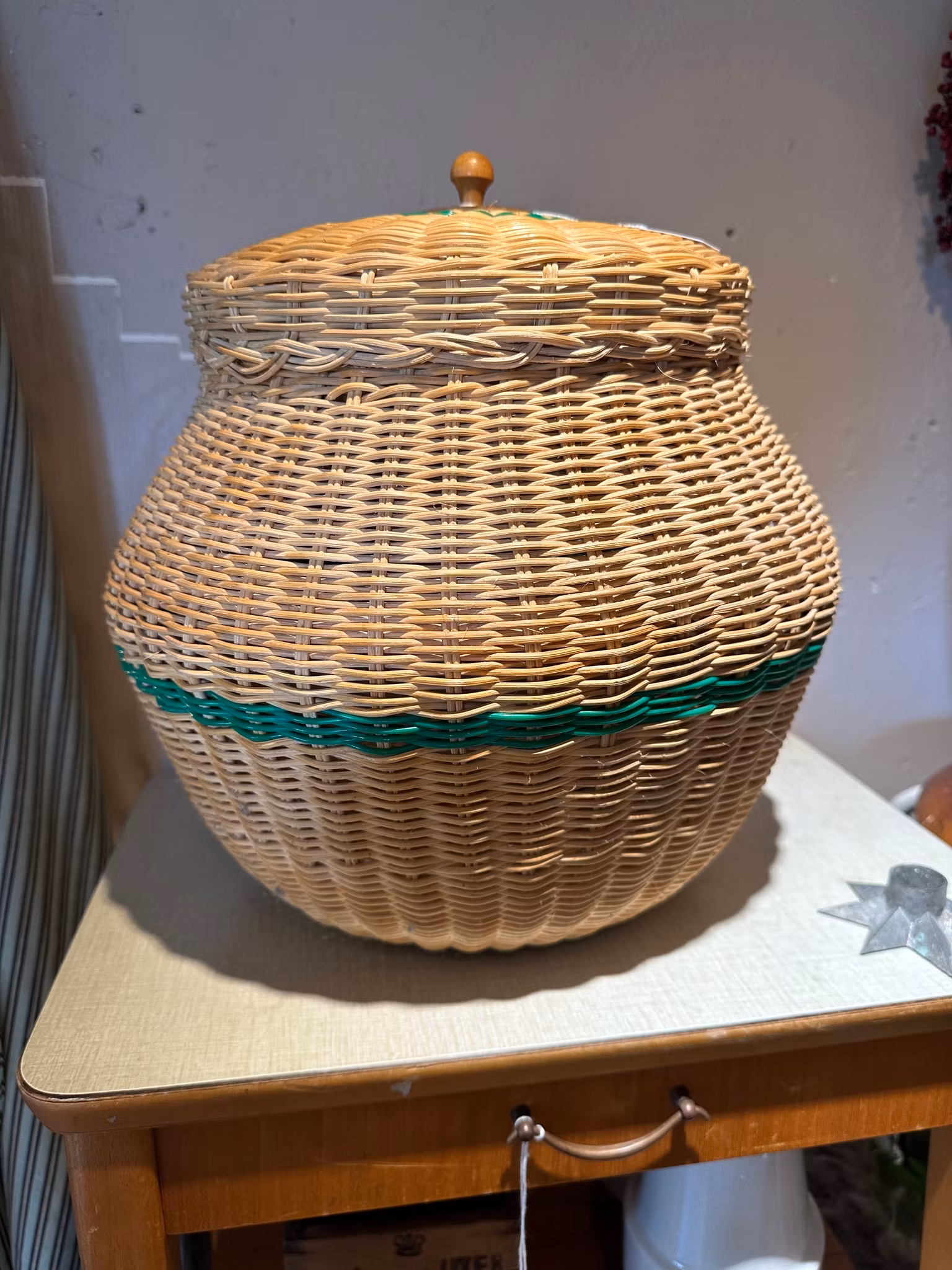 Korg med lock i naturmaterial med gröna detaljer i plast. Bottnen i trä.