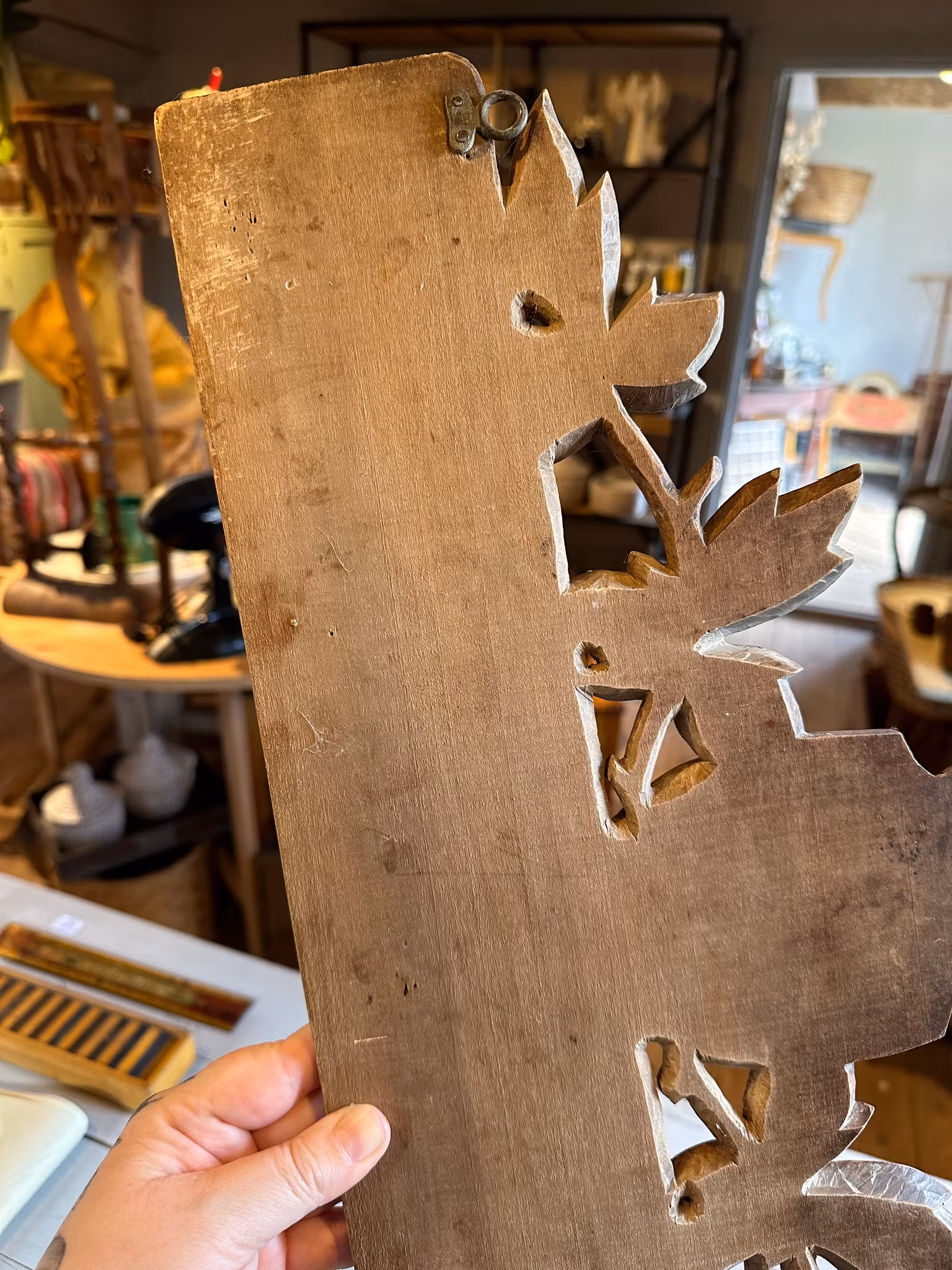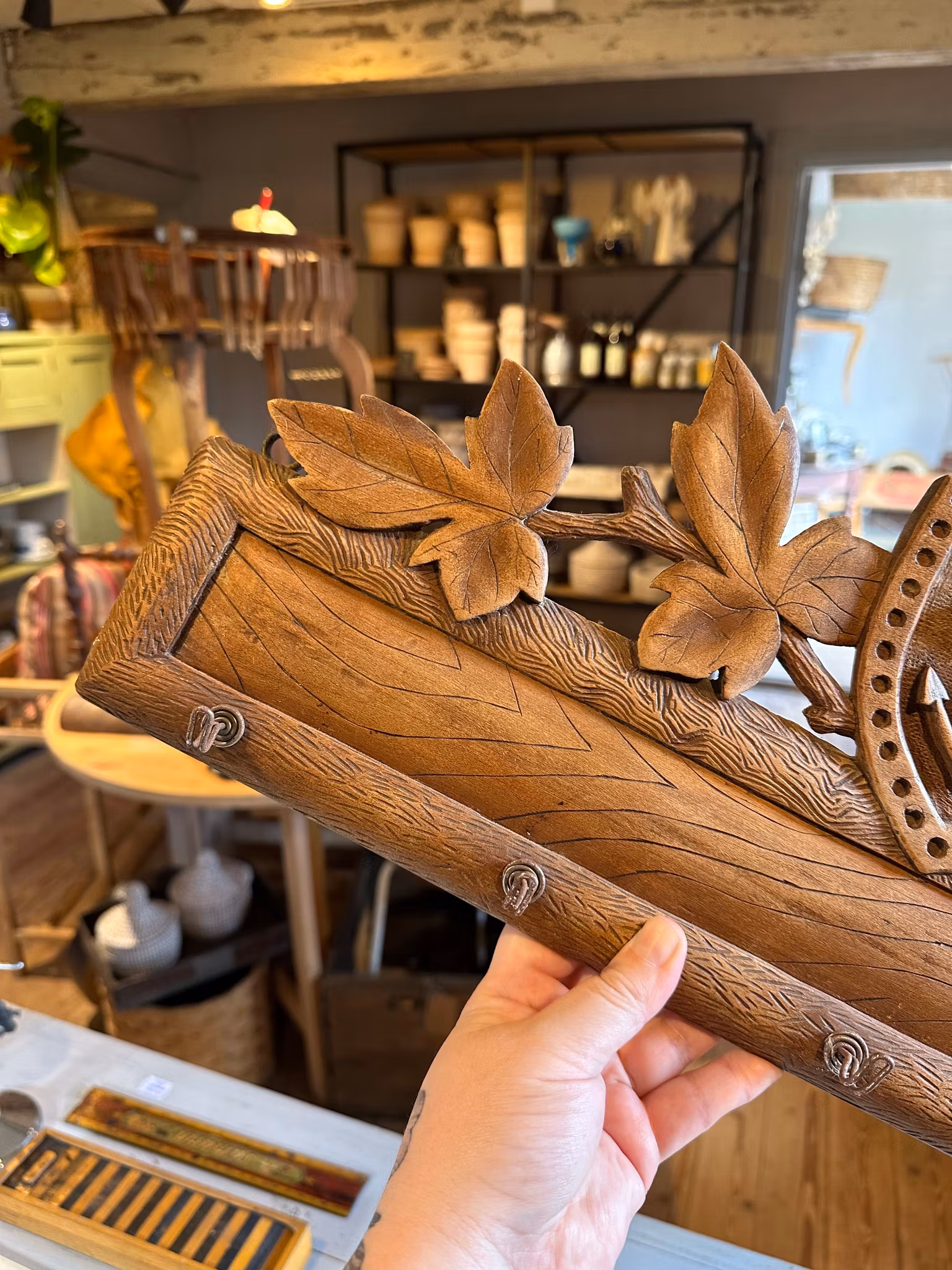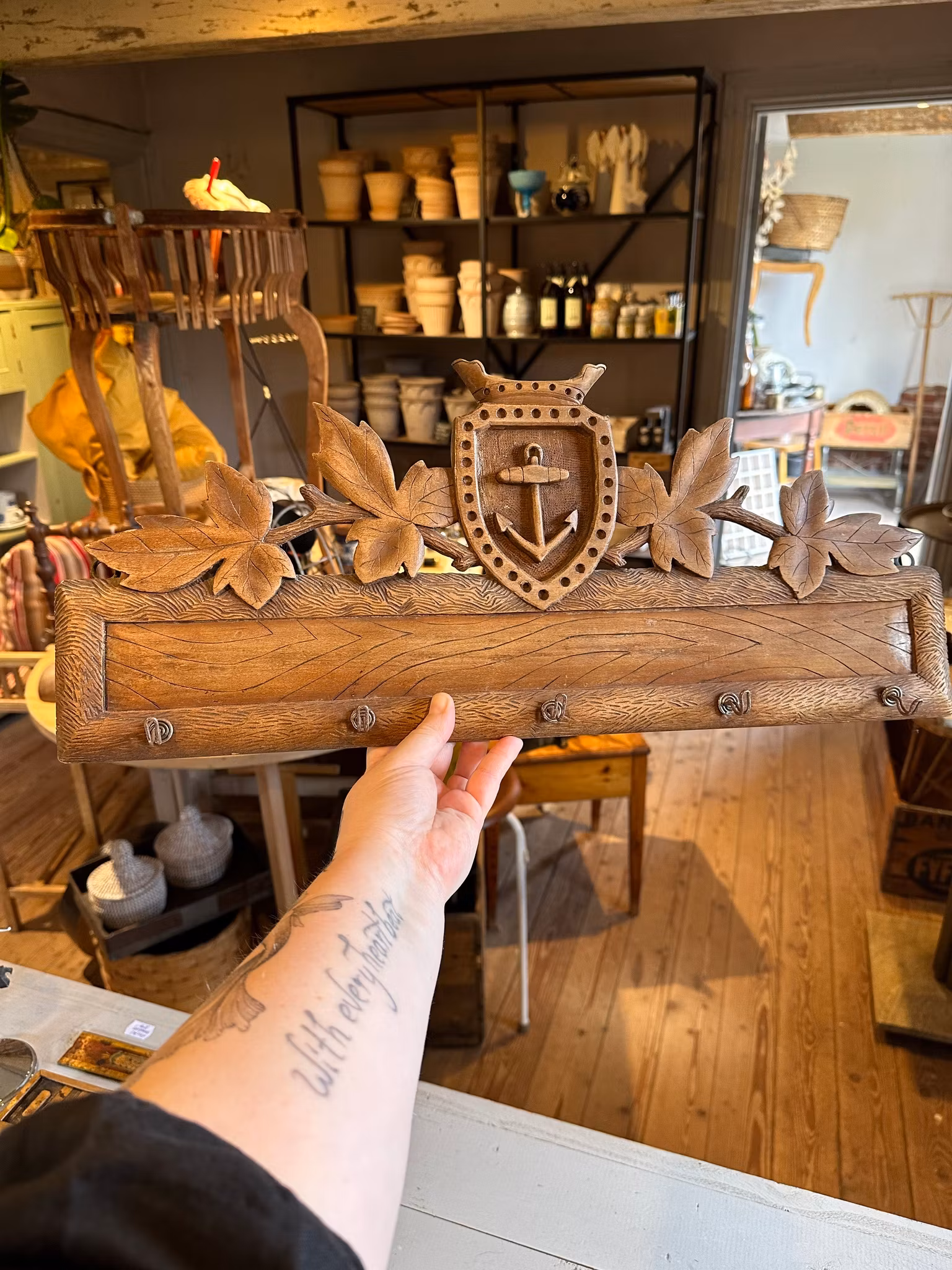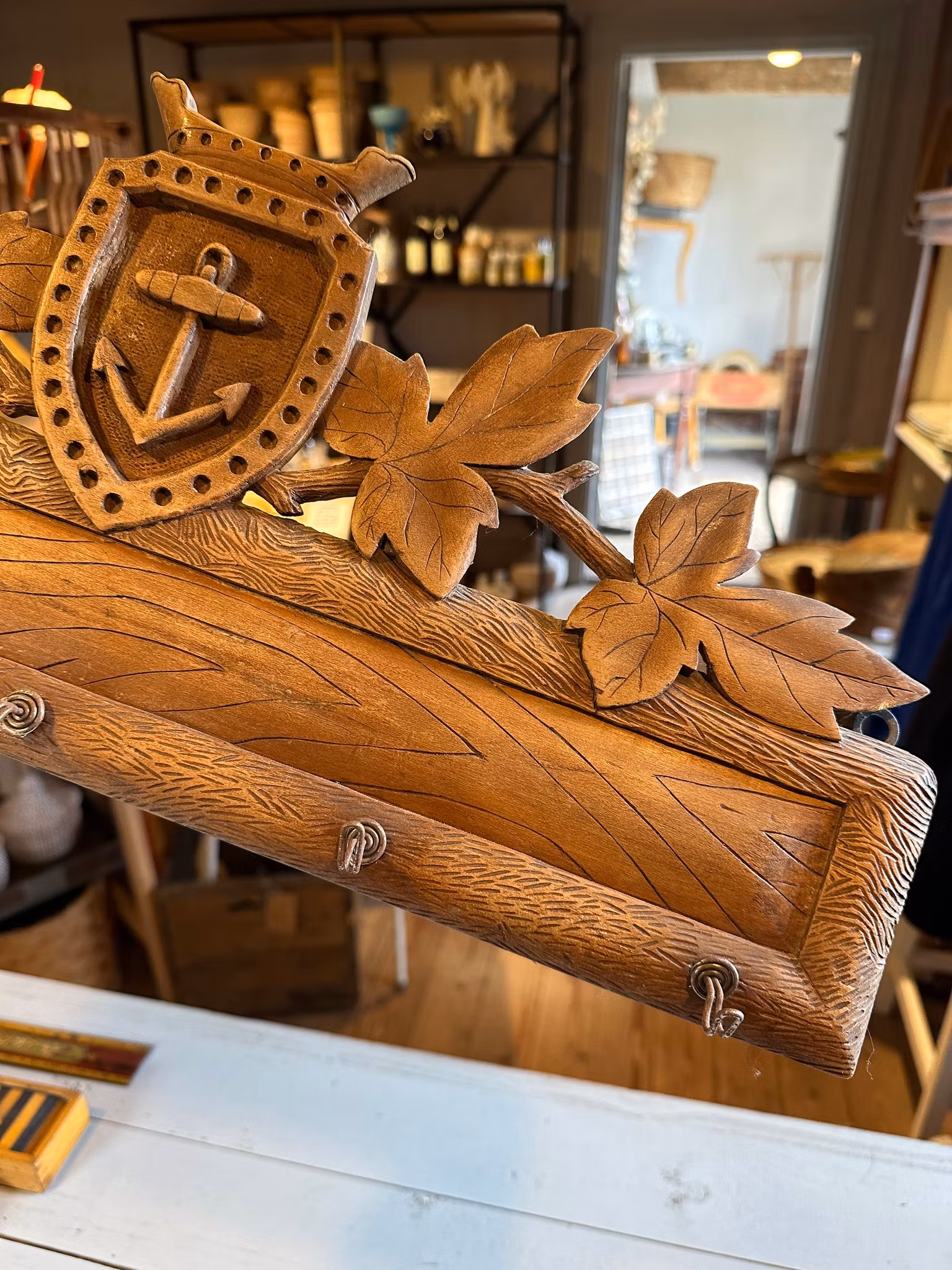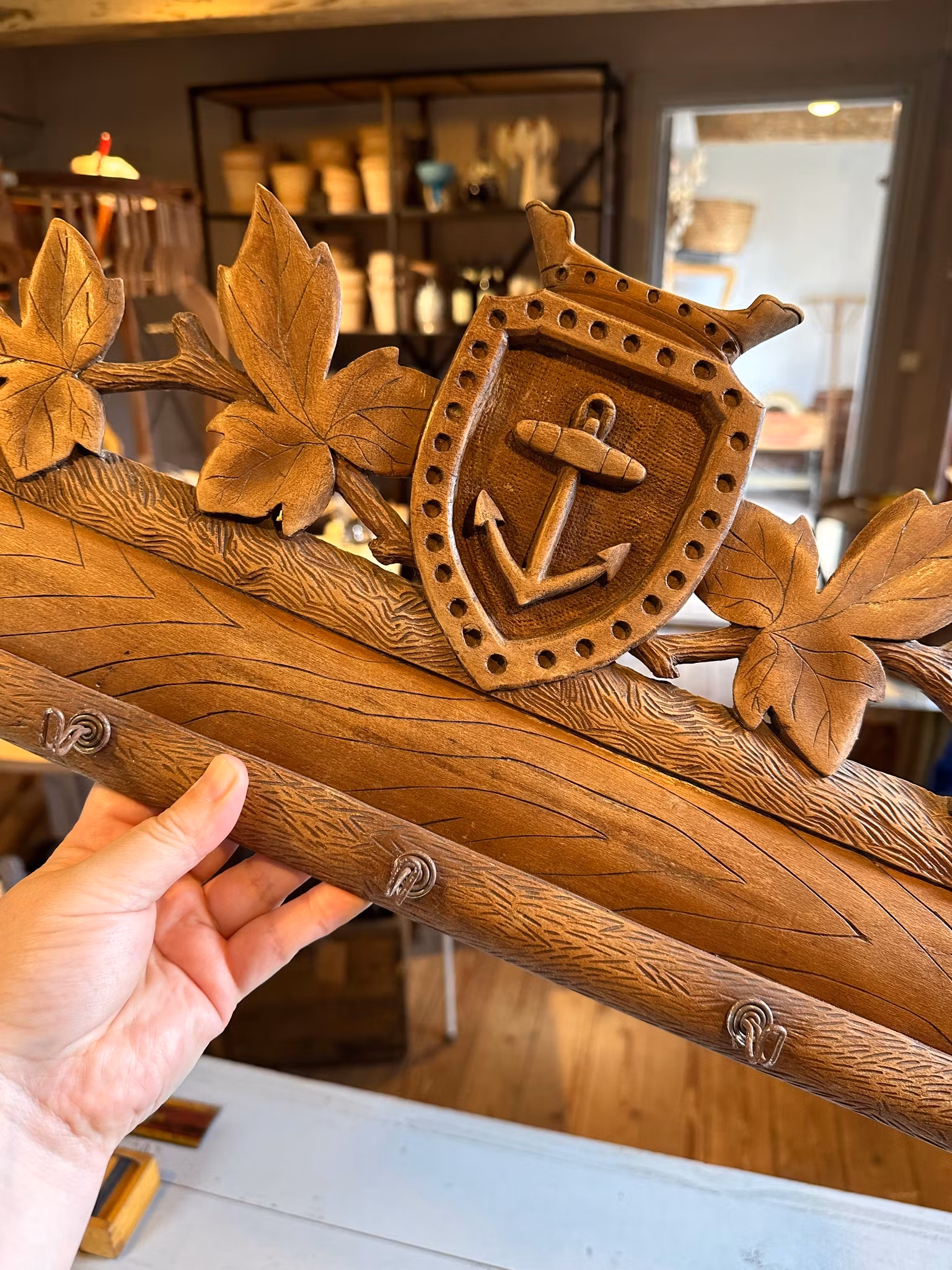 Fin gammal kroklist/hängare gjord i trä med ankare som dekoration och med små krokar i metall framtill. Upphängning baktill i ytterkanterna.