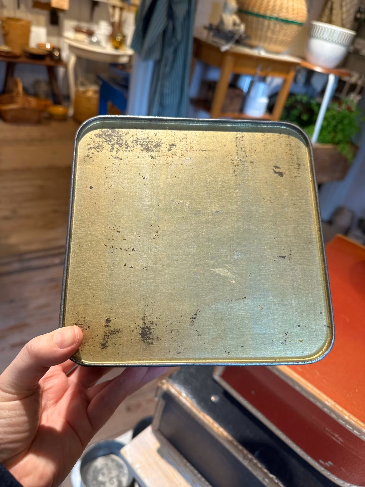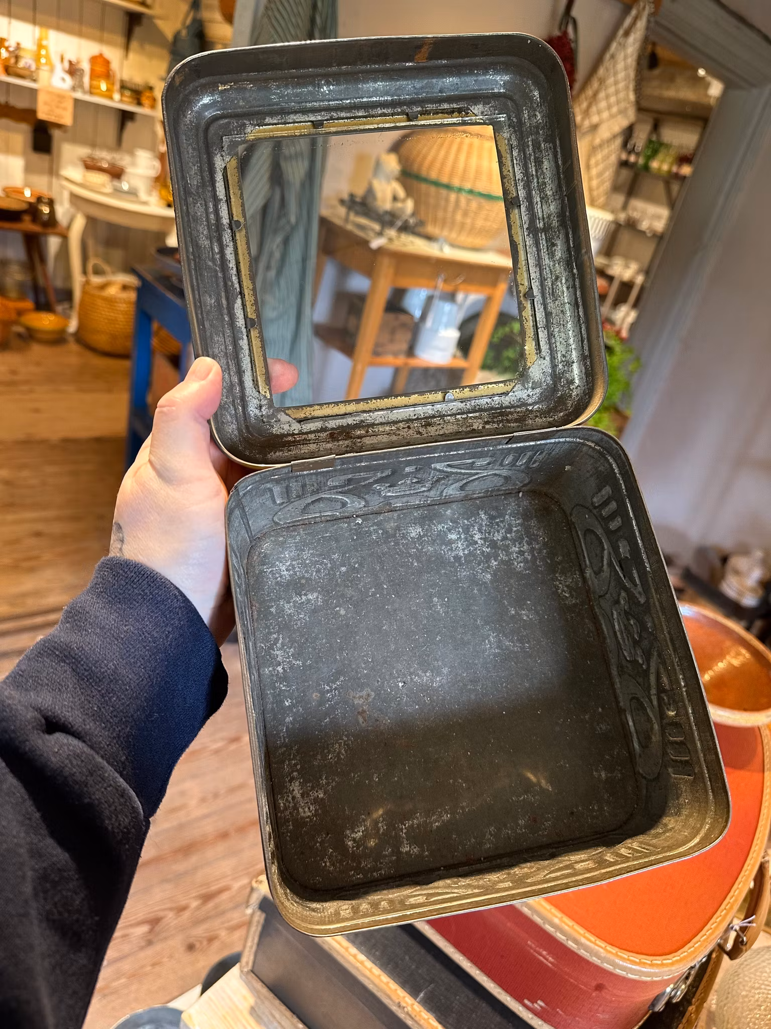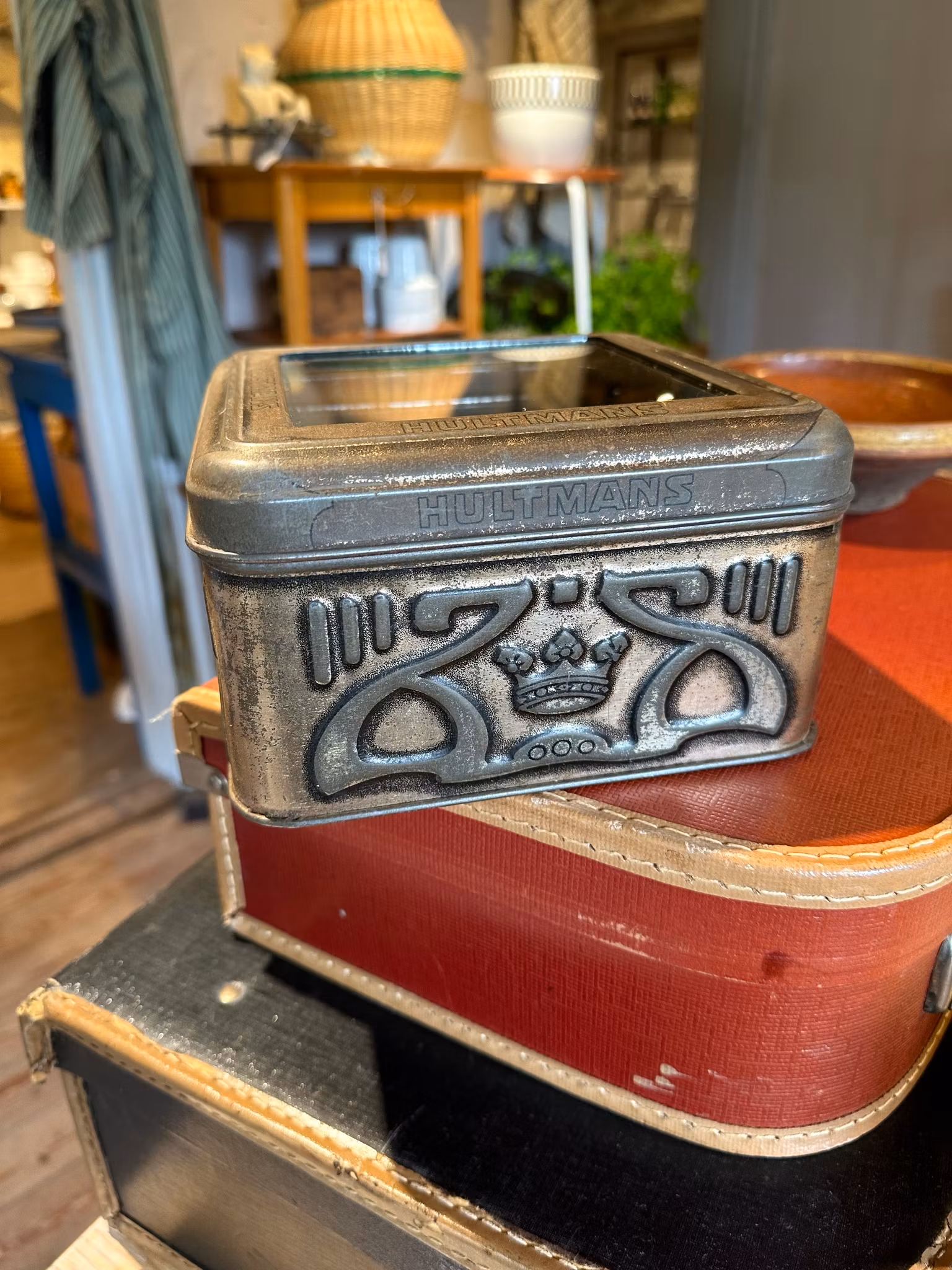 Söt lite mindre modell på plåtburk med glas i locket. Märkt Hultmans.