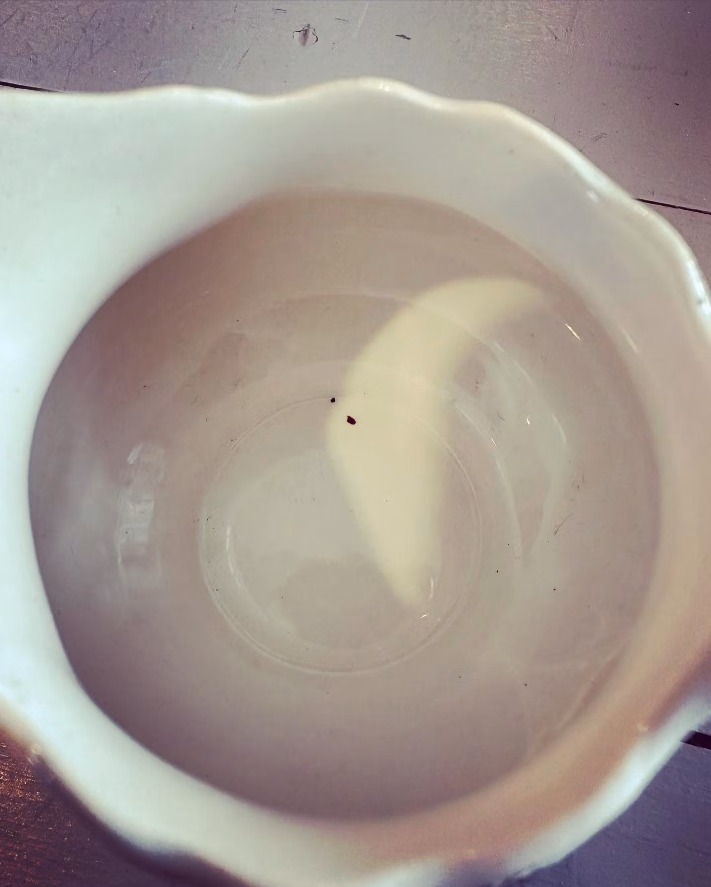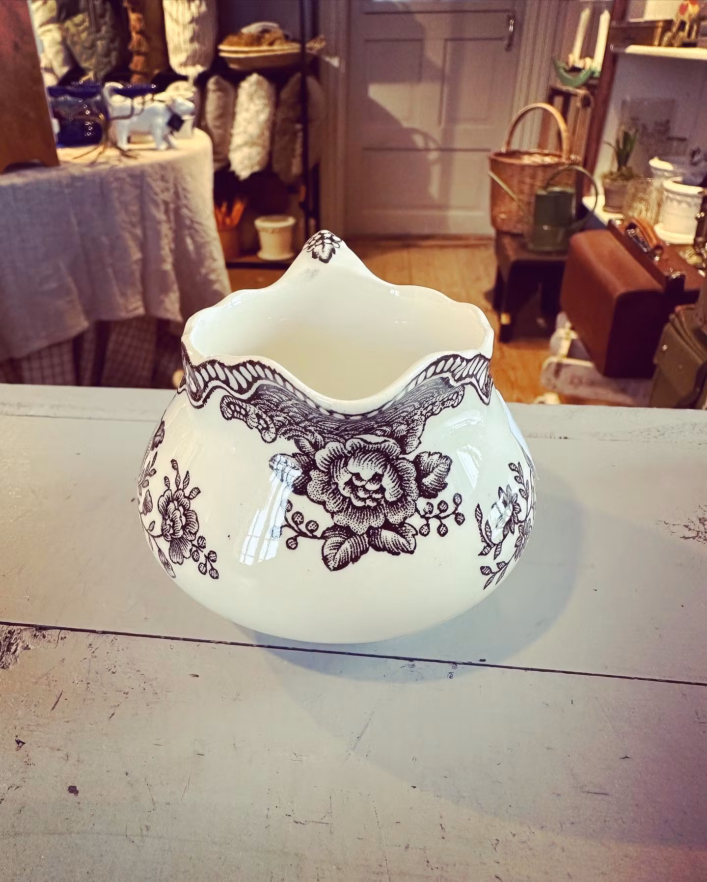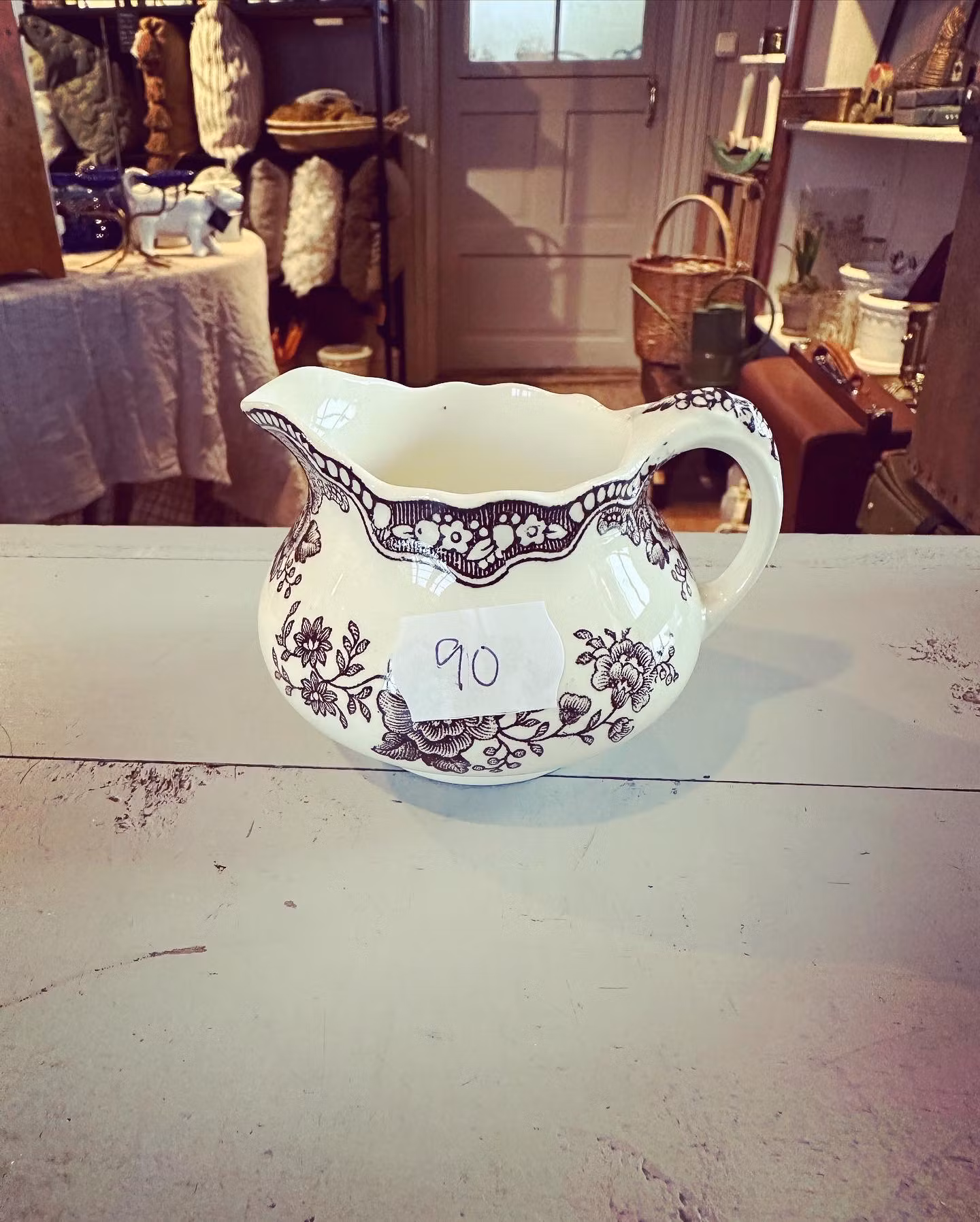 Liten engelsk kanna för typ grädde eller mjölk i vitt porslin med mörkbrunt mönster.