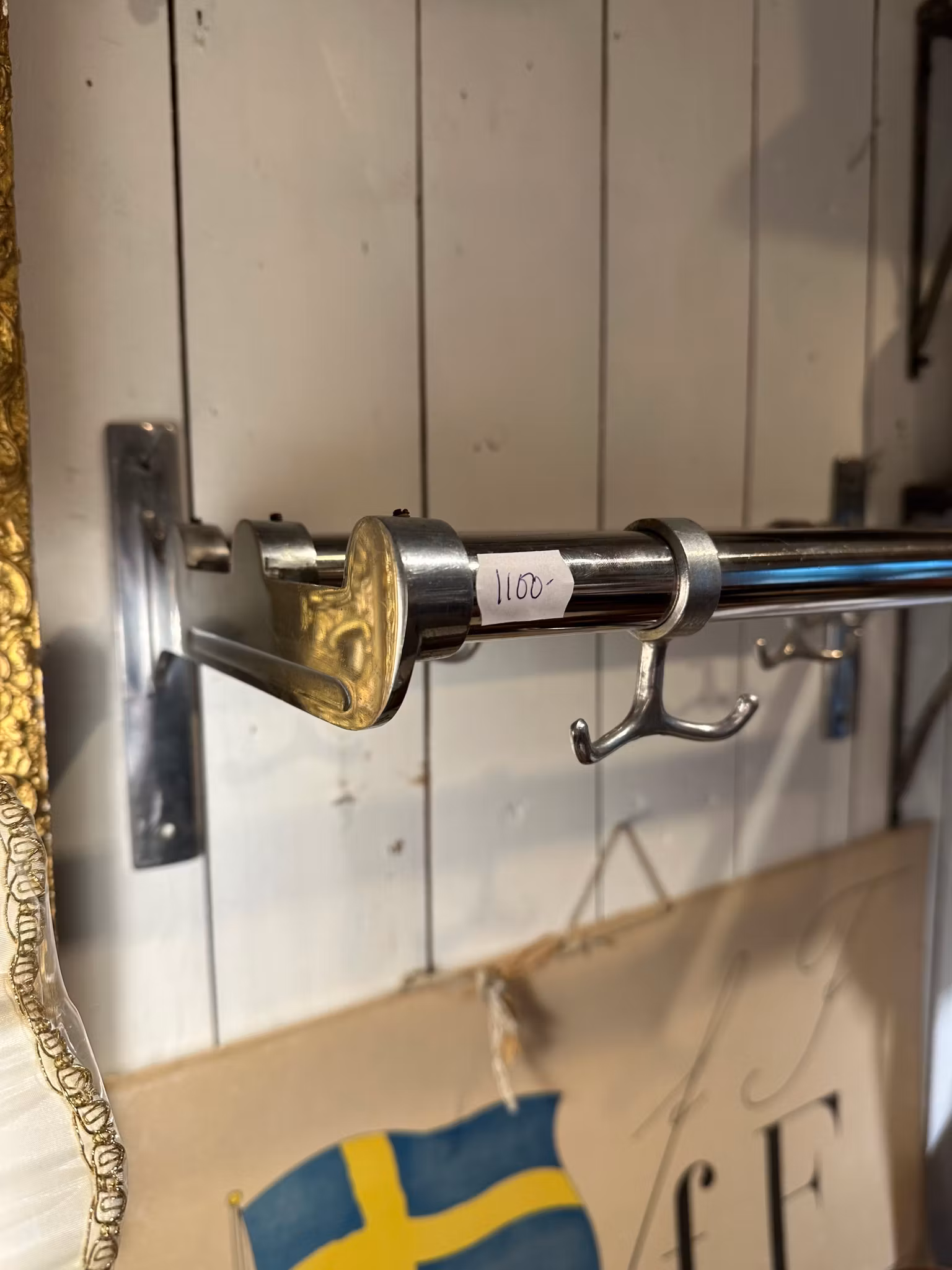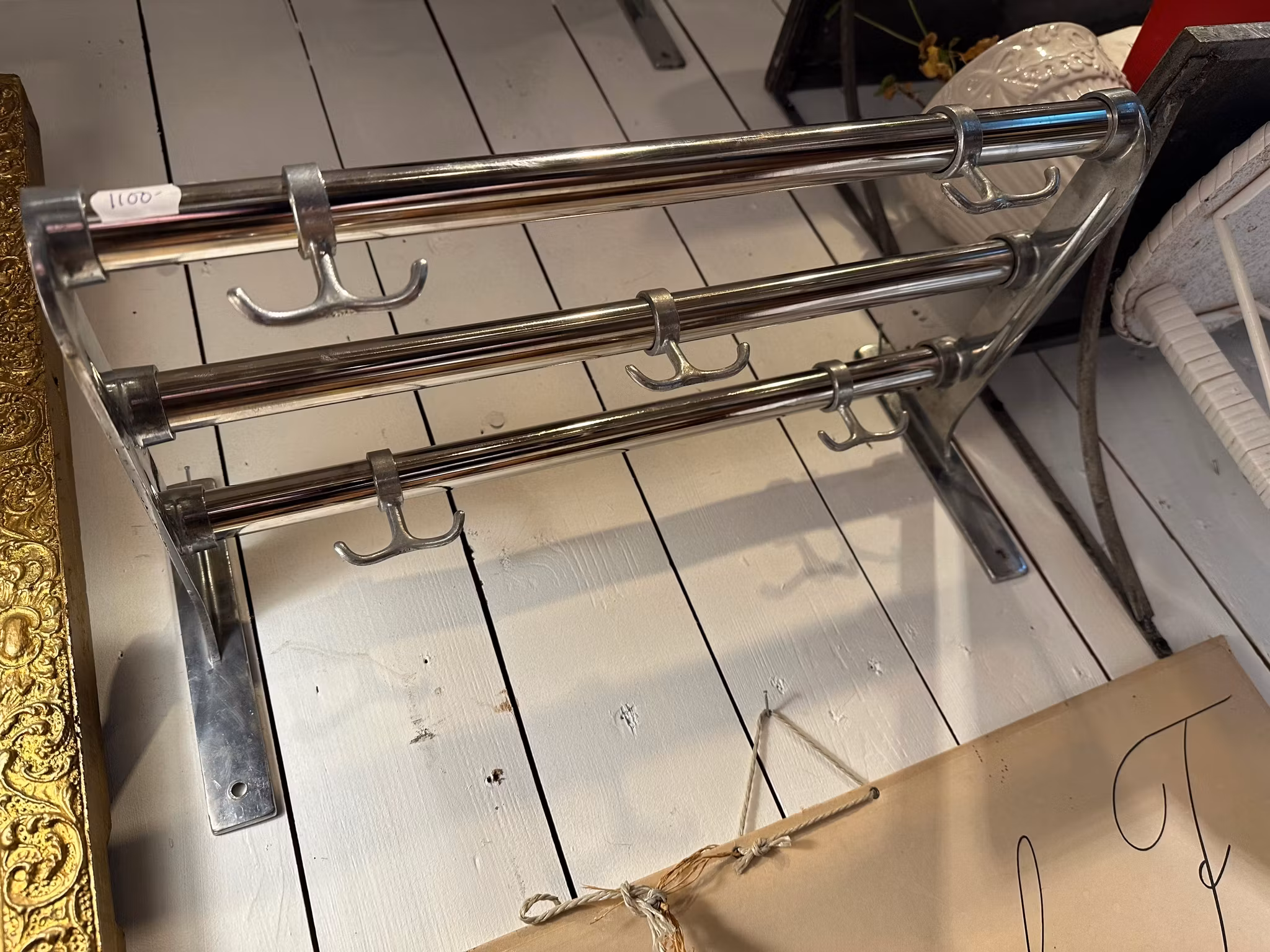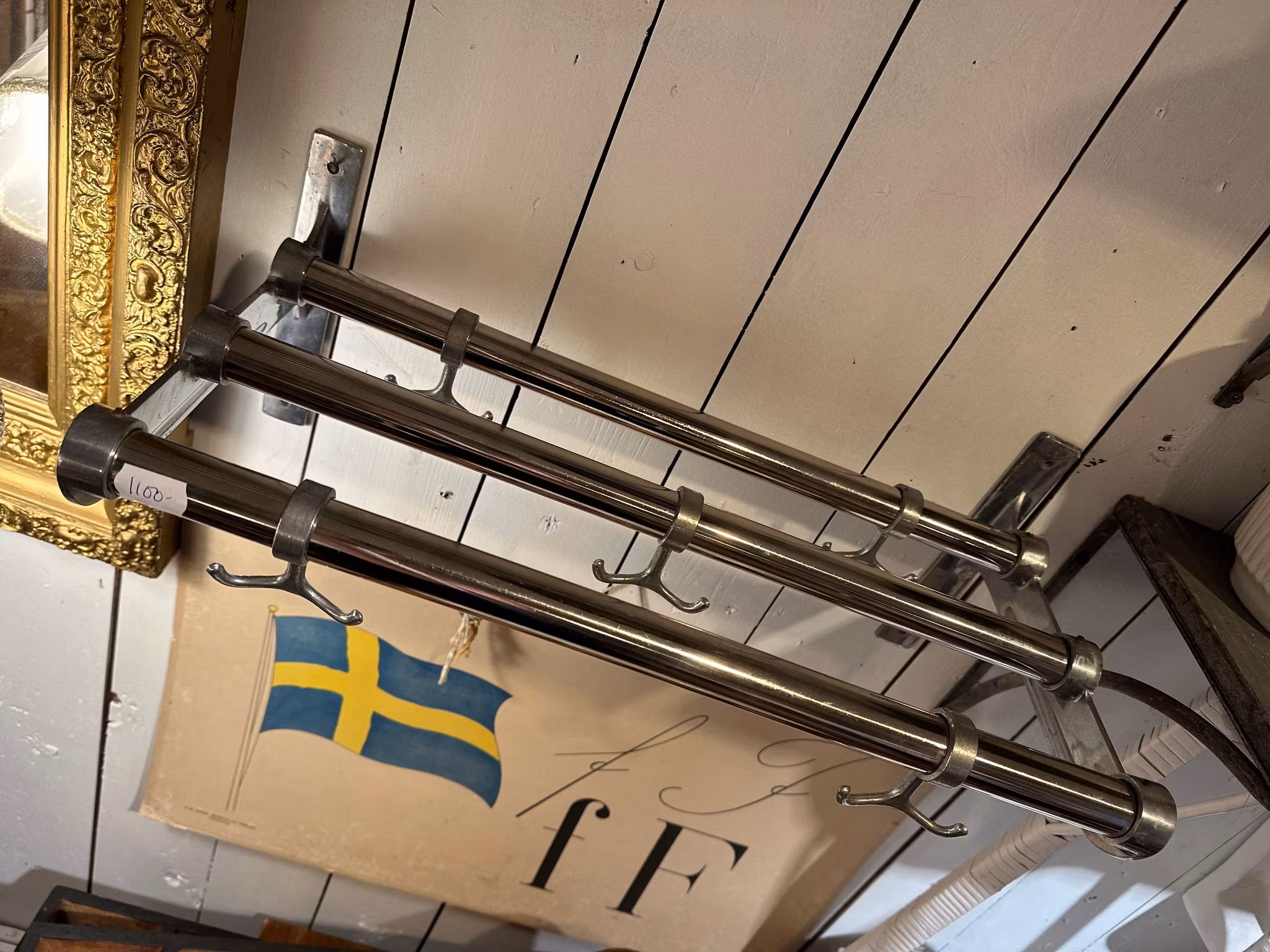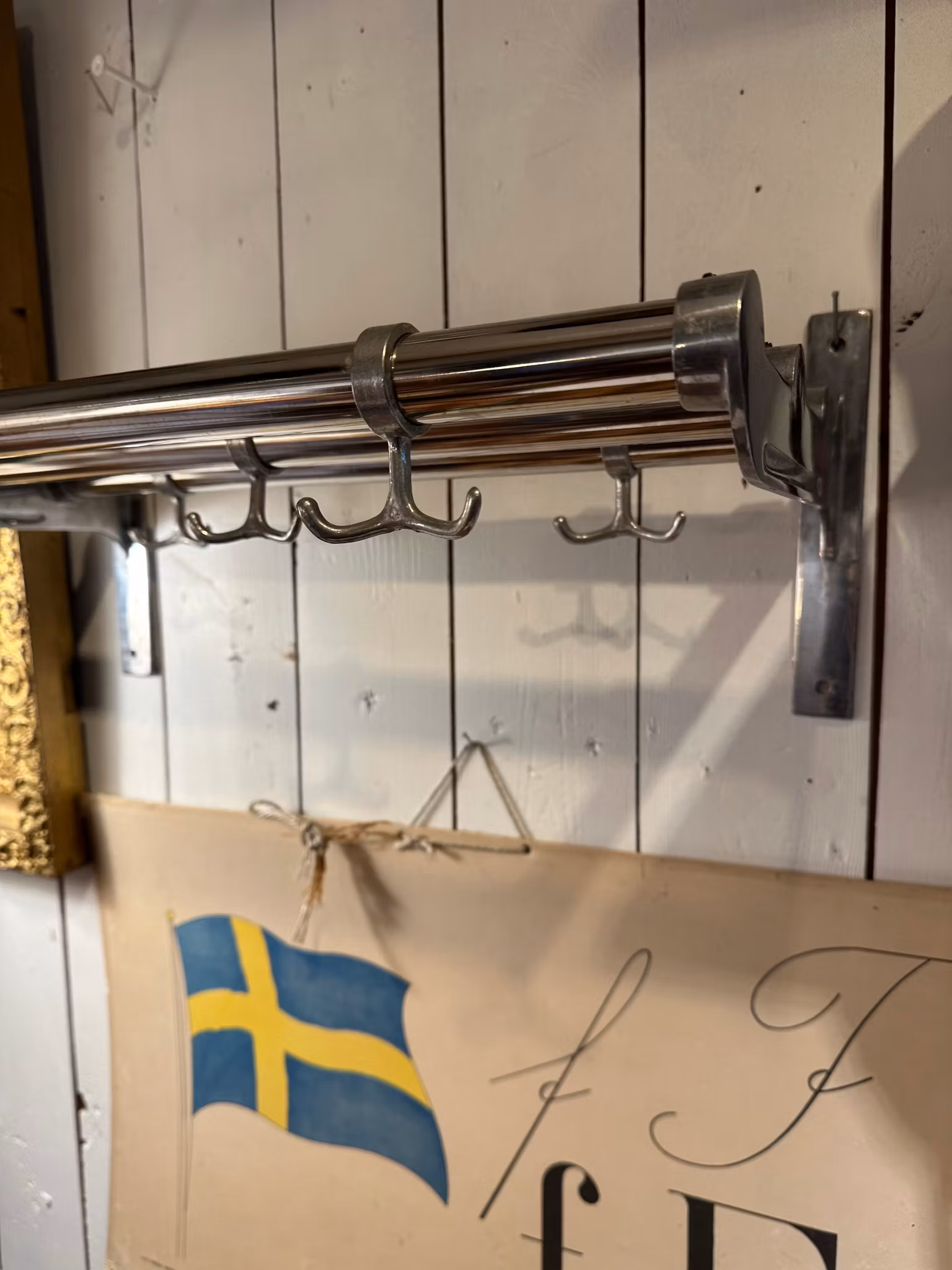 Vacker gammal hatthylla i klassisk stilren modell. Tidlös och väldigt fin design som håller! Tre stänger och fem stycken ankarkrokar.