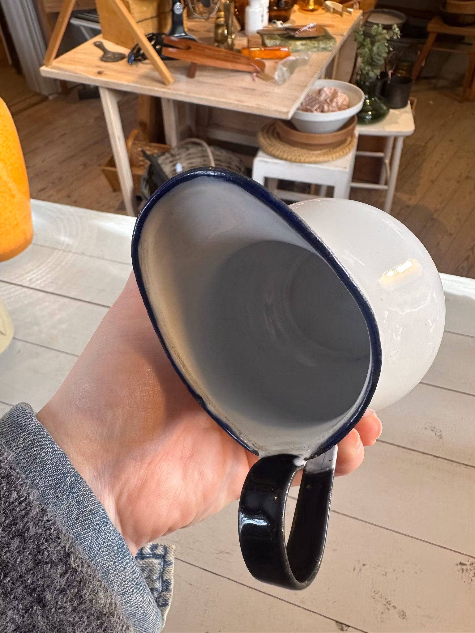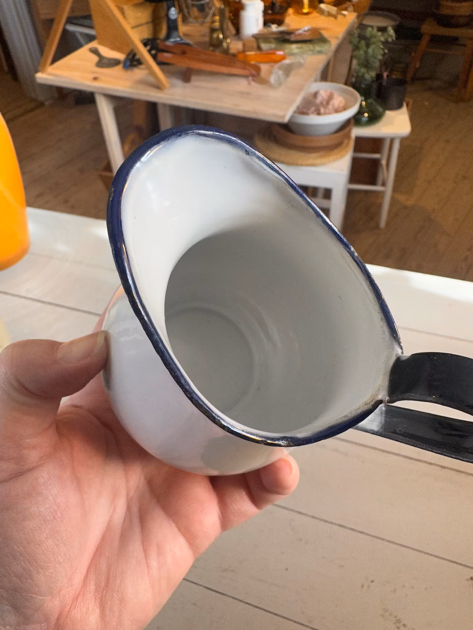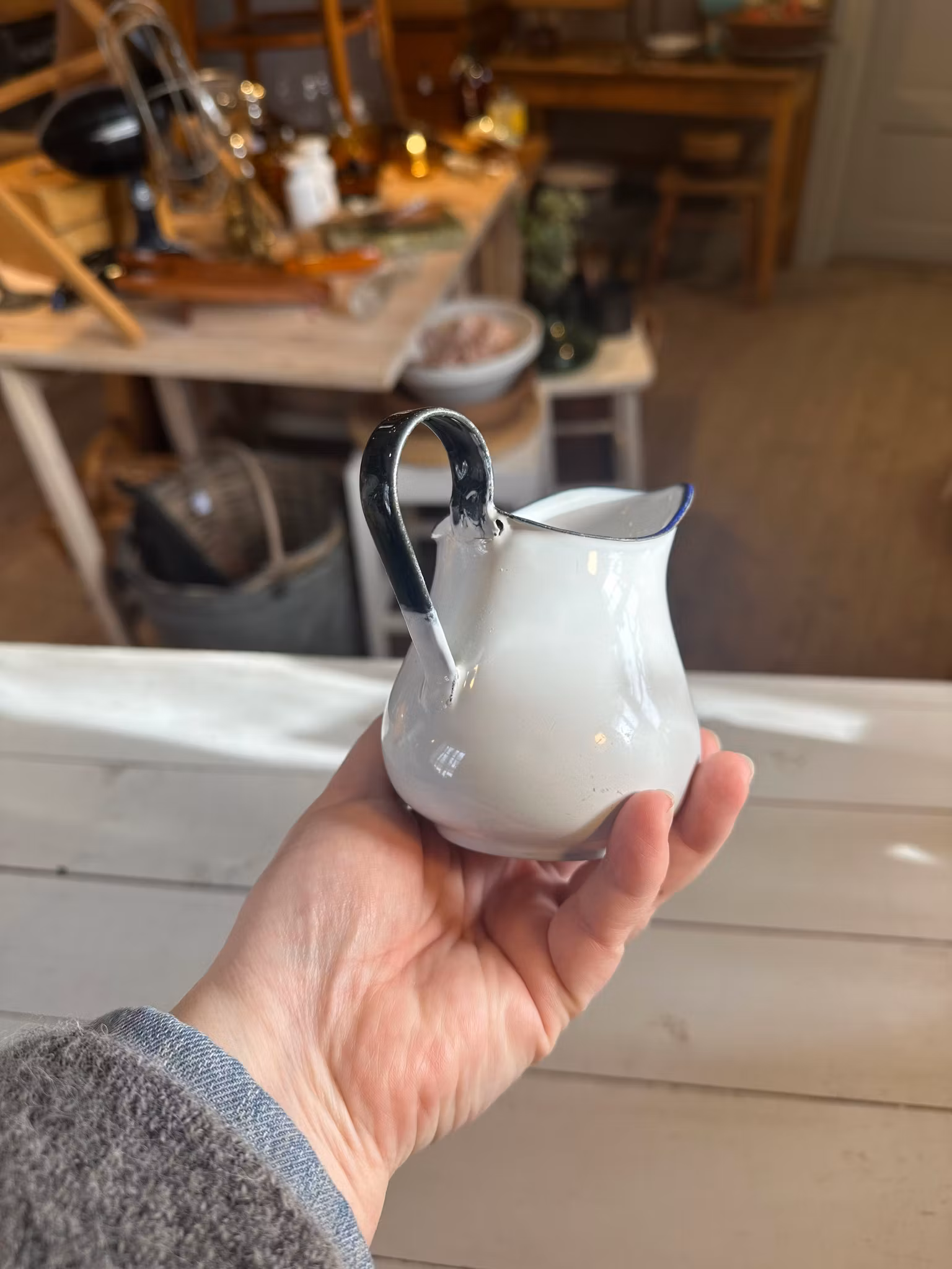 Underbar liten emaljerad mjölk/gräddans från svenska Kockums. Vit med blå och svarta kanter/handtag.
