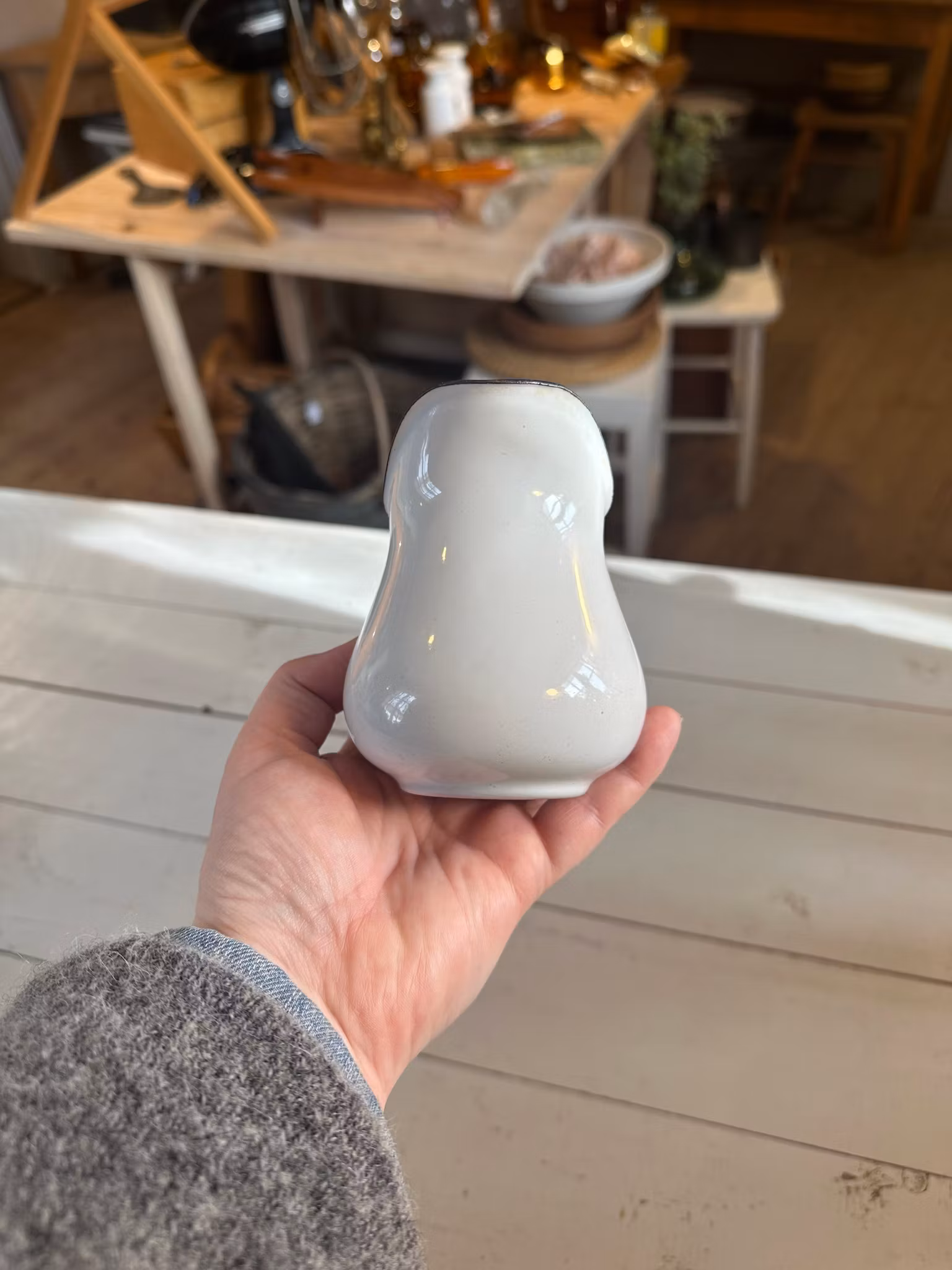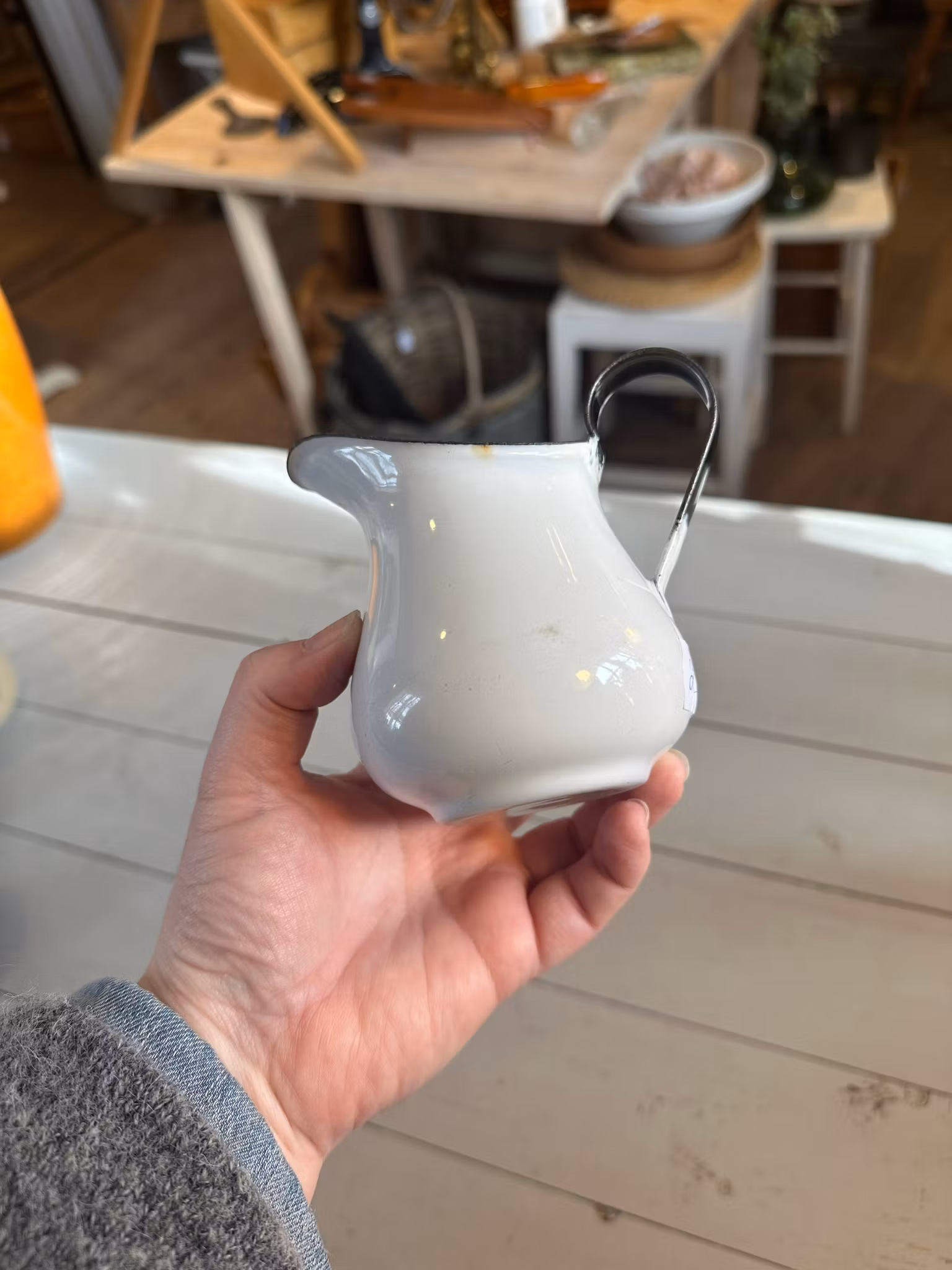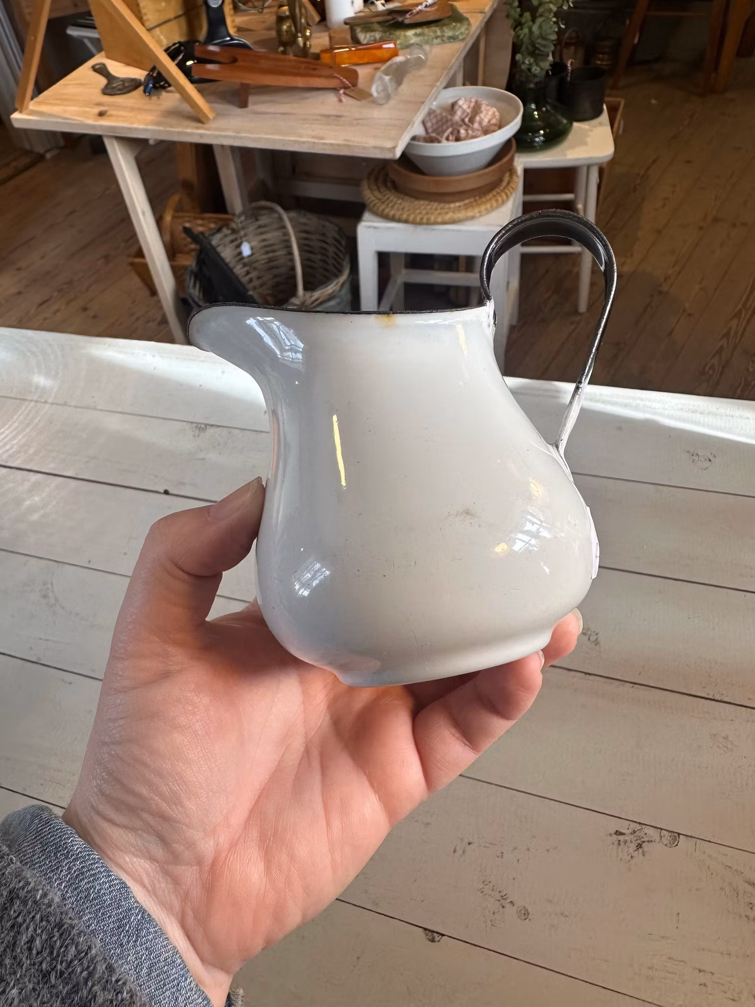 Underbar liten emaljerad mjölk/gräddans från svenska Kockums. Vit med blå och svarta kanter/handtag.