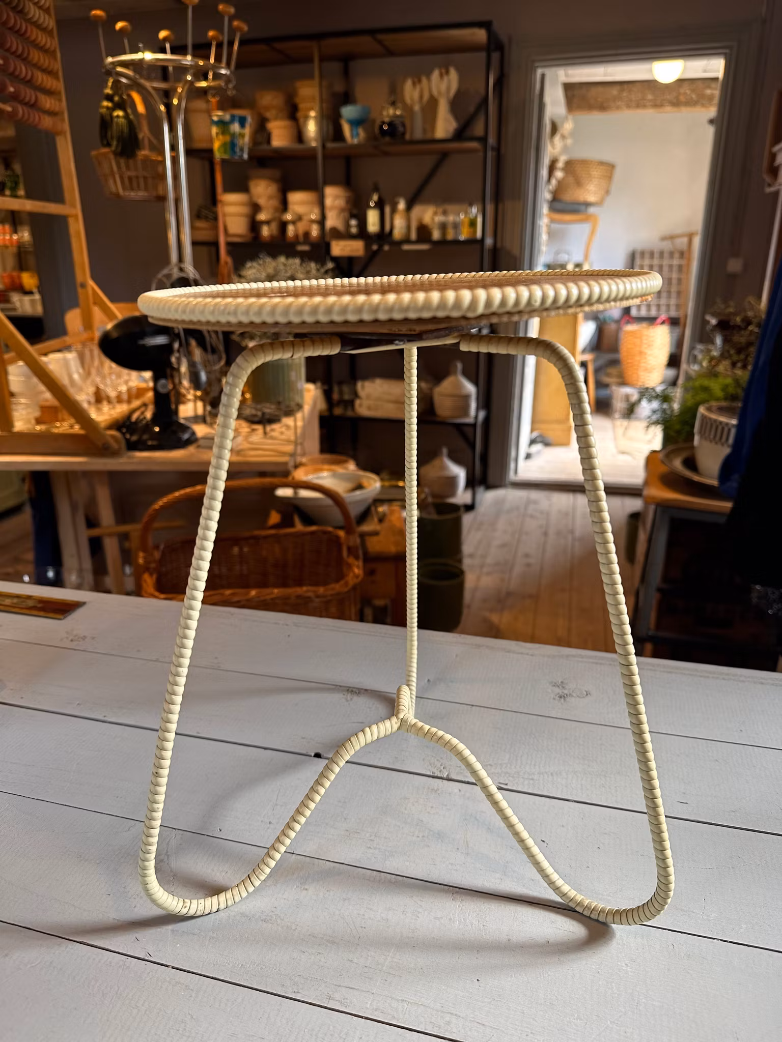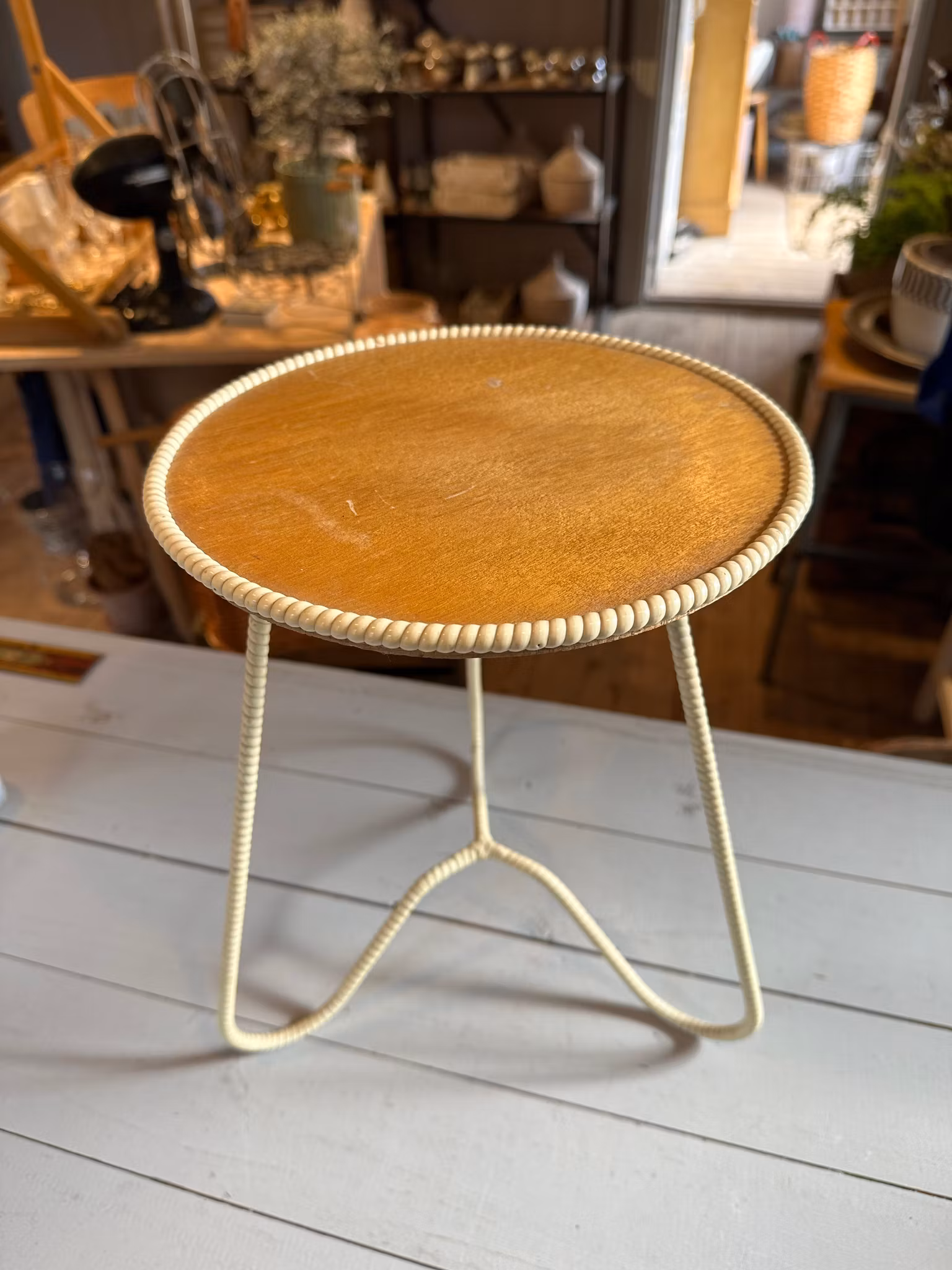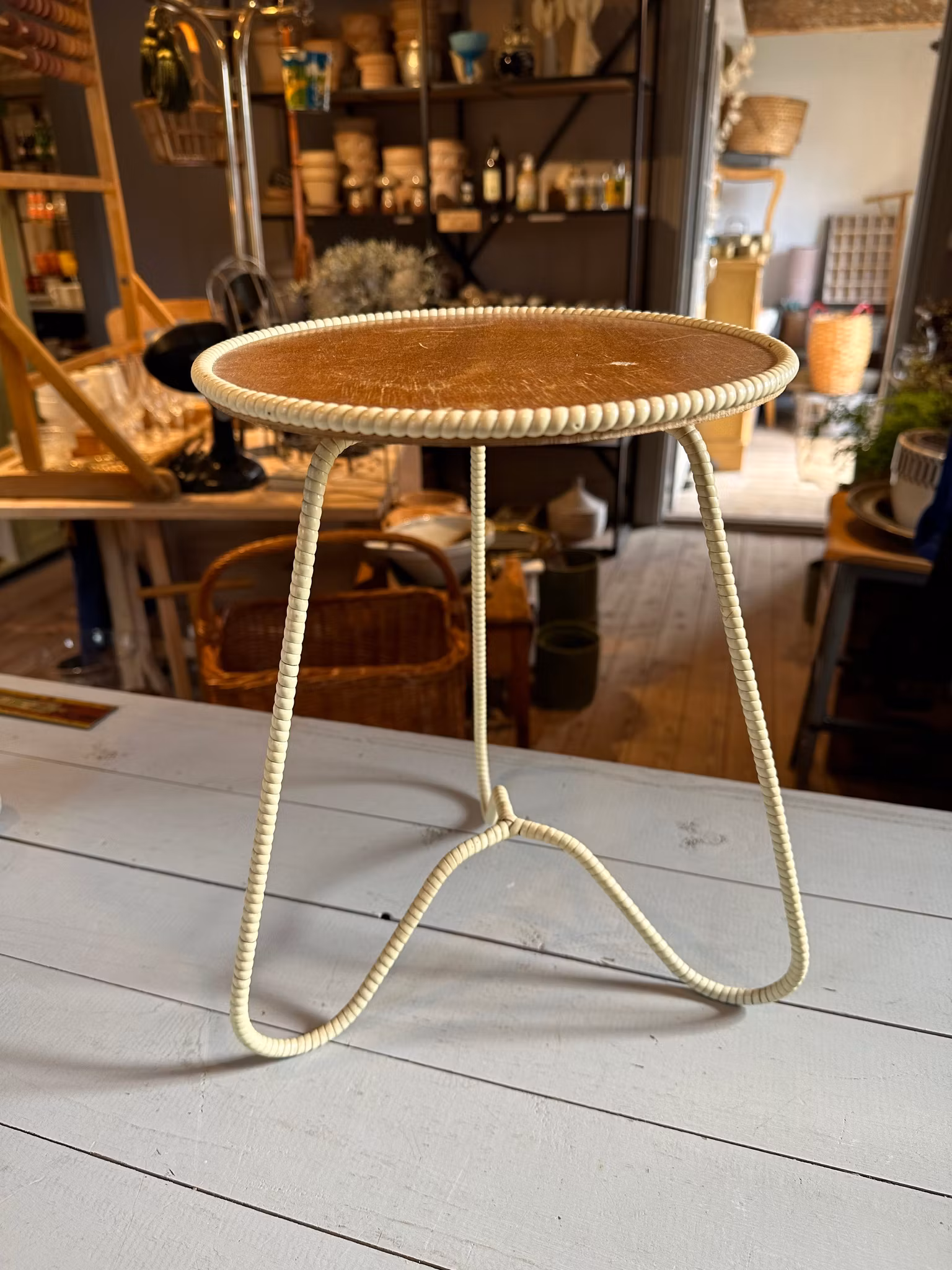 Charmig liten piedestal med skiva i trä och med ben lindade i plastband i klassisk retroanda.
