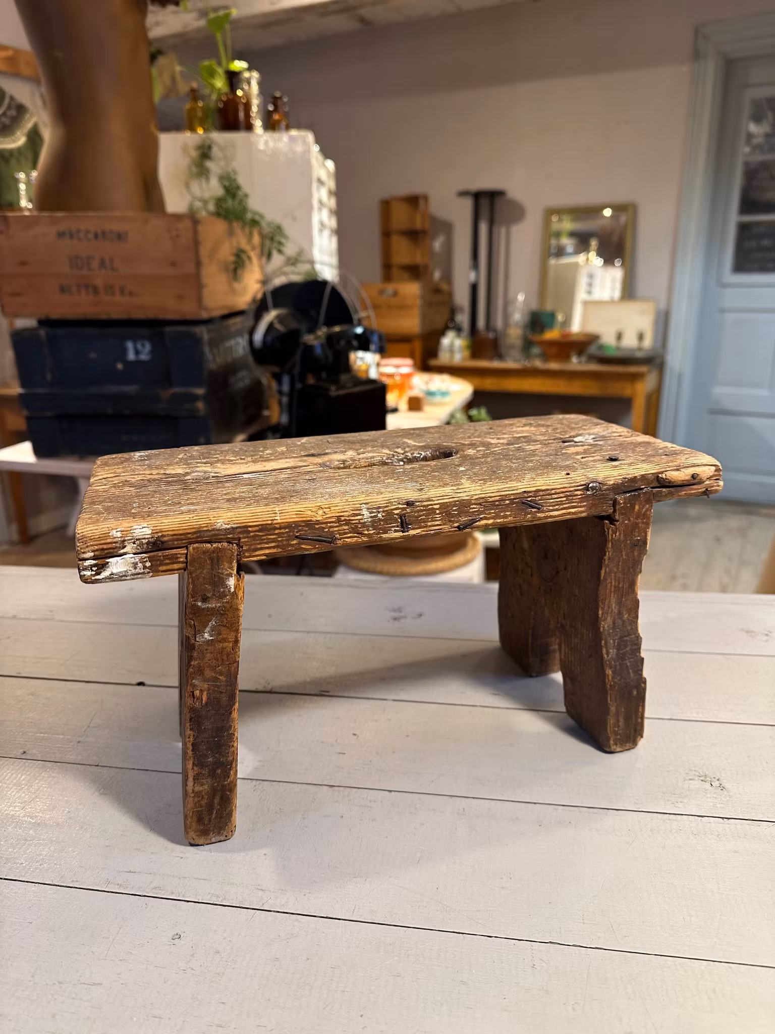 Underbar liten pall i trä med fin patina. Brunmålade men använd väl så färgen är nästan borta.
