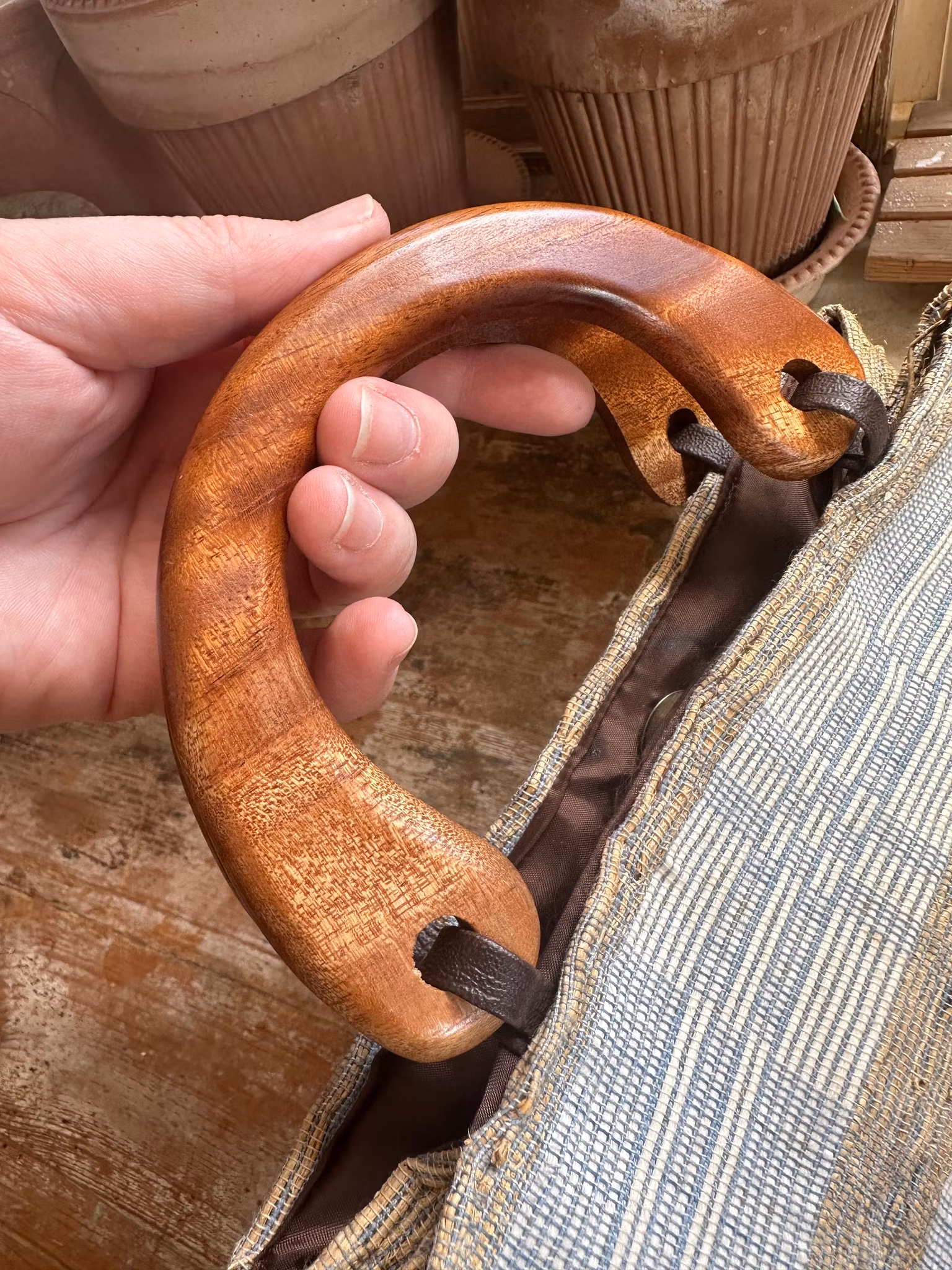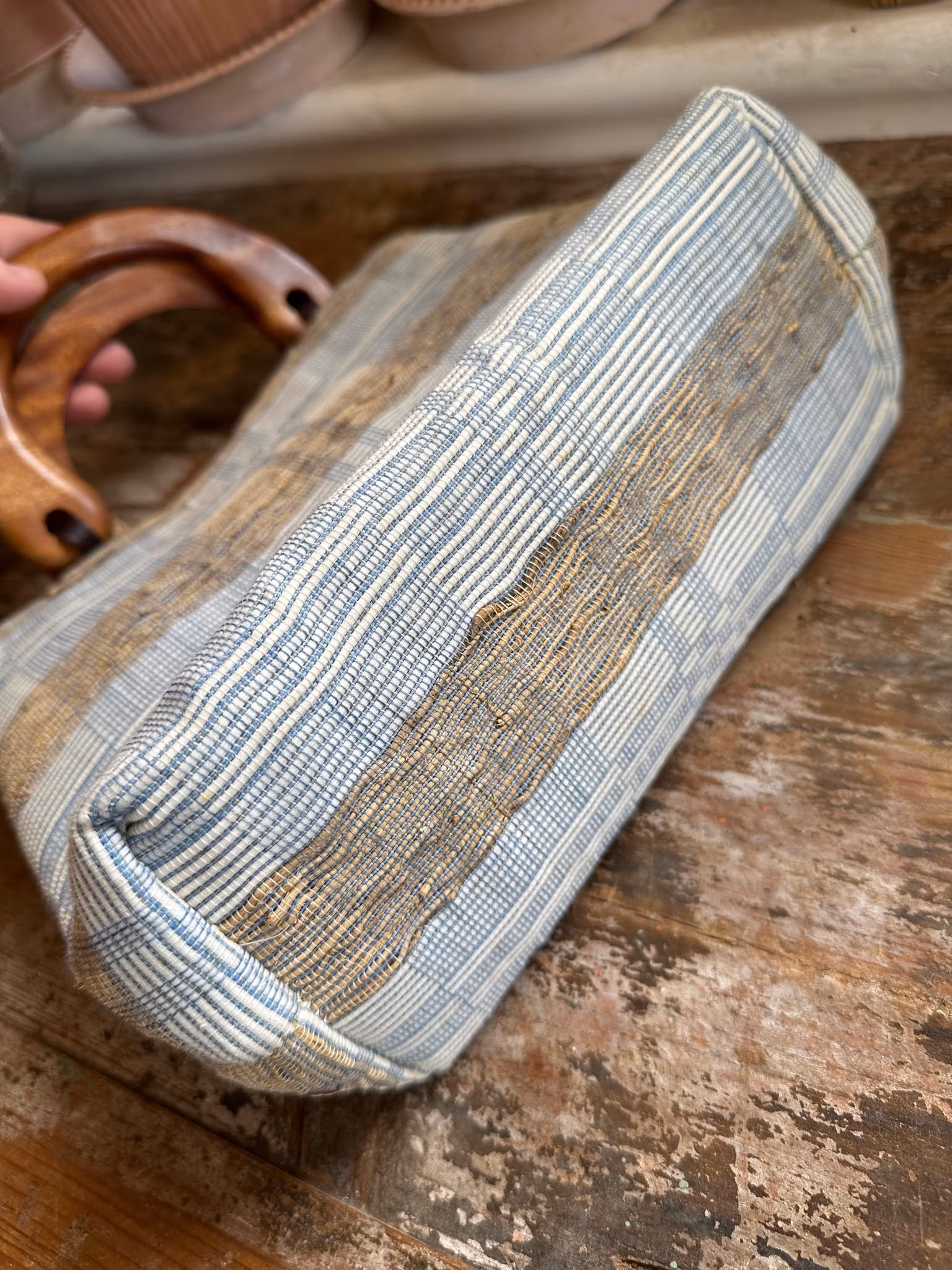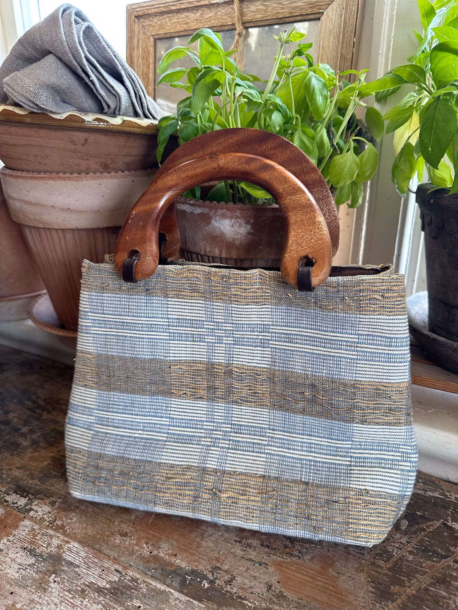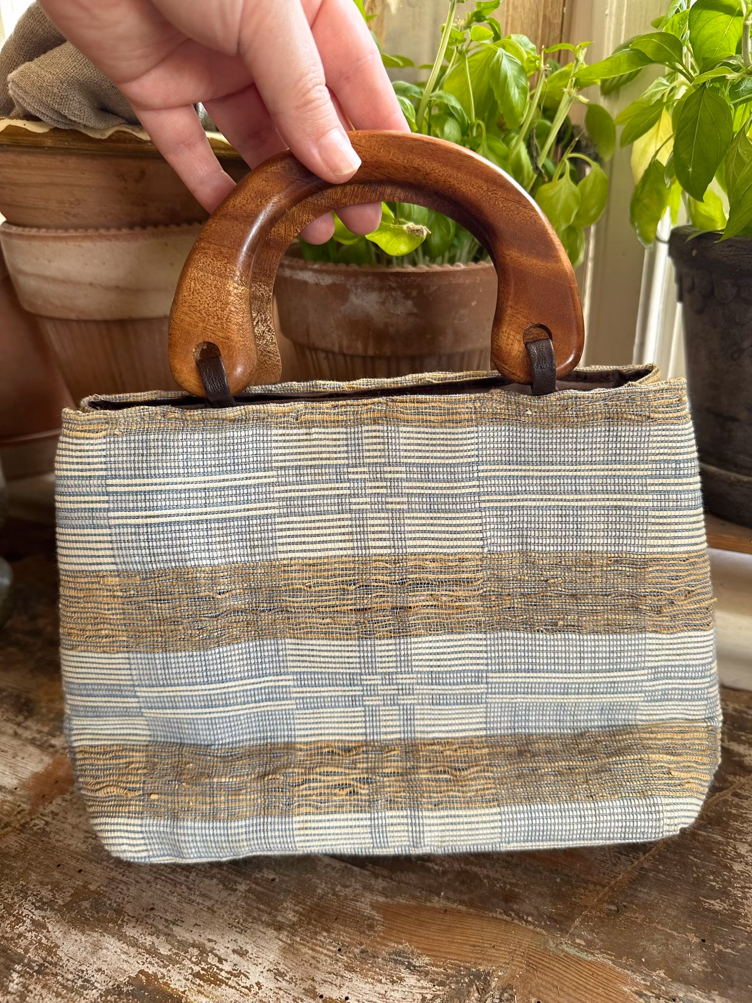 Söt liten väska i naturmaterial och textil blandat. Ålder okänd men i retrostil.
