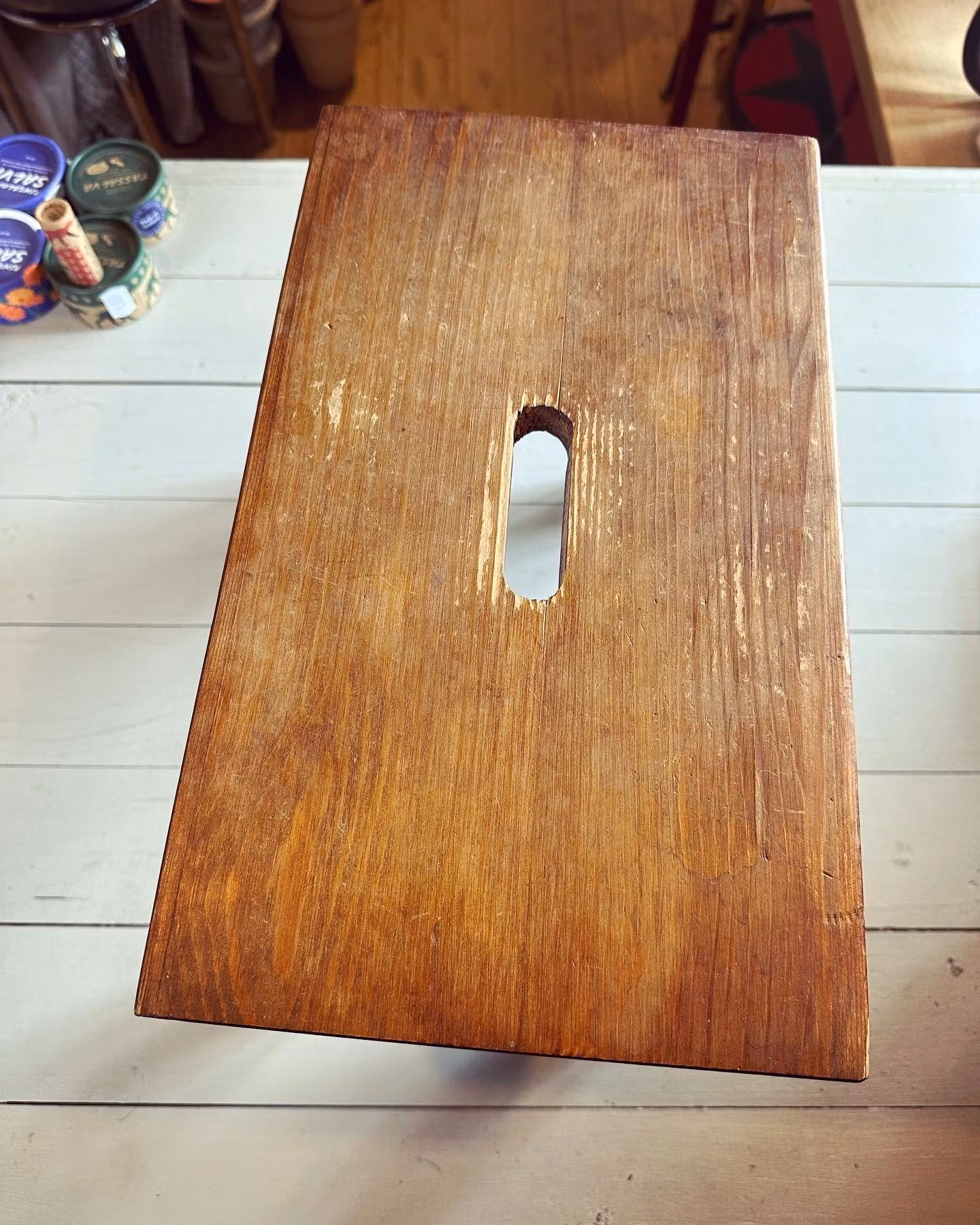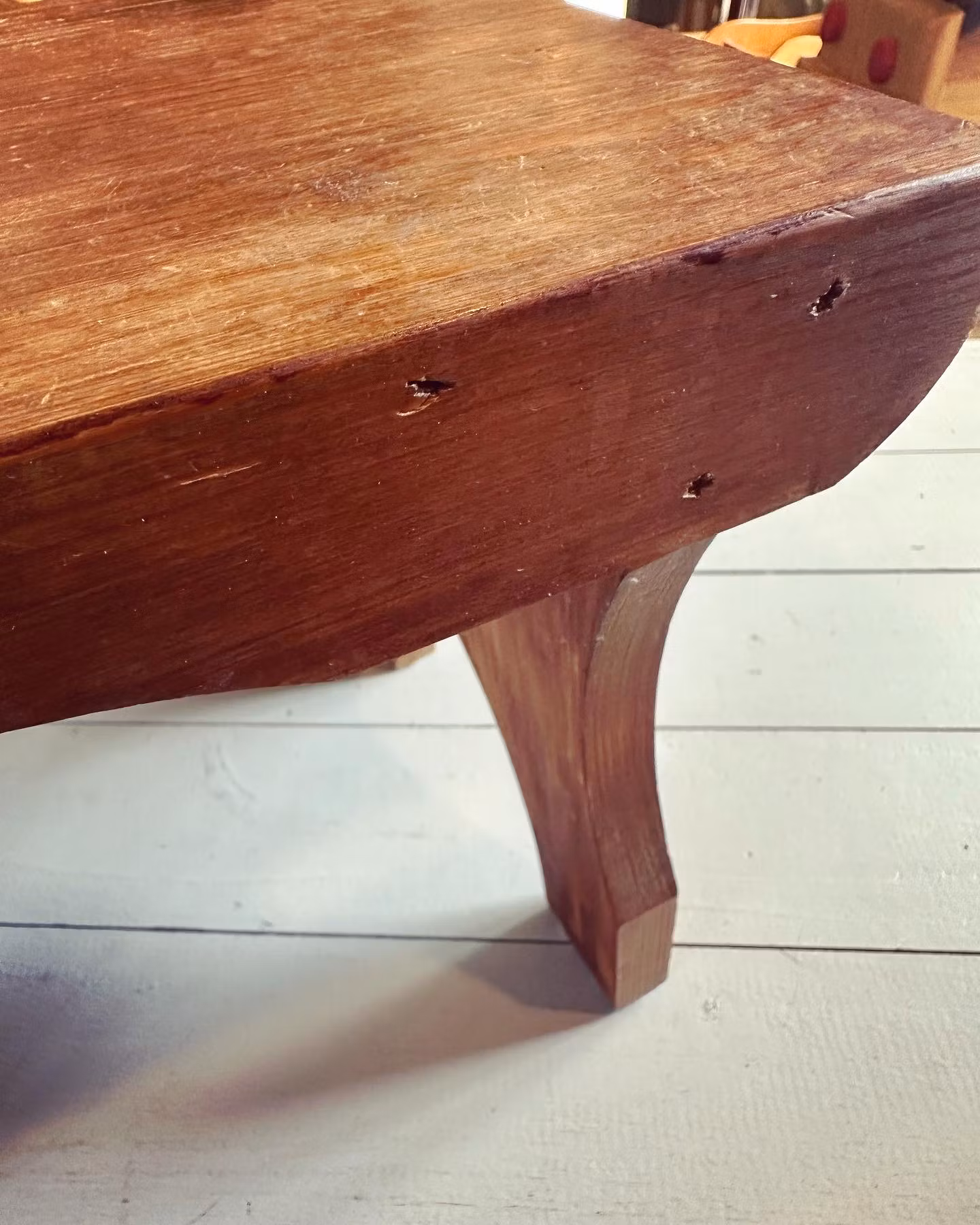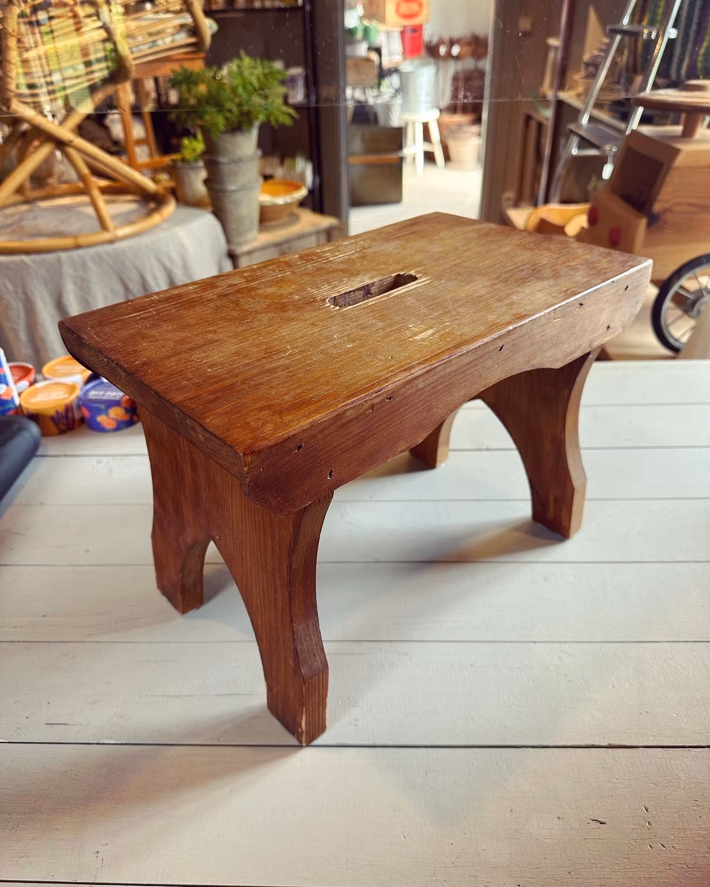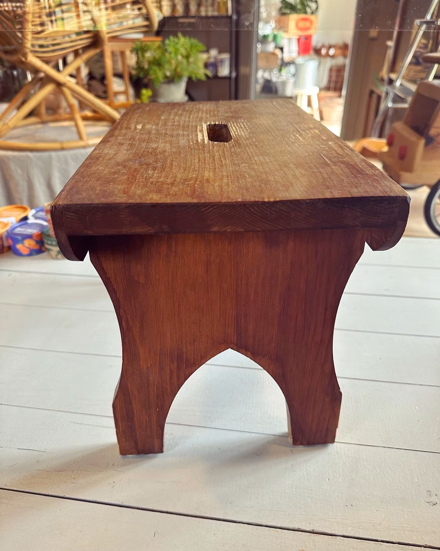 Söt liten pall i brunt trä med fin patina av användning och ålder.