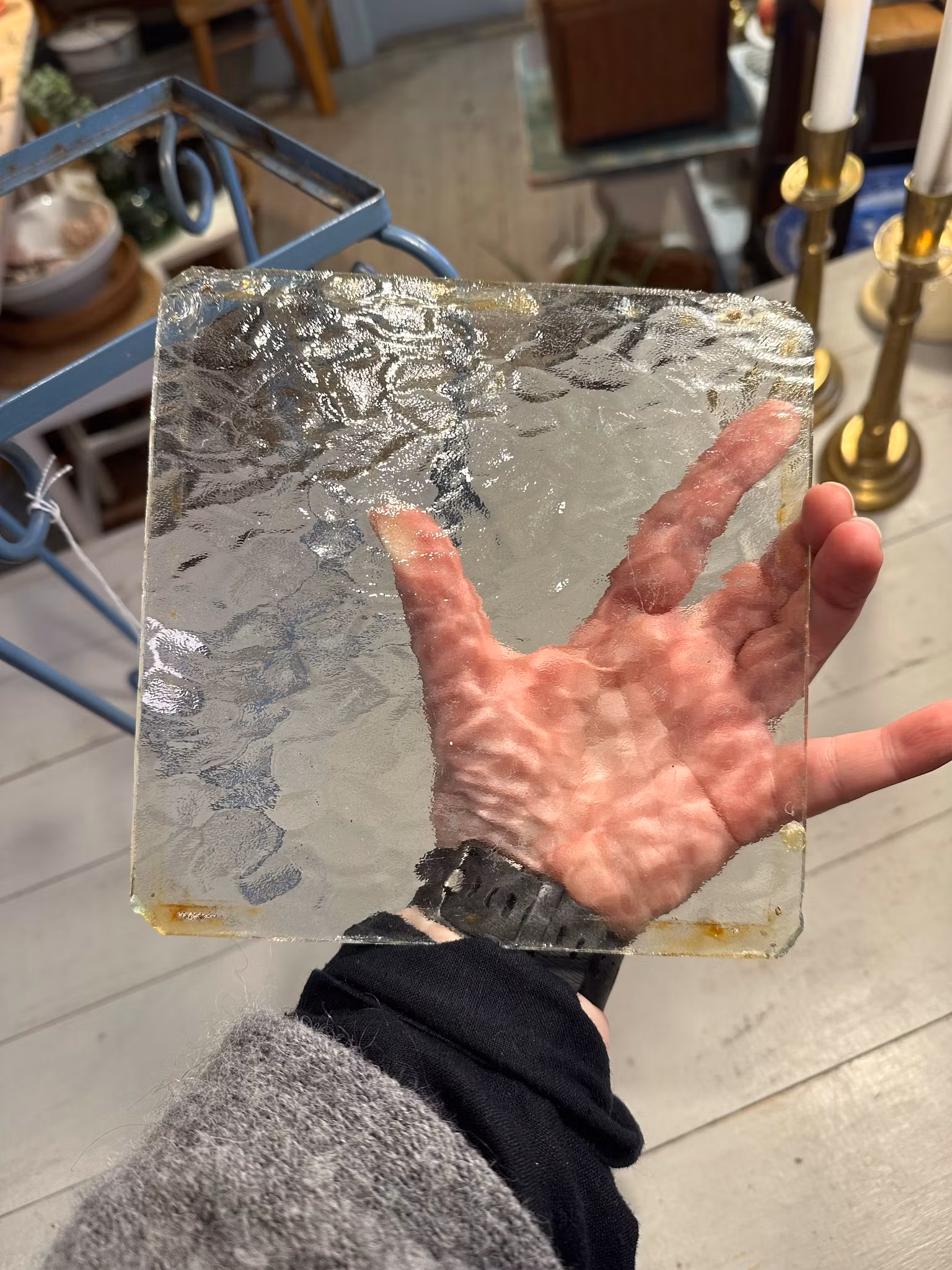 I gott åldrat och använt skick. Spår av användning och ålder finns över hela. Se bilder för skick. Glasskiva. Är lite grovt kapad i hörnen men tror att det original. Lite rostig i hörnen av vatten. Skivan är åldrad.