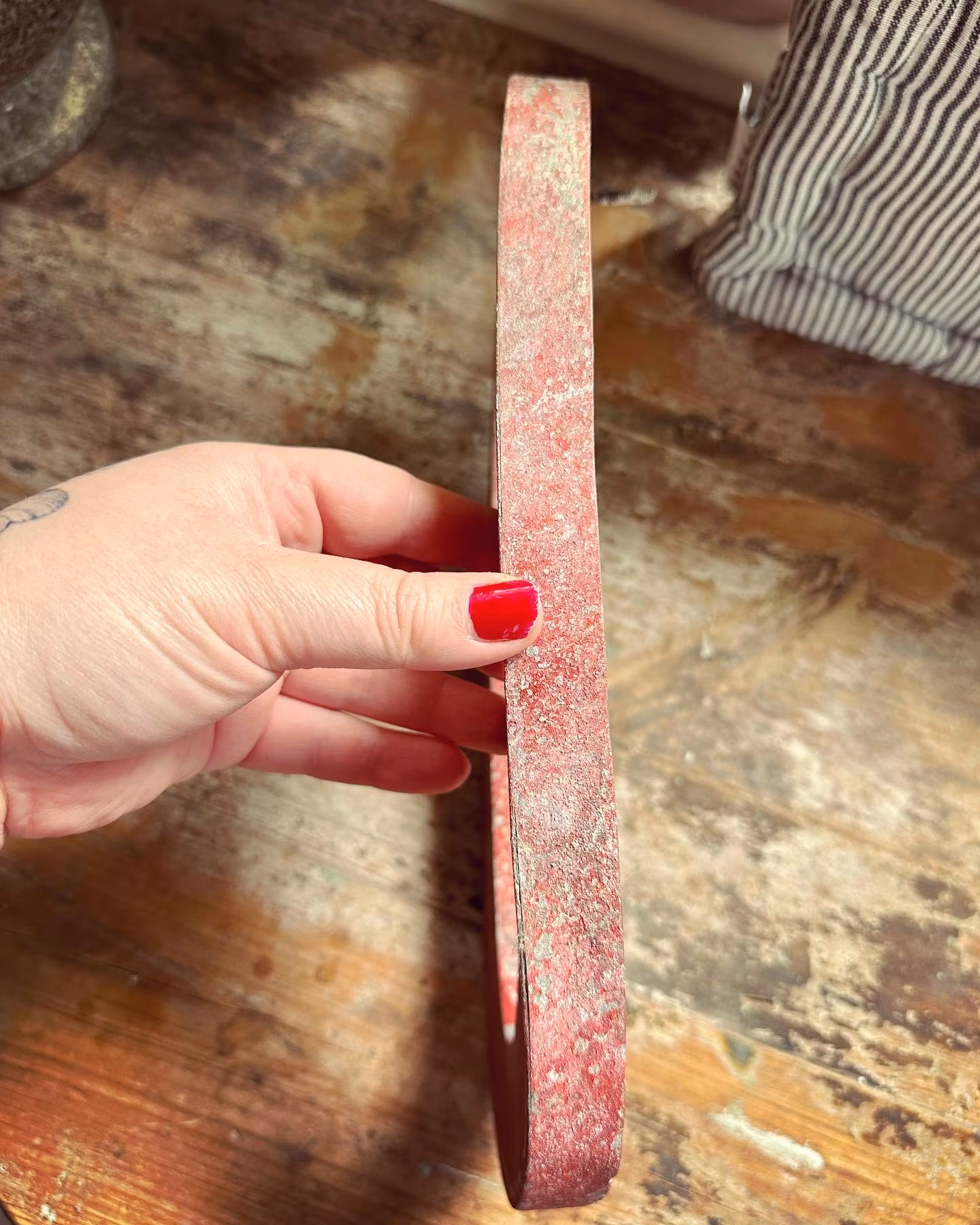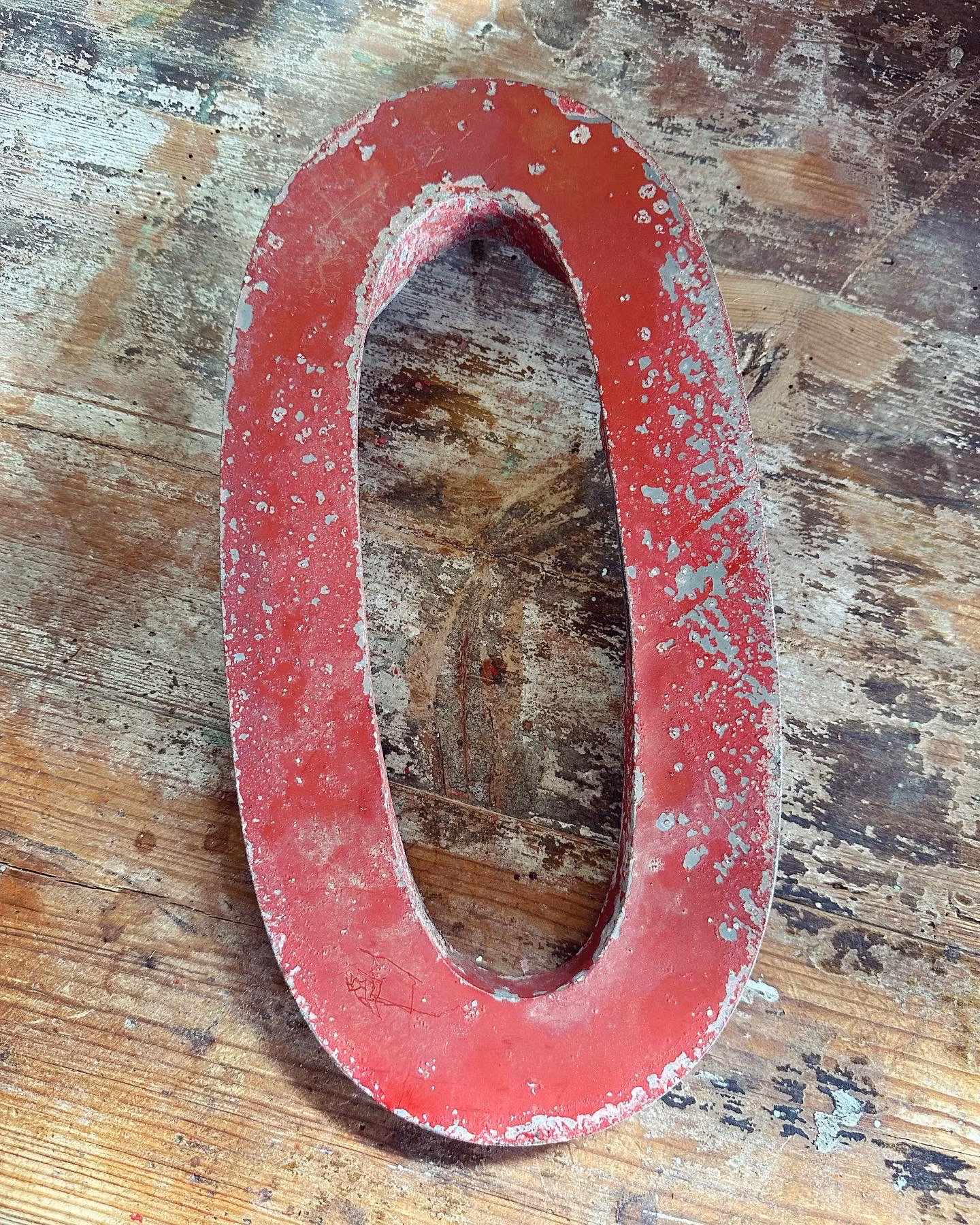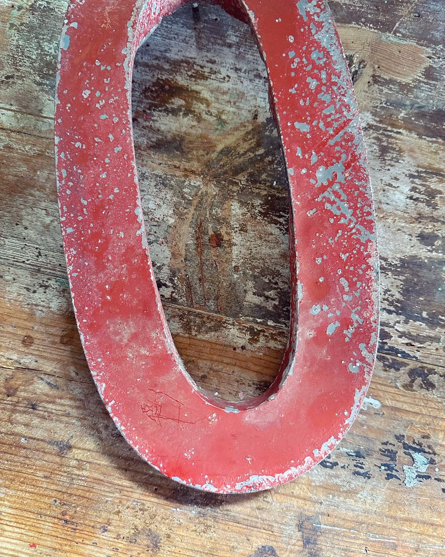 Underbar gammal plåtbokstav som suttit utanför en butik eller liknande en gång i tiden. Röd färg med fin patina av ålder.