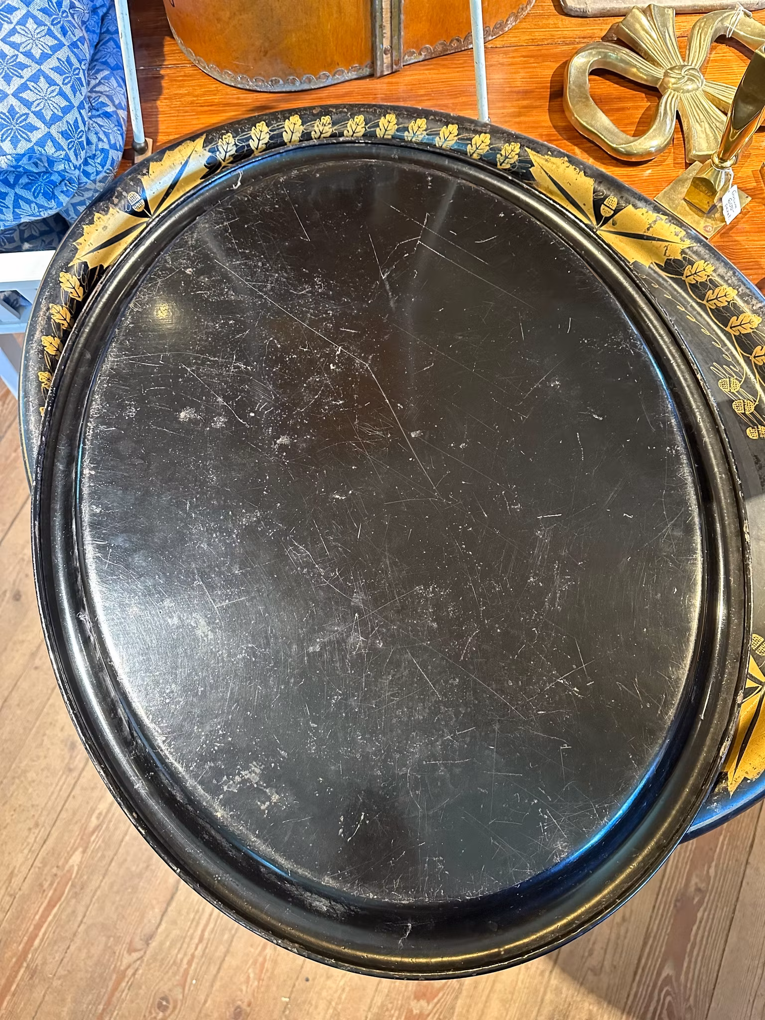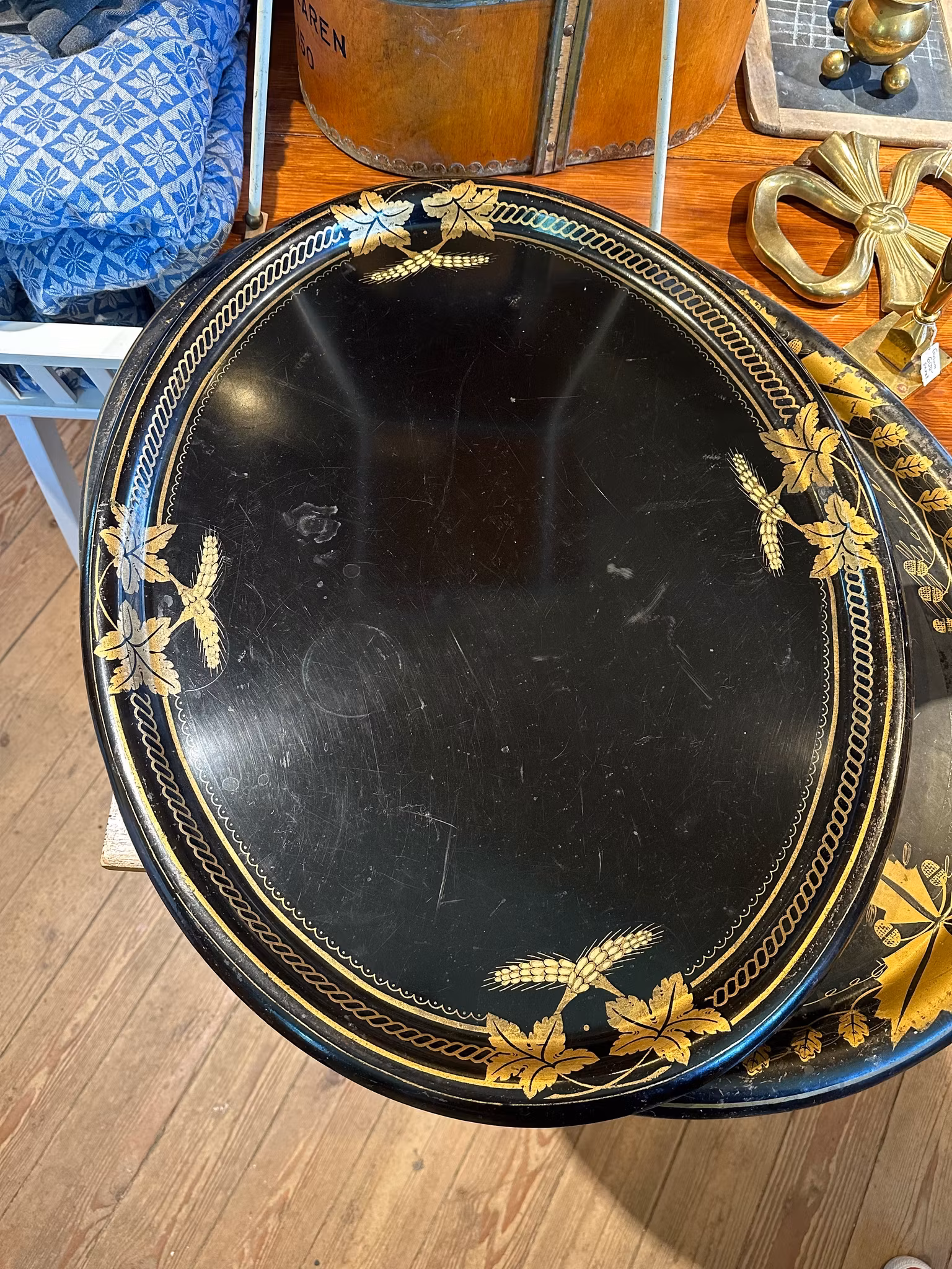 Vacker gammal plåtbricka i svart med guldfärgad dekor.