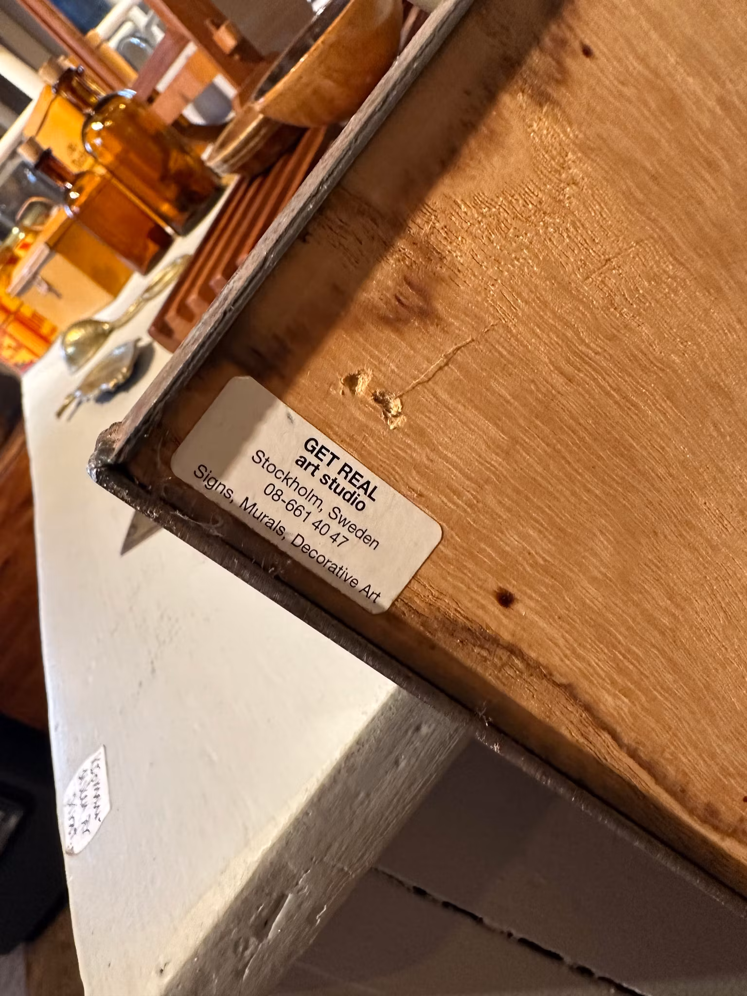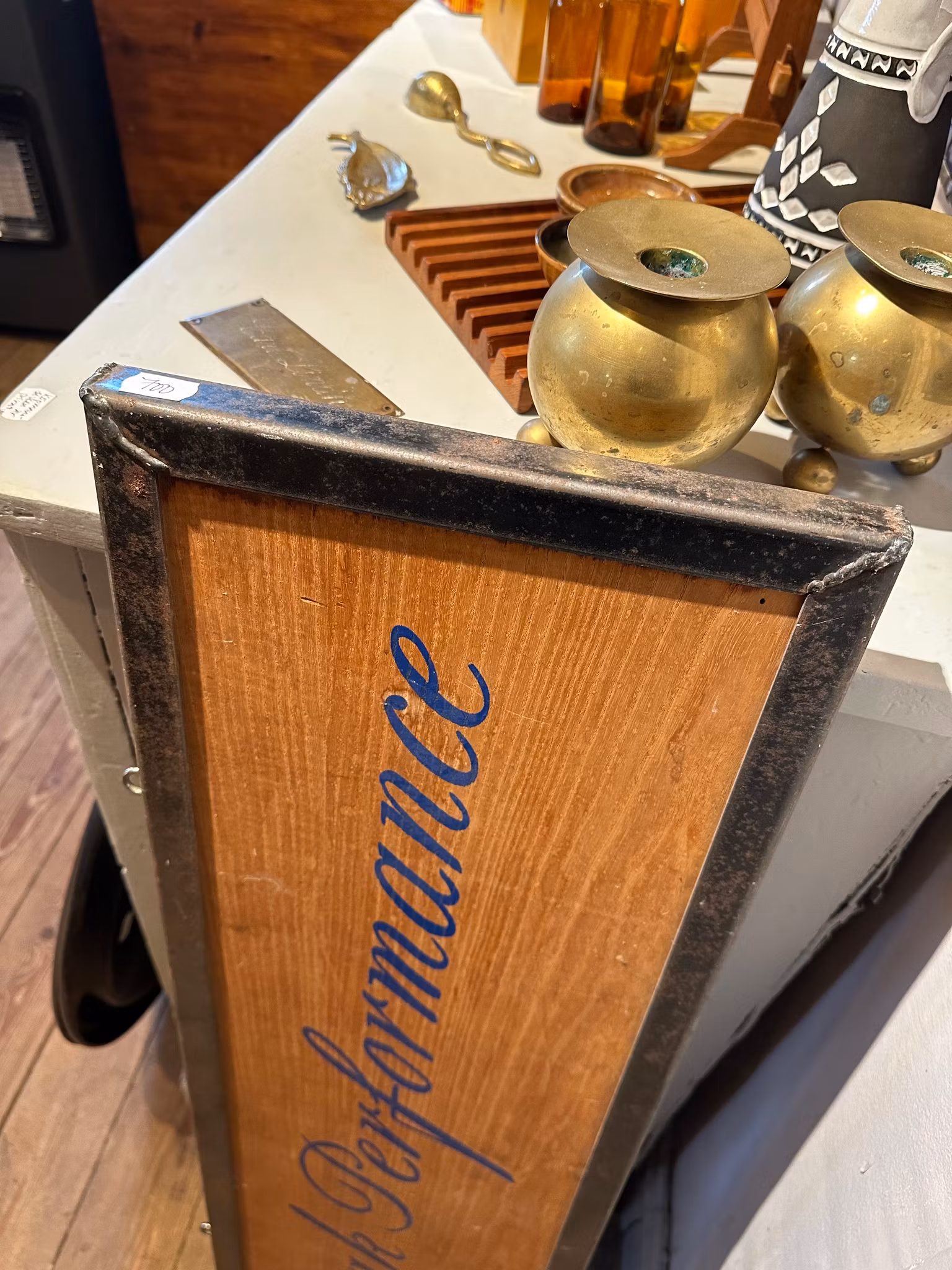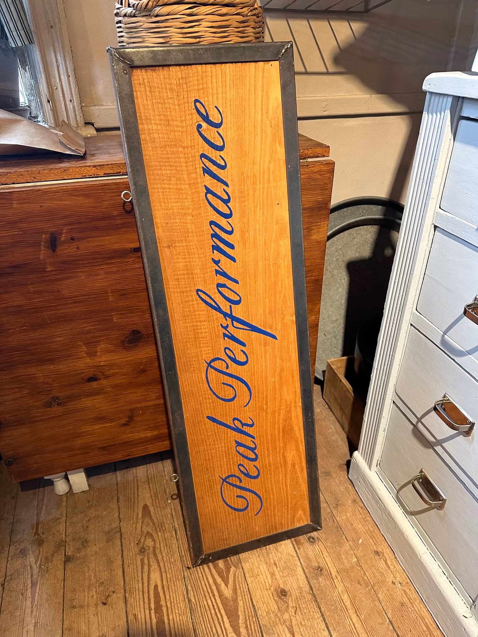 Häftig skylt i trä med svetsad rejäl ram. Troligtvis suttit i någon av märkets butiker.
