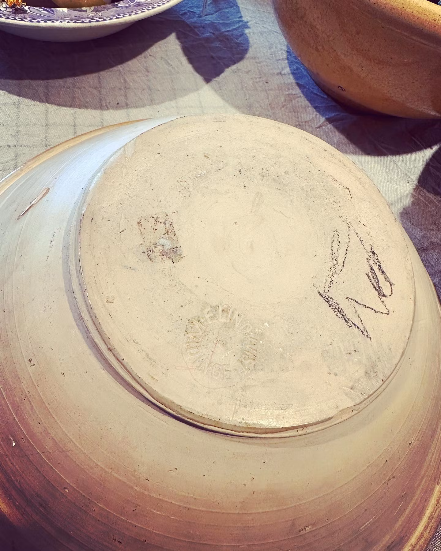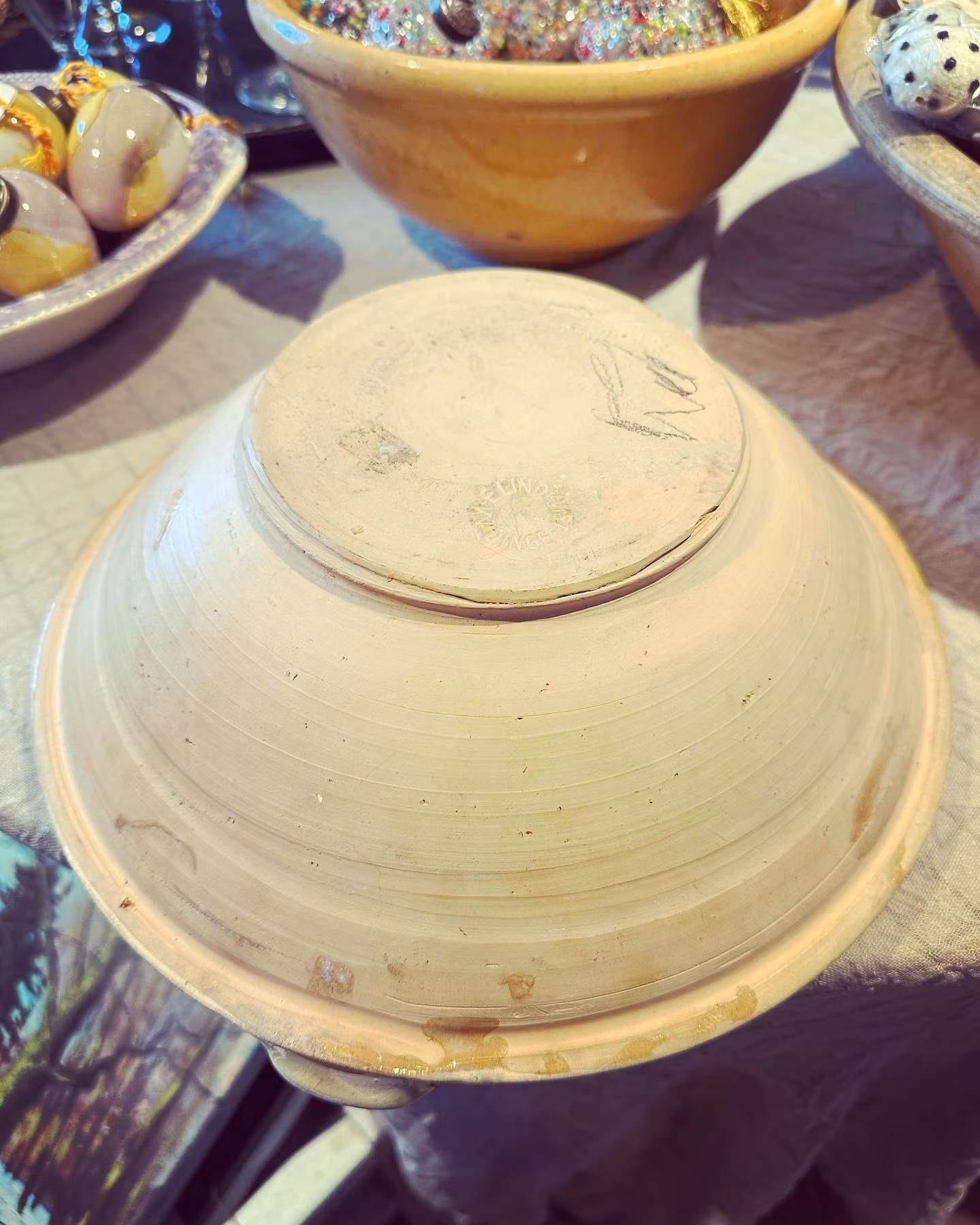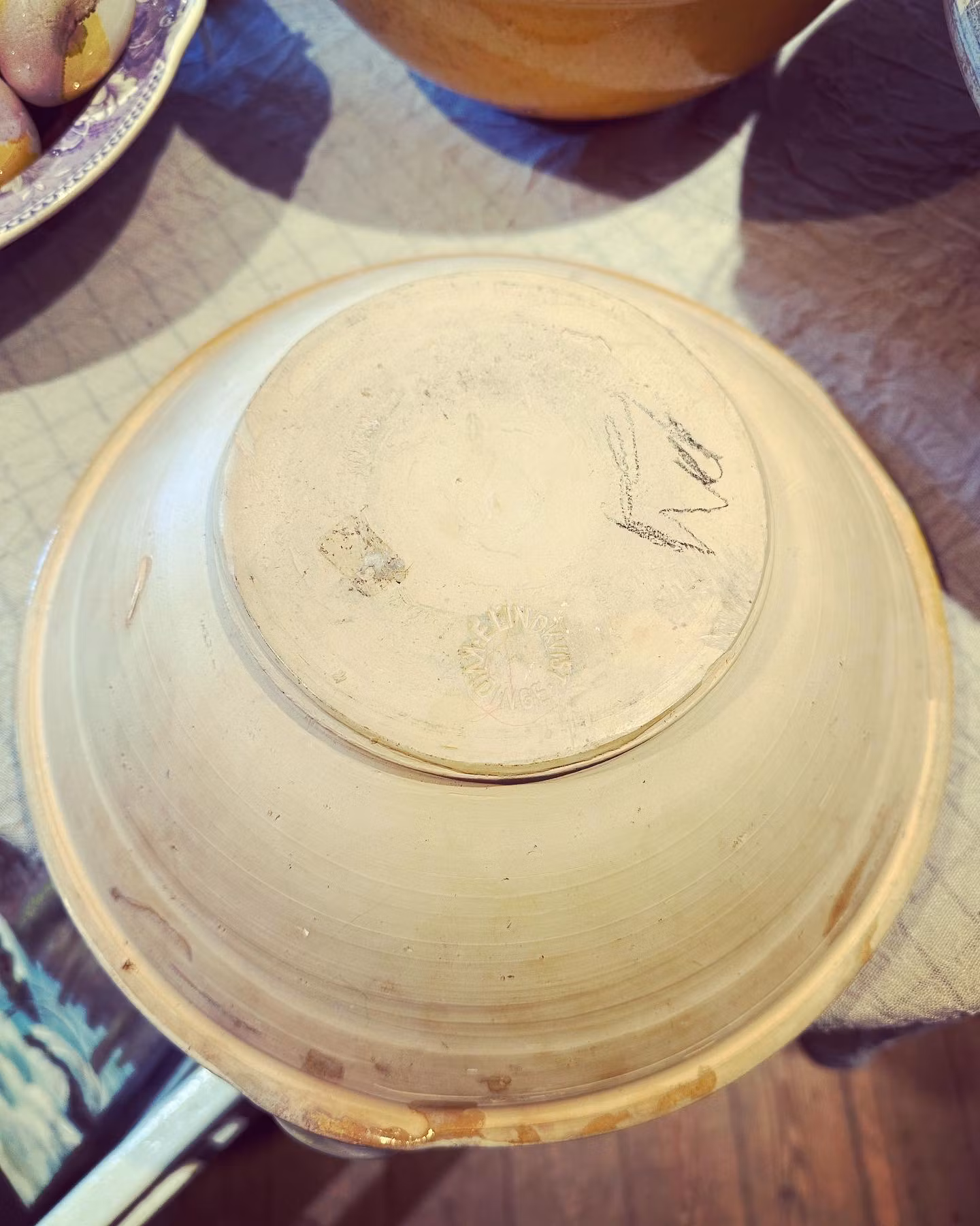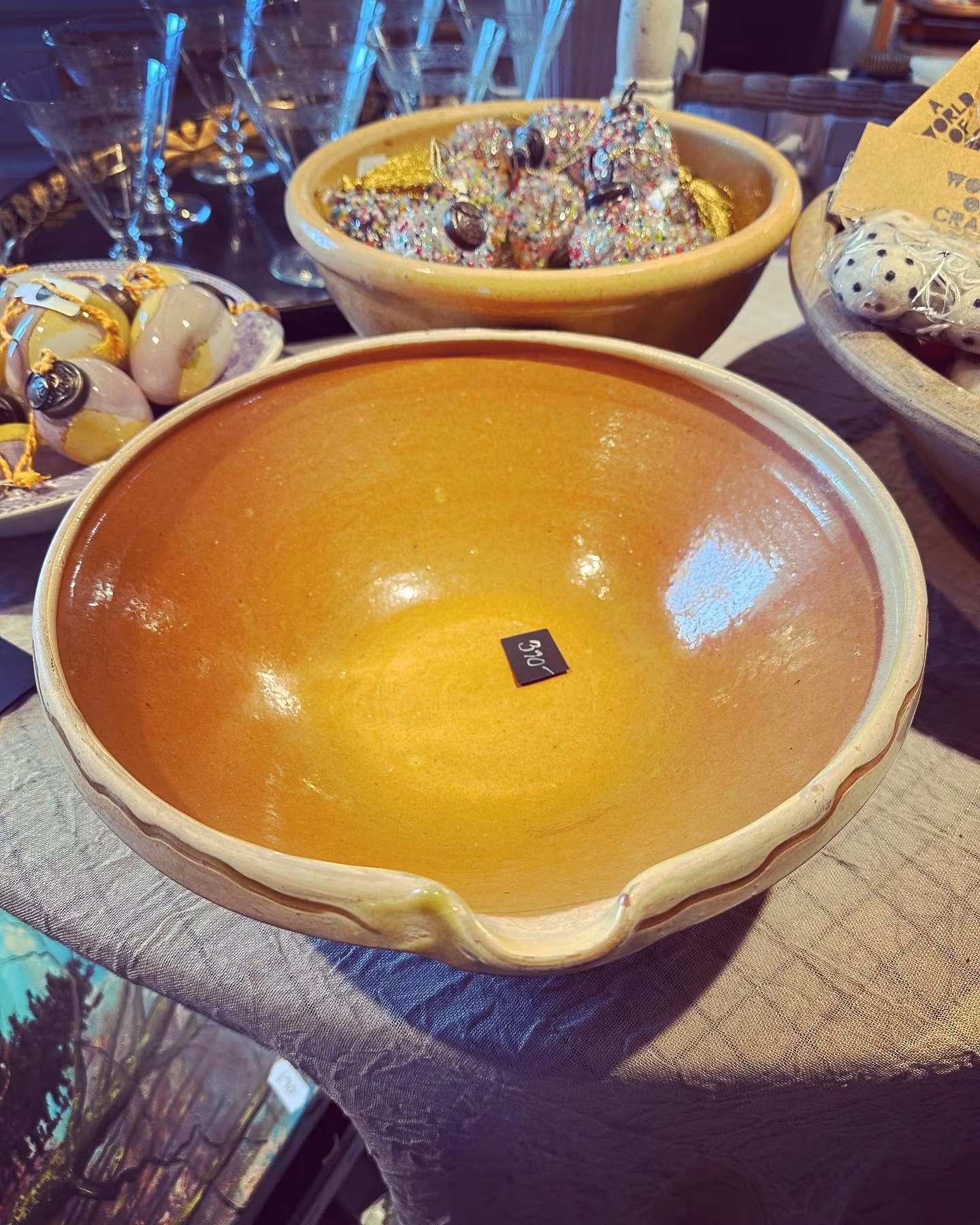 Fin spillkum i keramik i orange/gul/crémefärg. Fin som uppläggningsskål eller till maträtter. Dekorativ klassiker i alla hem!
