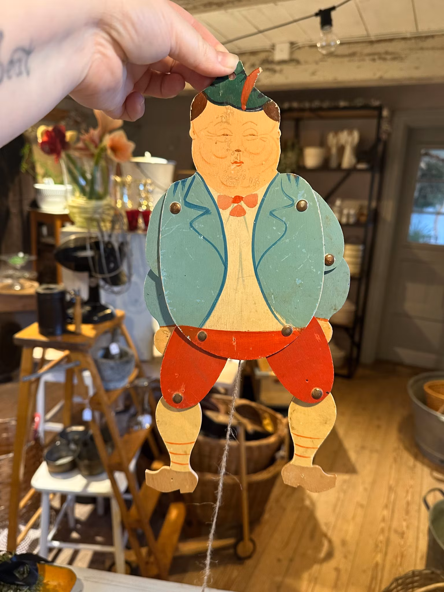Charmig gammal sprattelgubbe i trä i form av Edvard Persson.