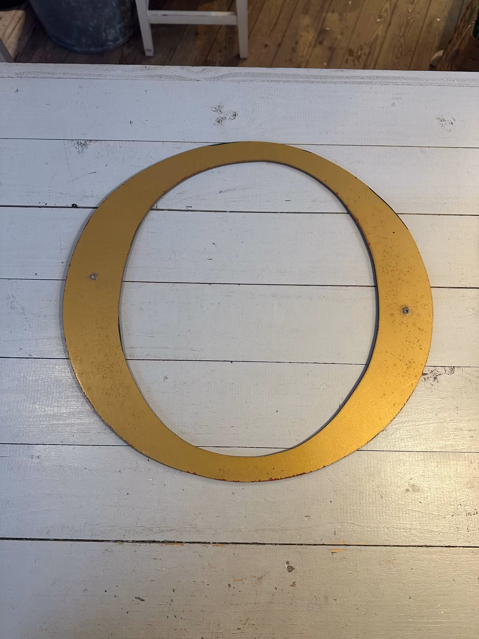 Stor bokstav utskuren i metall. Varit målad i olika färger numera i en guldfärgad nyans.