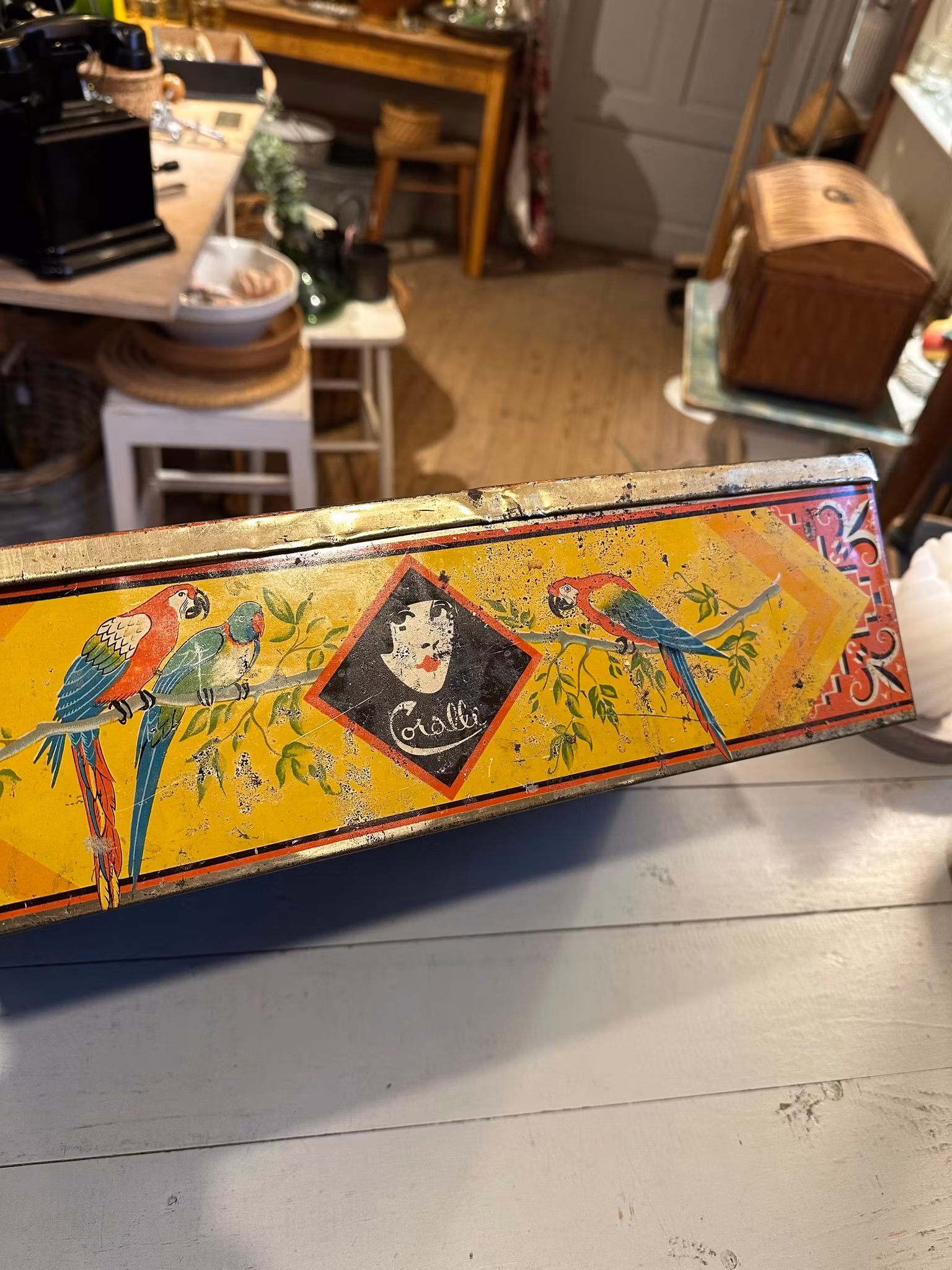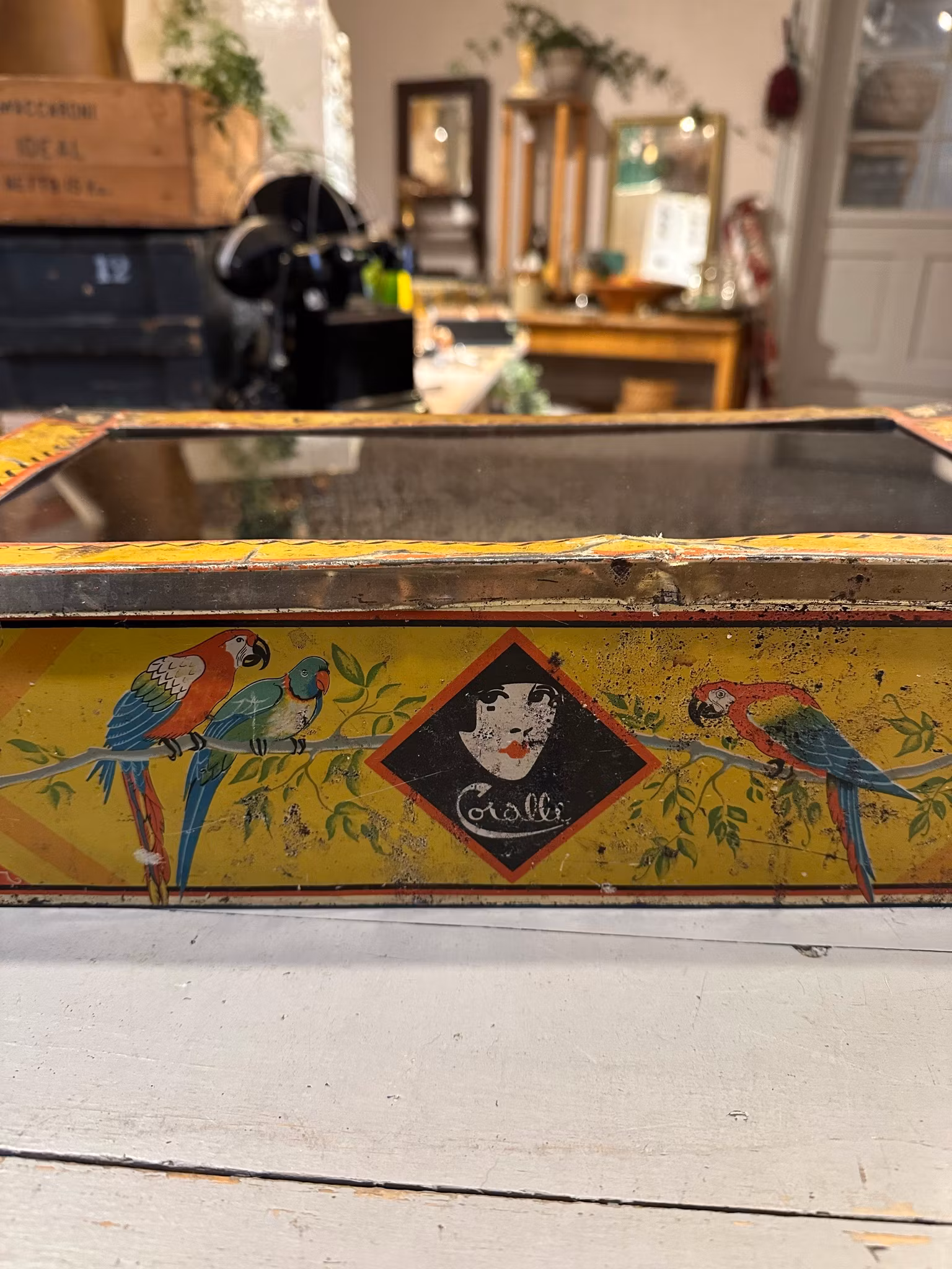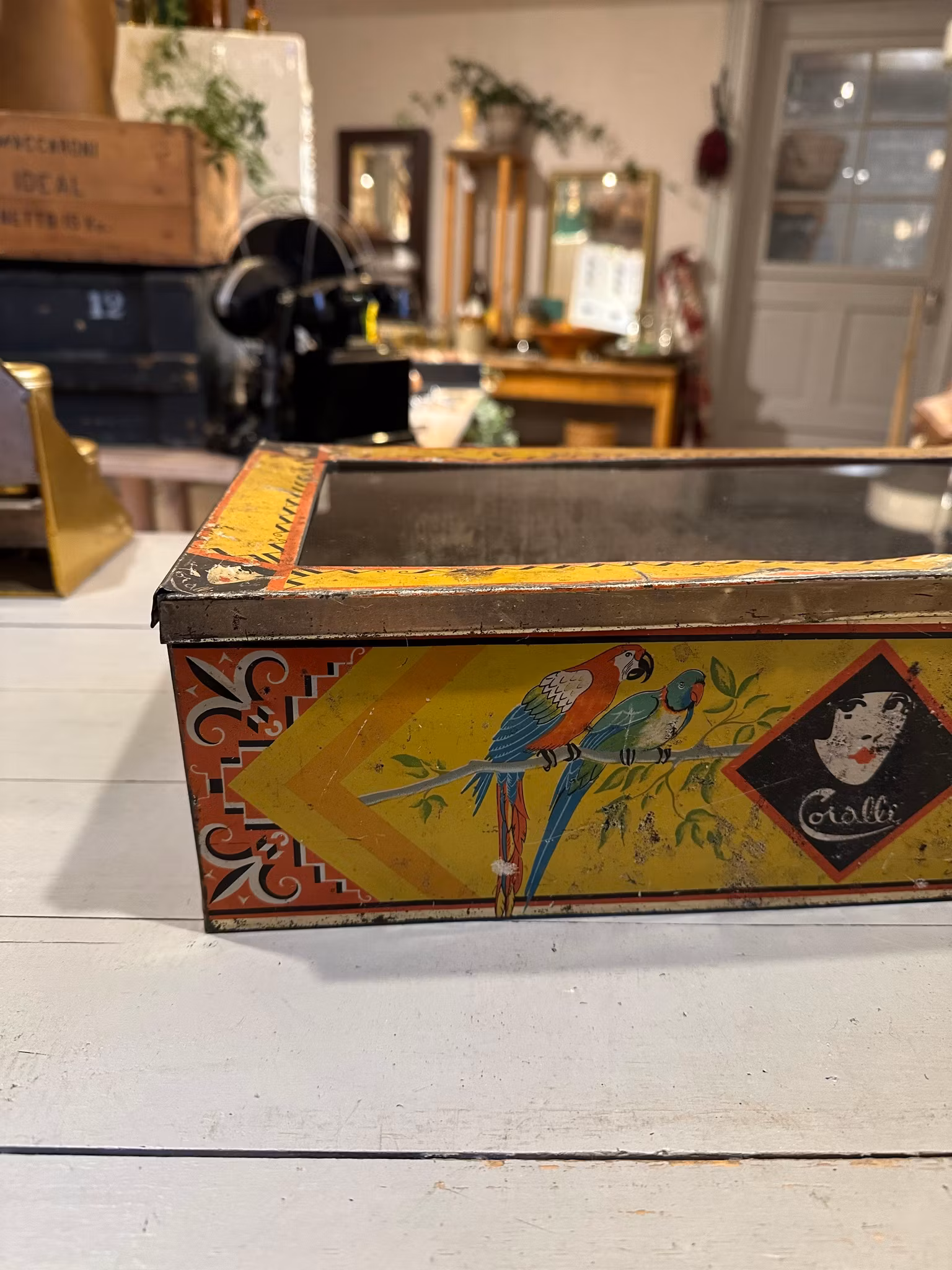 Underbar gammal plåtburk i ovanlig modell. Rektangulär med glas i locket. Märke Coralli. Nog innehållit choklad eller konfektyr en gång i tiden. Fint motiv med papegojor utanpå.
