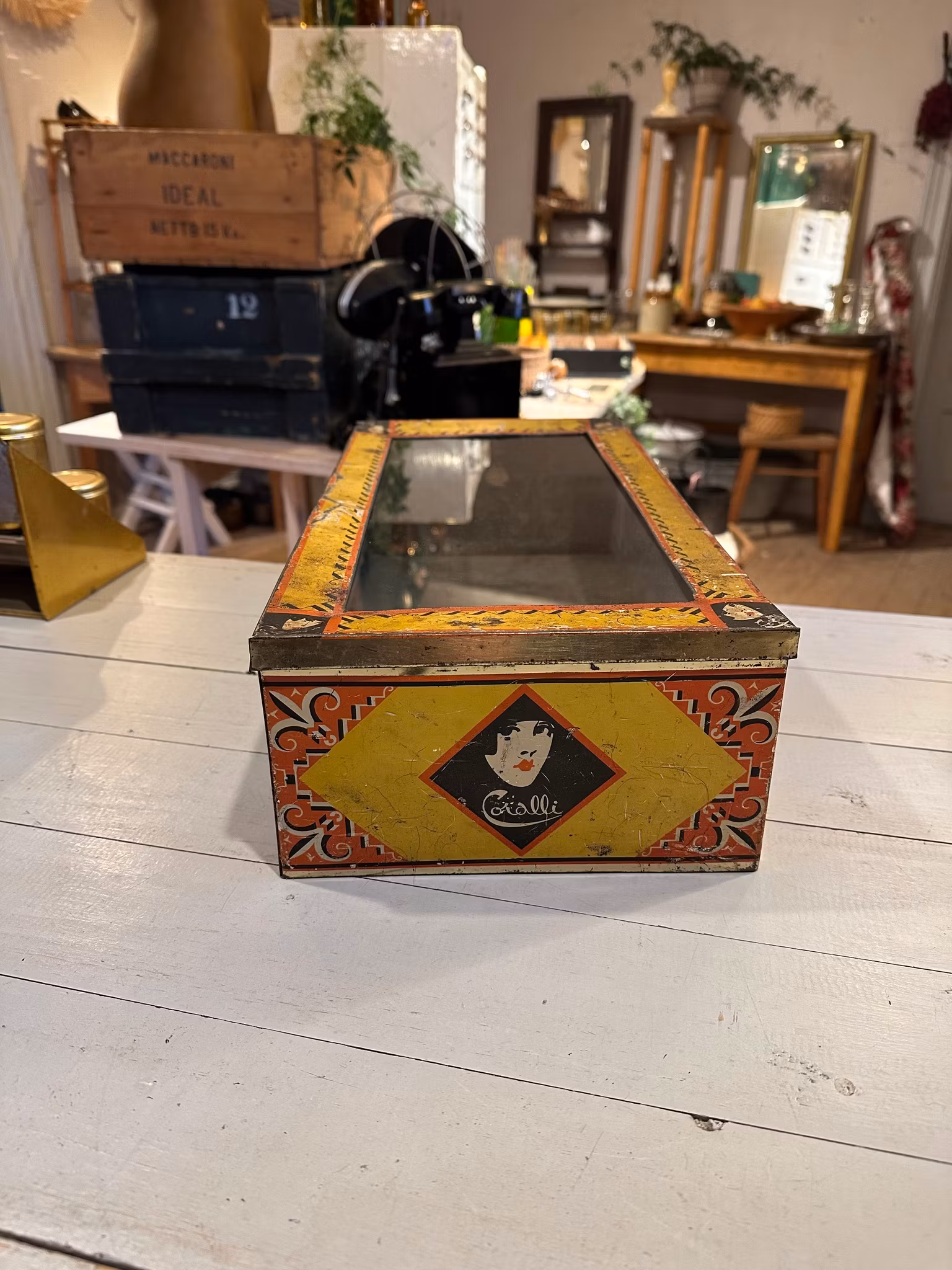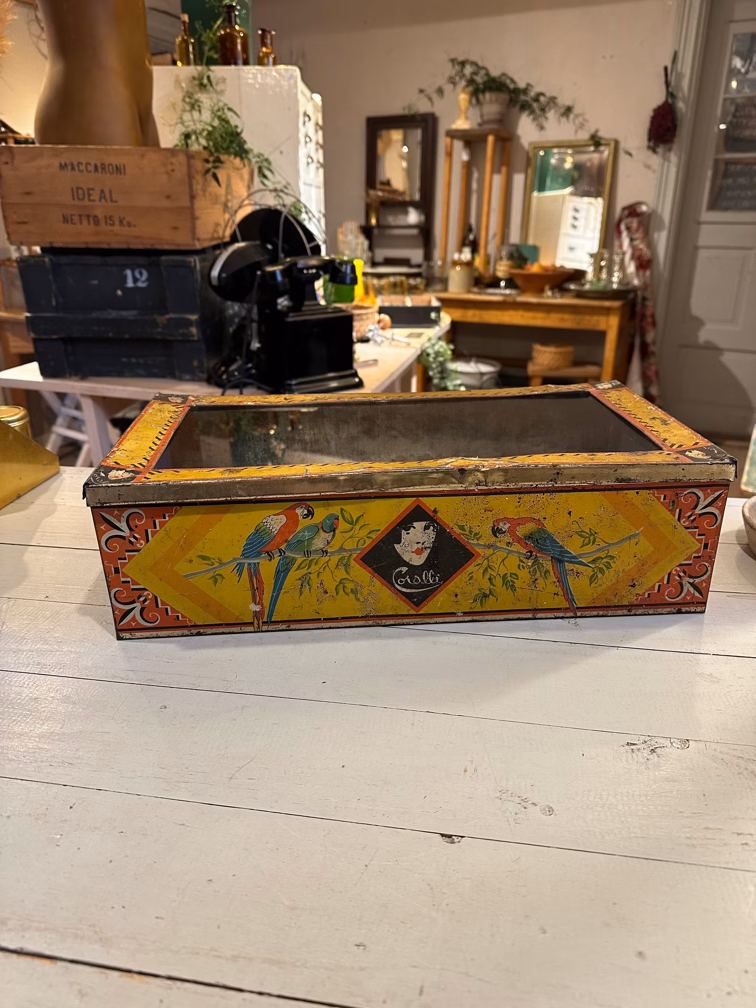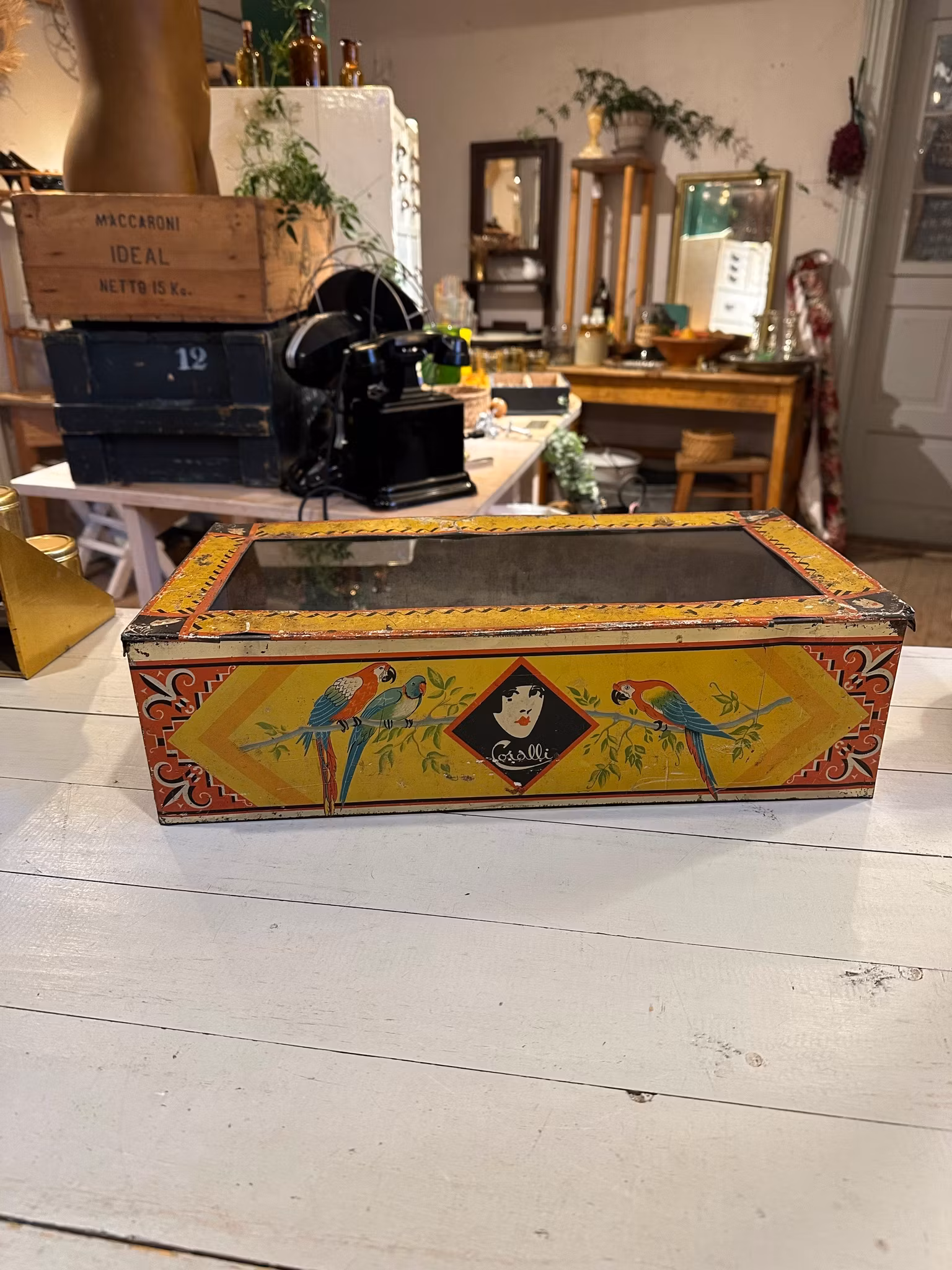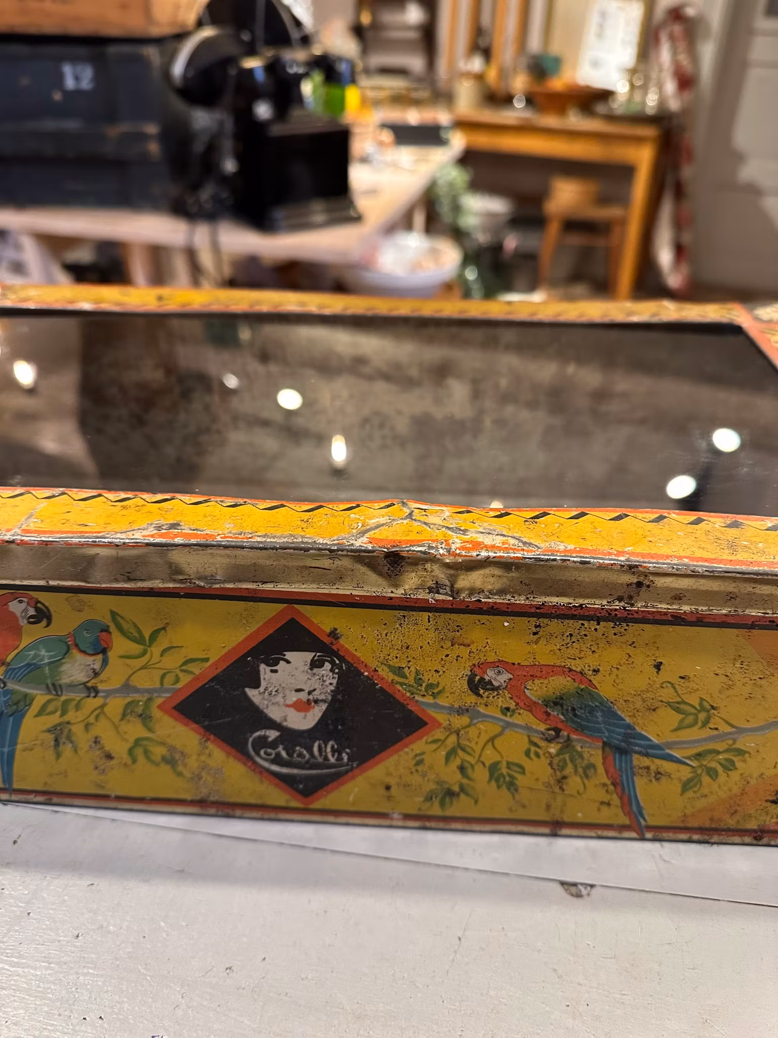 Underbar gammal plåtburk i ovanlig modell. Rektangulär med glas i locket. Märke Coralli. Nog innehållit choklad eller konfektyr en gång i tiden. Fint motiv med papegojor utanpå.
