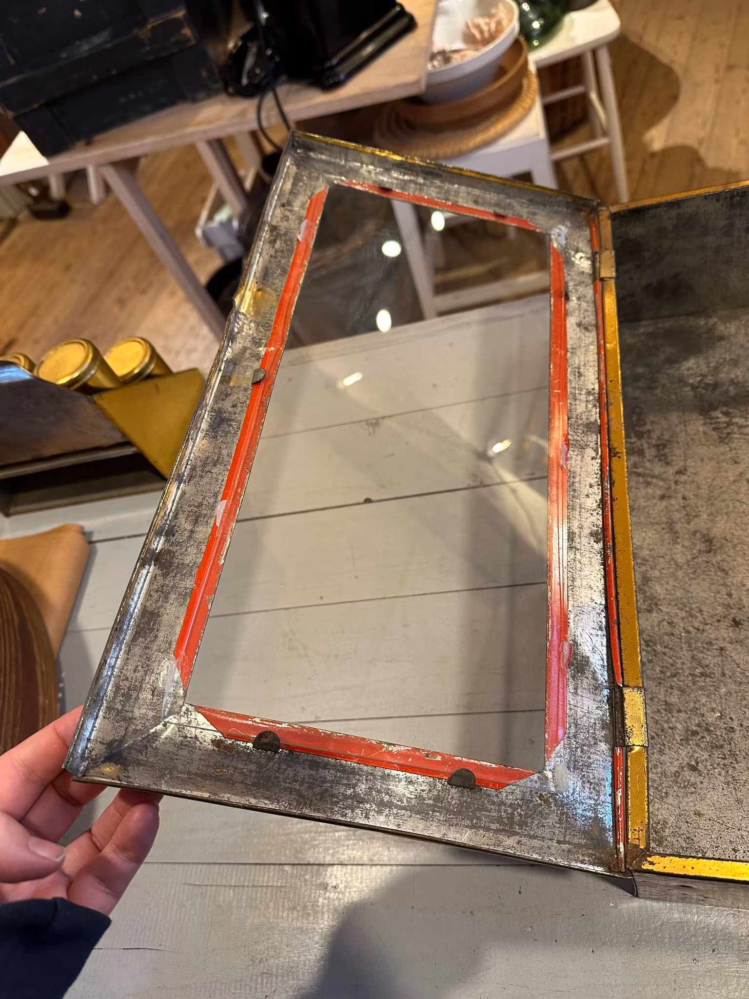 I gott använt och åldrat skick. Spår av användning och ålder finns över hela. Se bilder för skick. Glaset har vi satt dit nytt då det saknades när jag köpte burken. Några av de clipsen som håller glaset på plats har nötts av så vi har fäst det med lite silikon här och där så det hålls på plats. Burken är sliten och nött med fin patina över hela. Bucklor, skav och färgfläckar finns över hela.