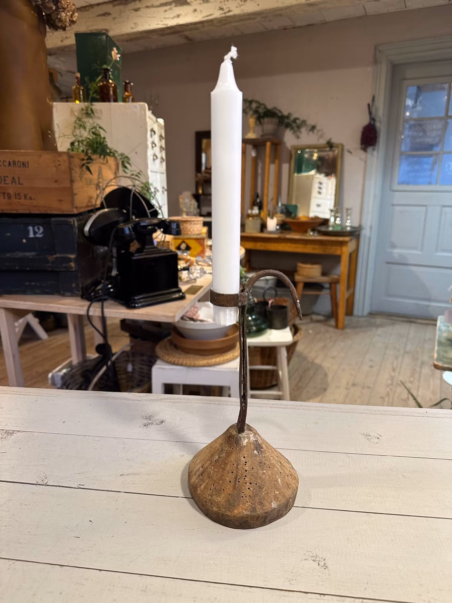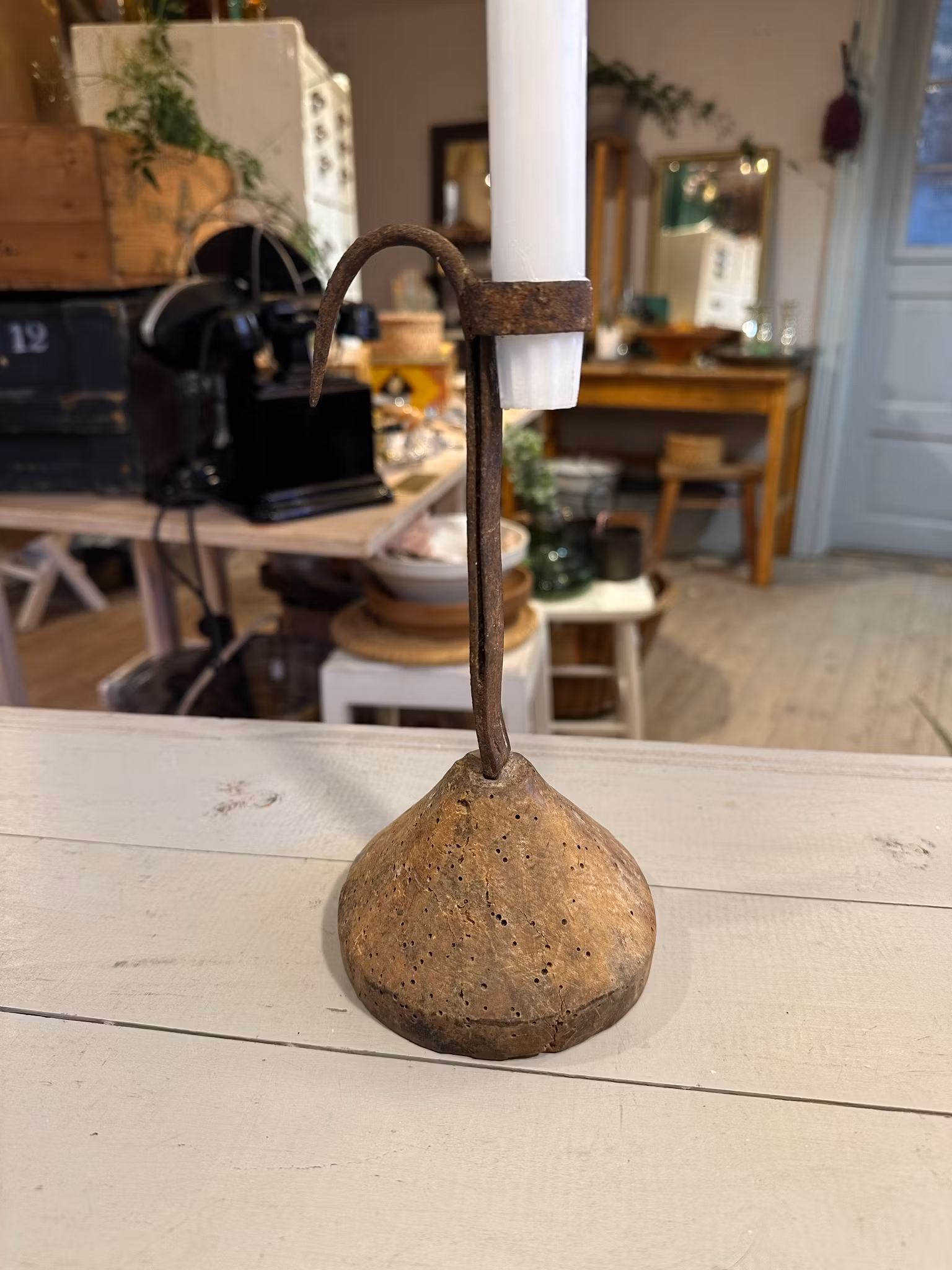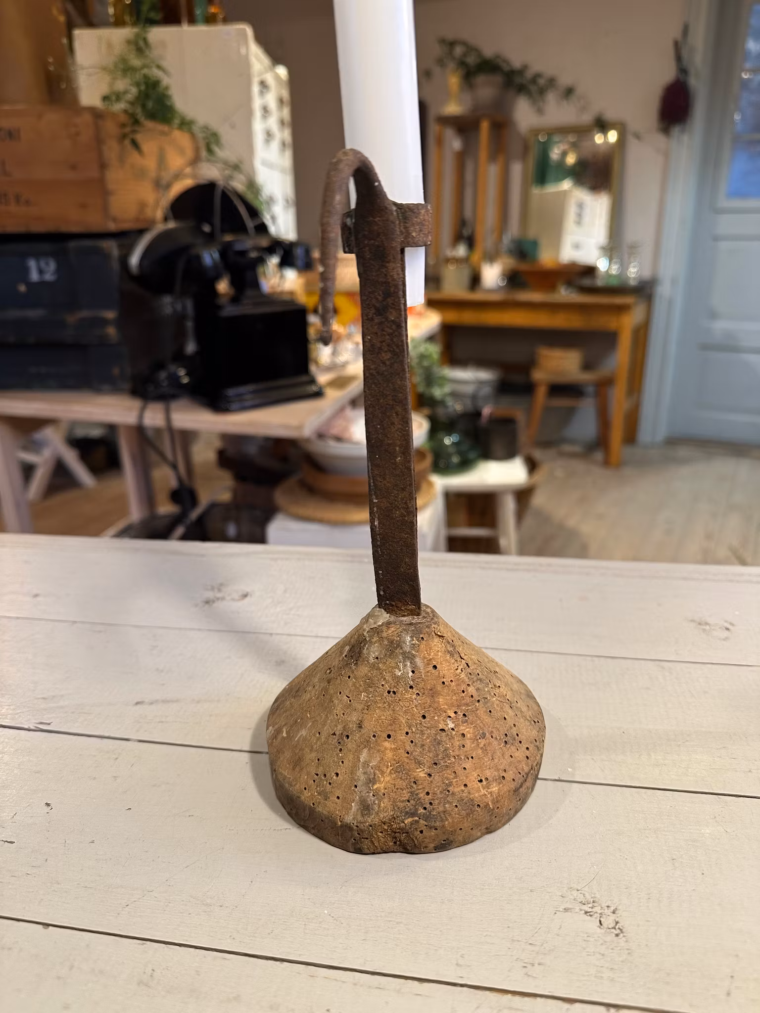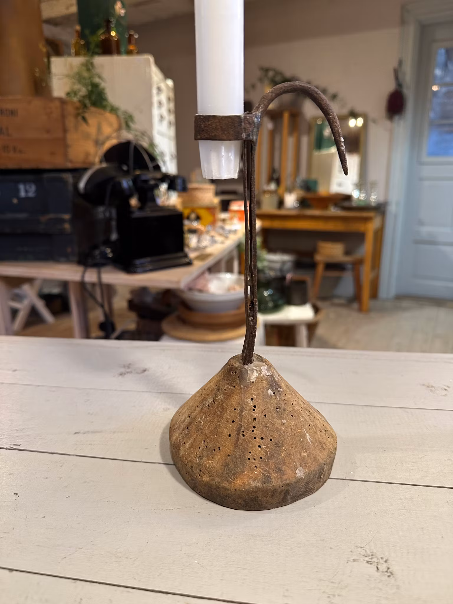 Underbar gammal stumpstake/ljusstake med bas i trä och ljushållare i järn.