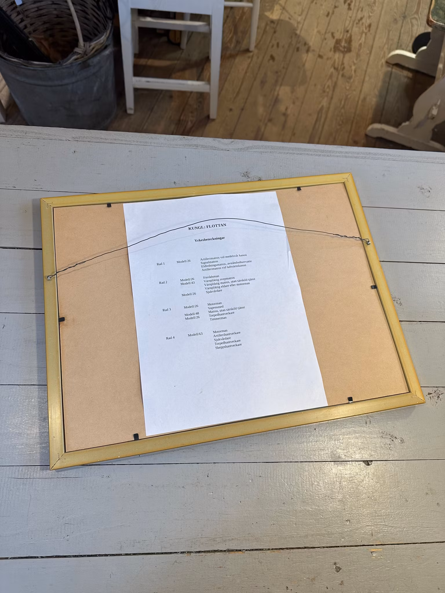 Fin tavla med olika yrkesbeteckningar från flottan. I gott använt och åldrat skick. Spår av användning över hela. Se bilder för skick. Mått ca 43*33cm.